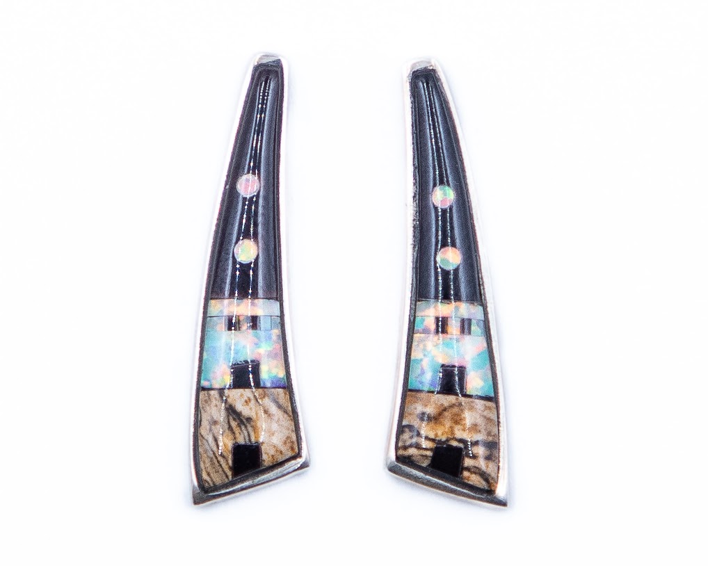Incredible Begay Picture Rock Synthetic Opal Onyx Inlay Earrings 3g