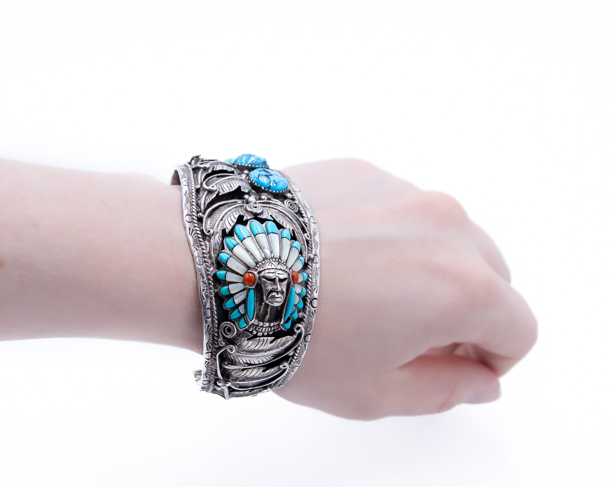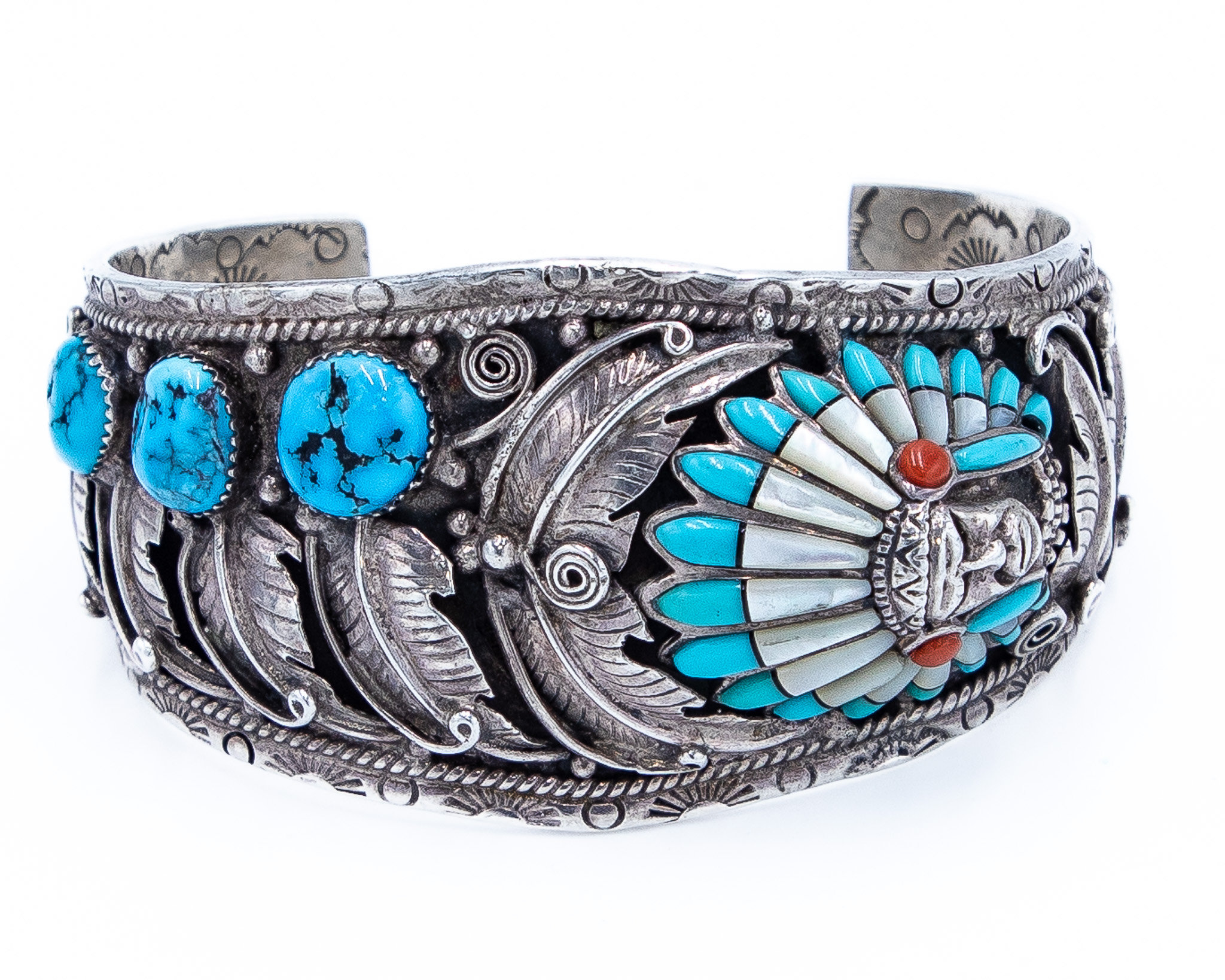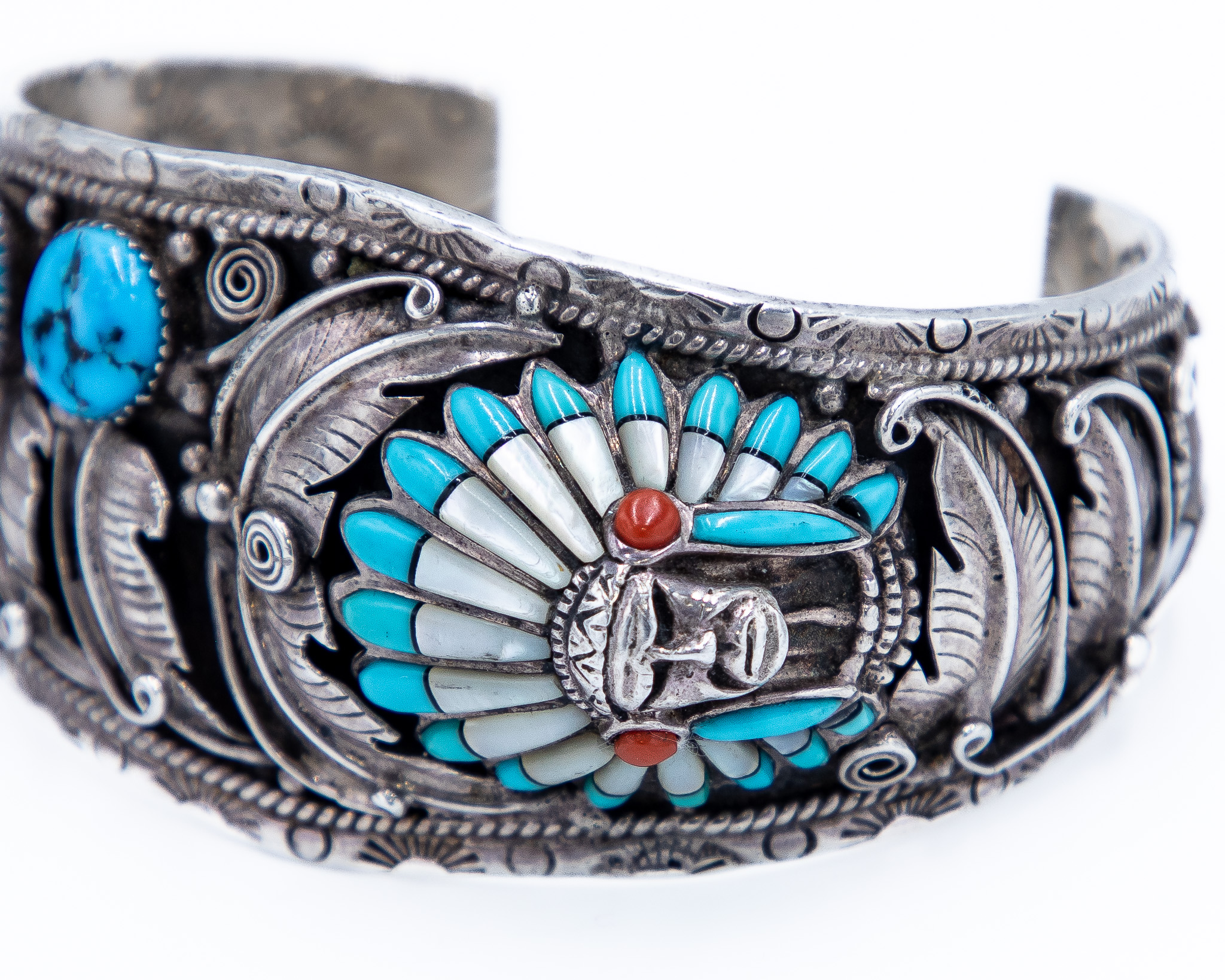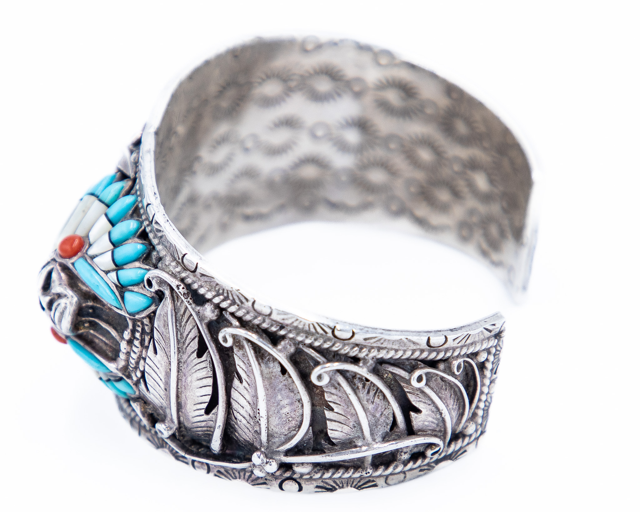 Signed HR Navajo Sterling Multi Stone Inlay Chief Cuff Bracelet