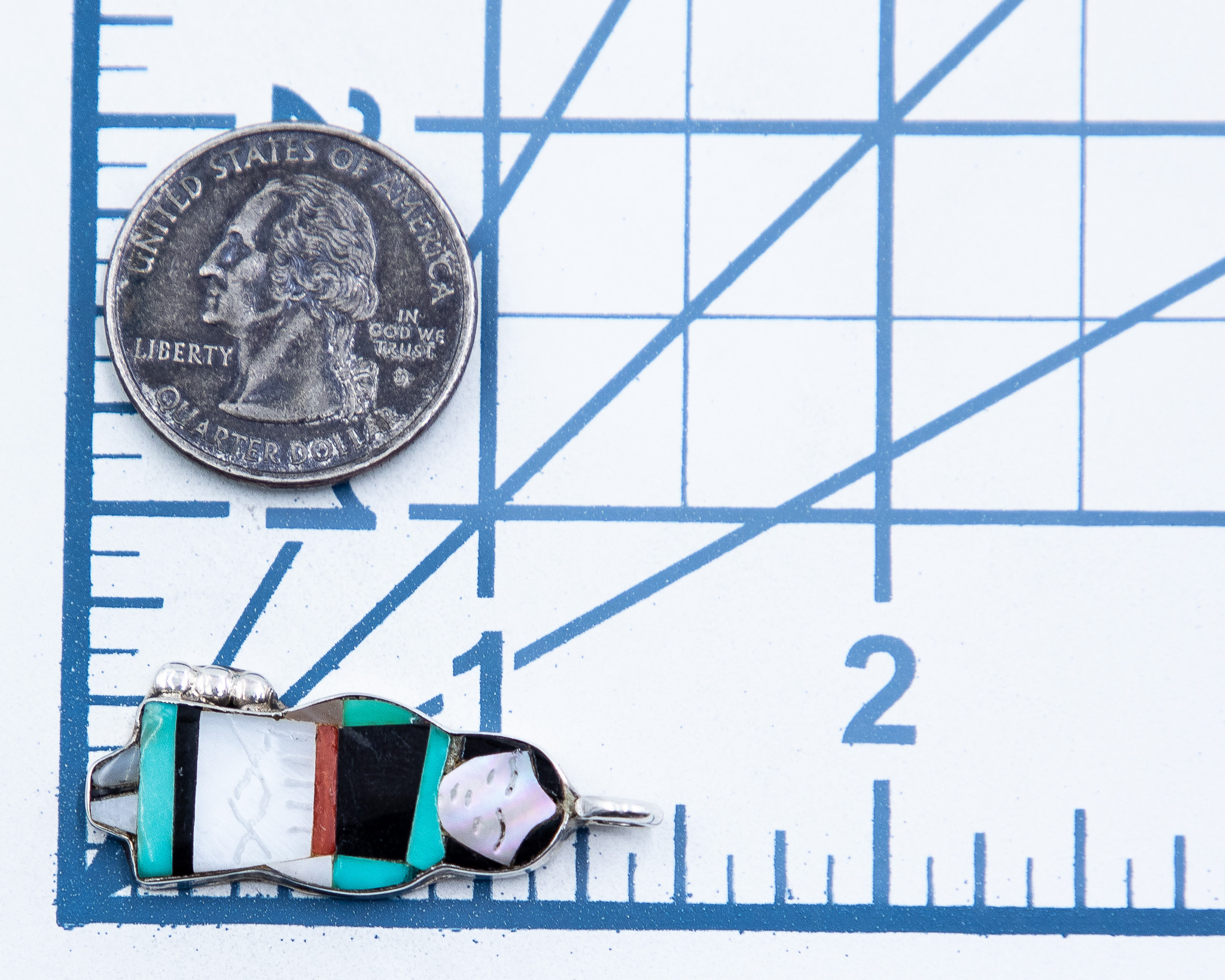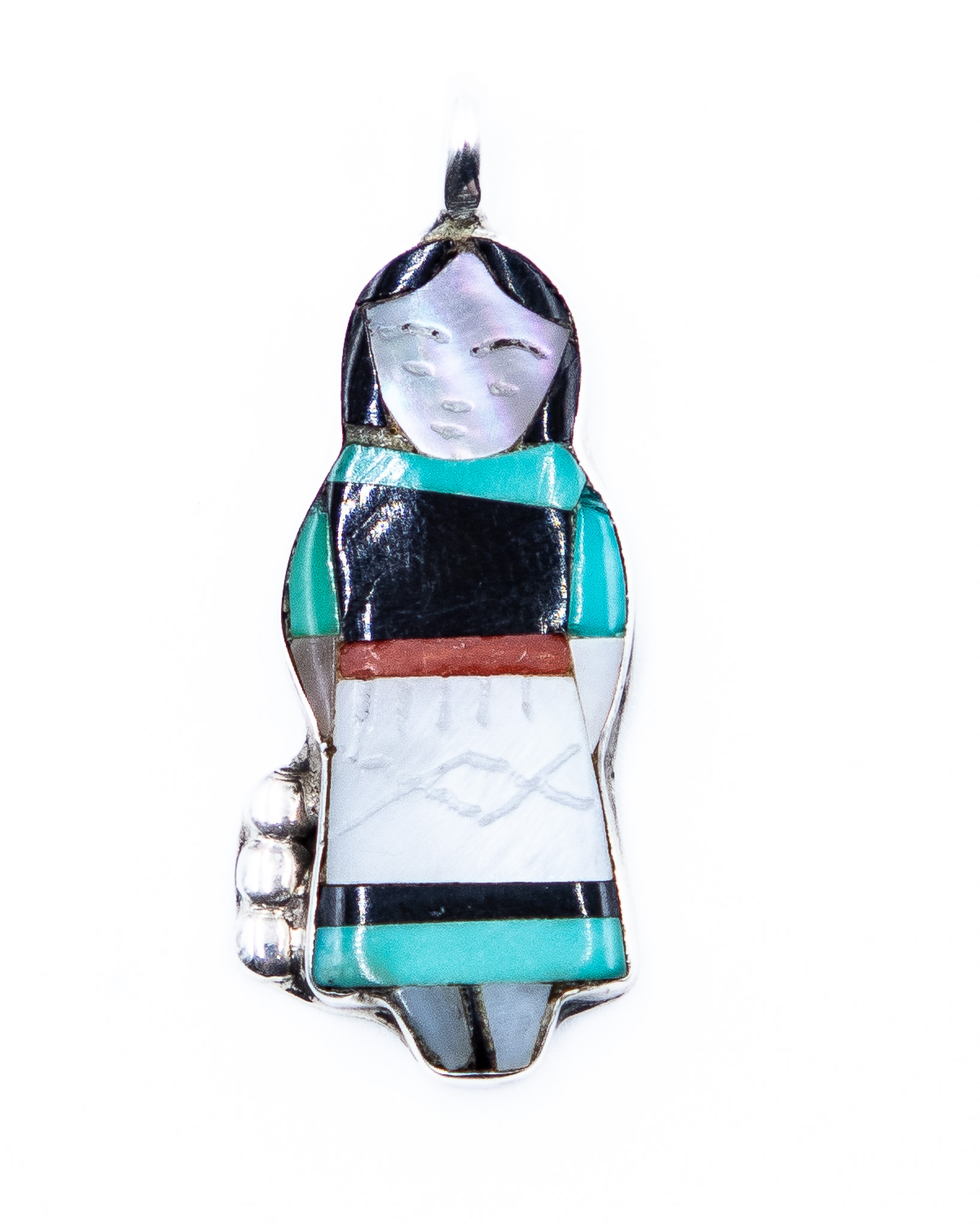 Joyce Waseta Zuni Sterling Inlay Maiden Pendant 4g-Onyx, Turquoise, Mother of Pearl, Coral