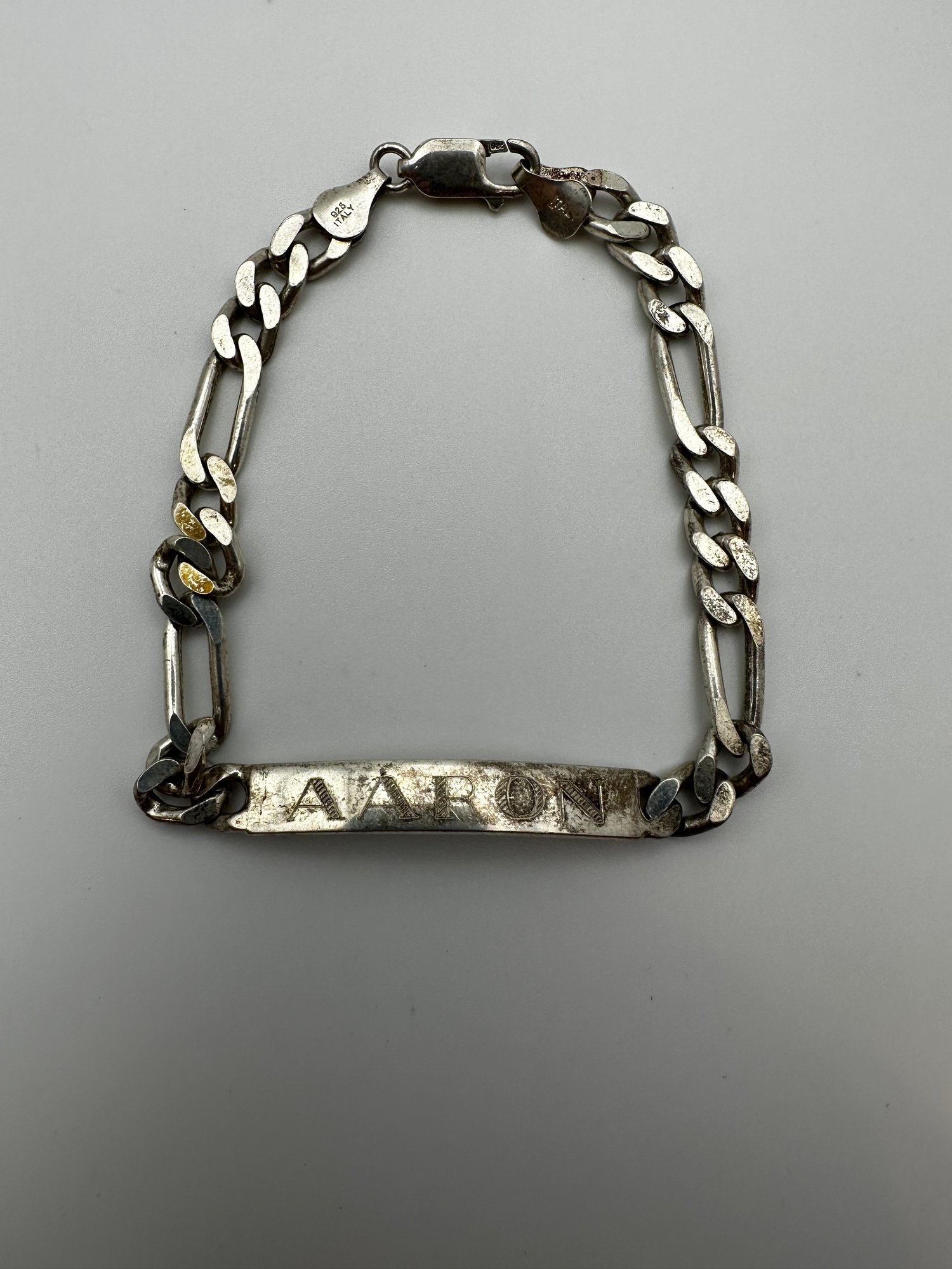 Italy-Sterling Silver Figaro chain with name plate “AARON” 17.0g slightly bent link by clasp