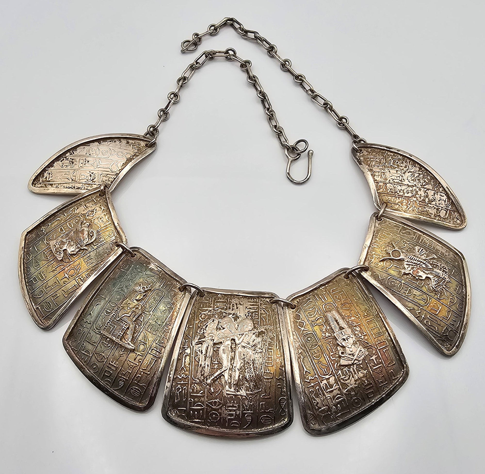 Stamped sterling Silver Egyptian Revival panel necklace 72.6 g