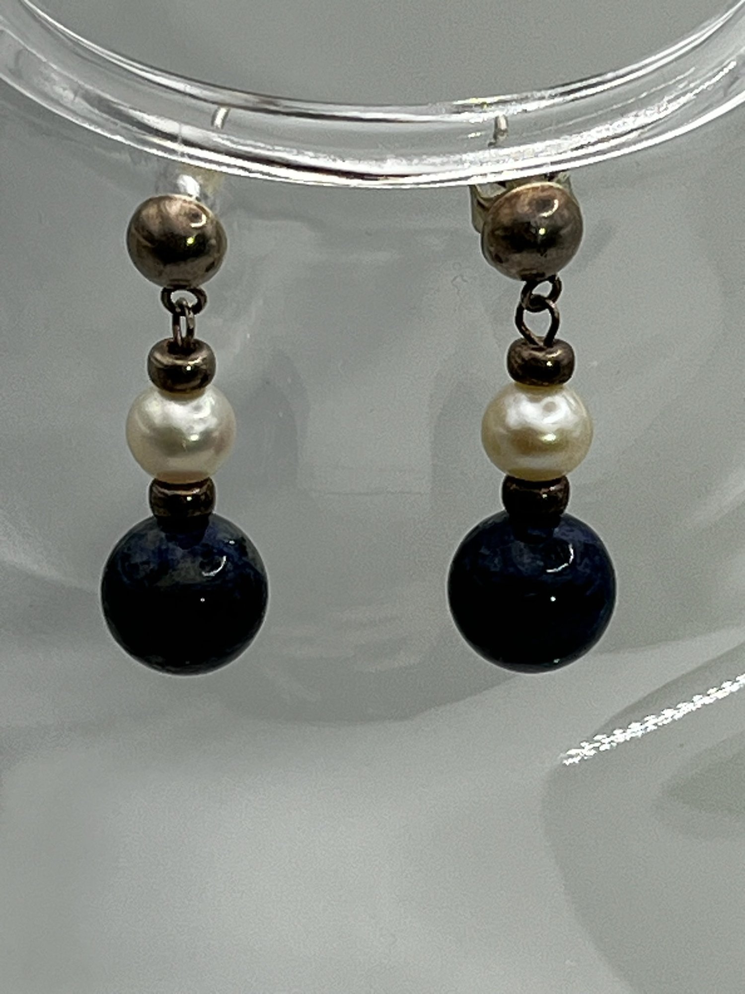 Sterling Earrings With Pearl & Navy Stones 5.22g