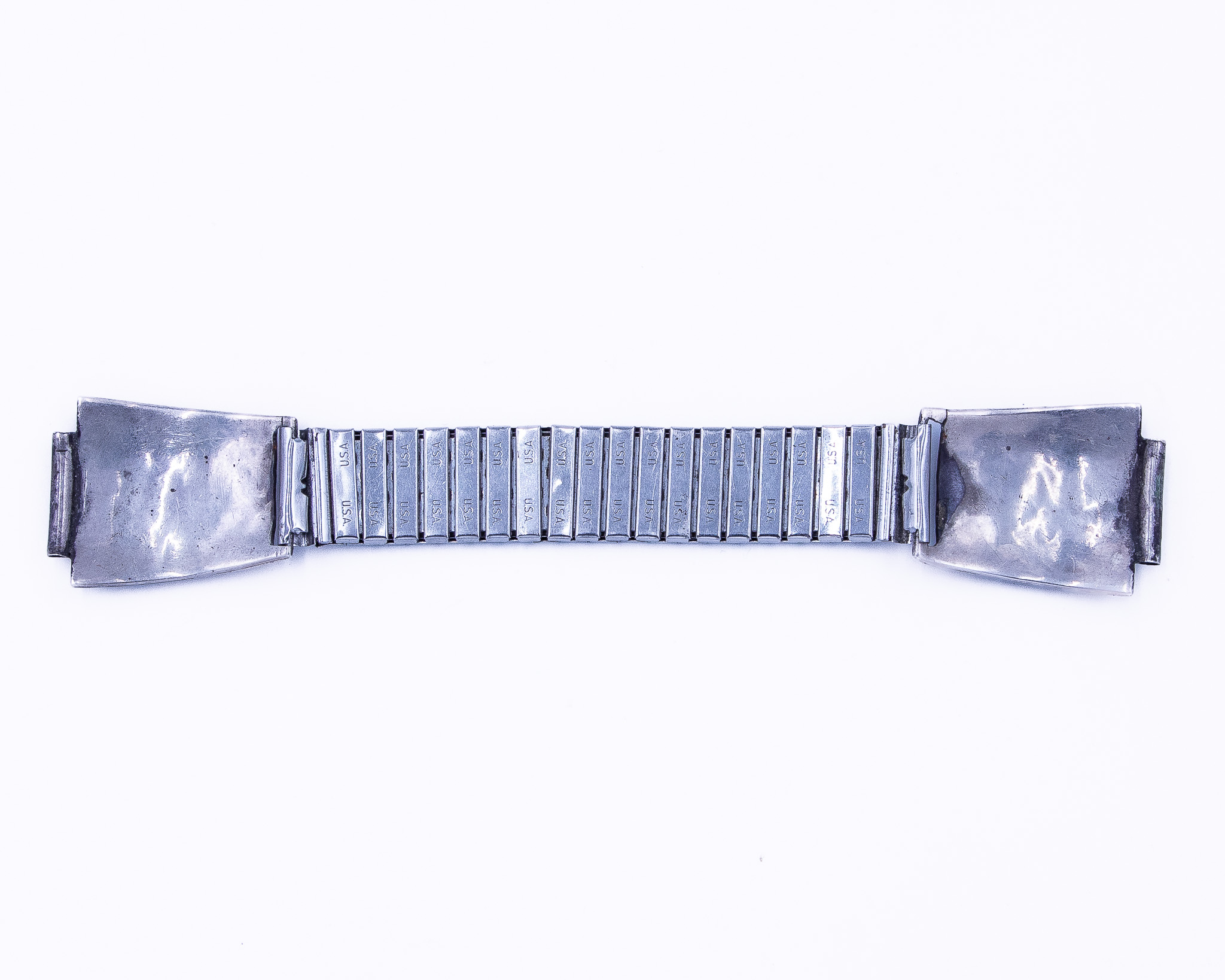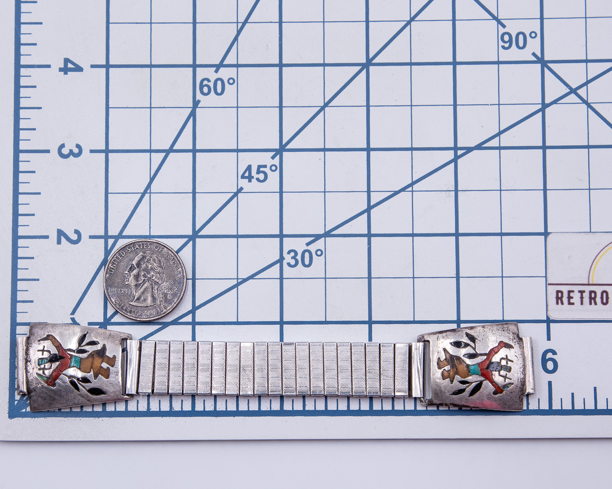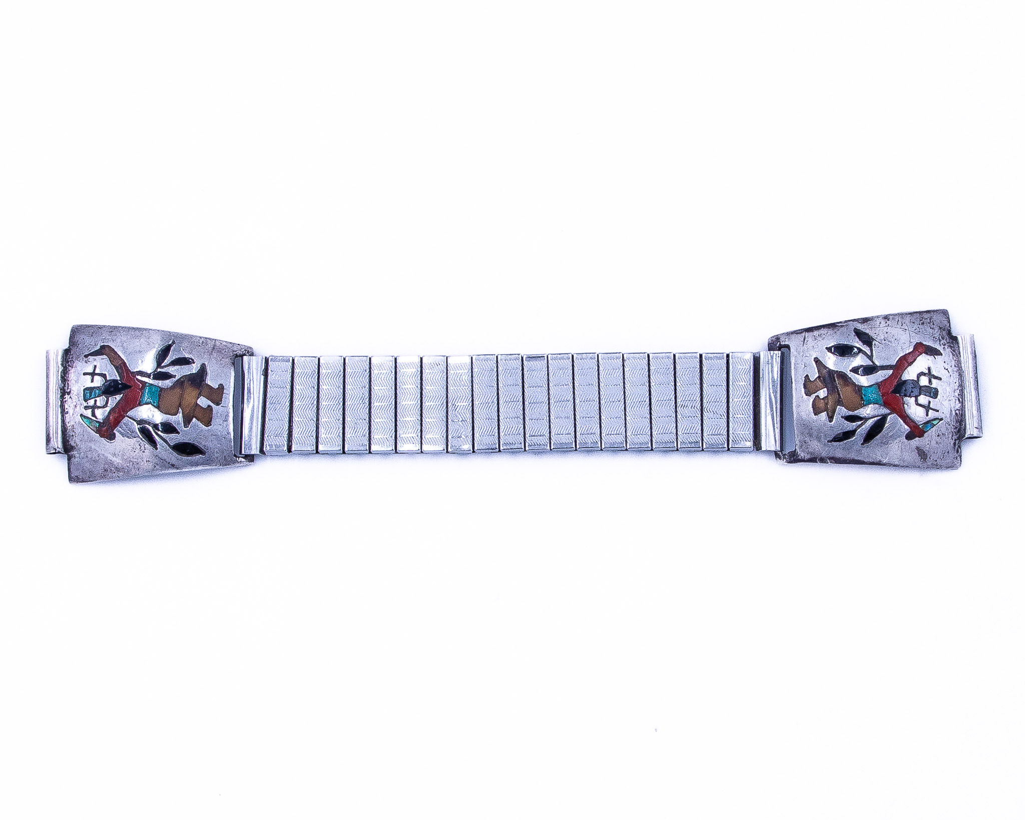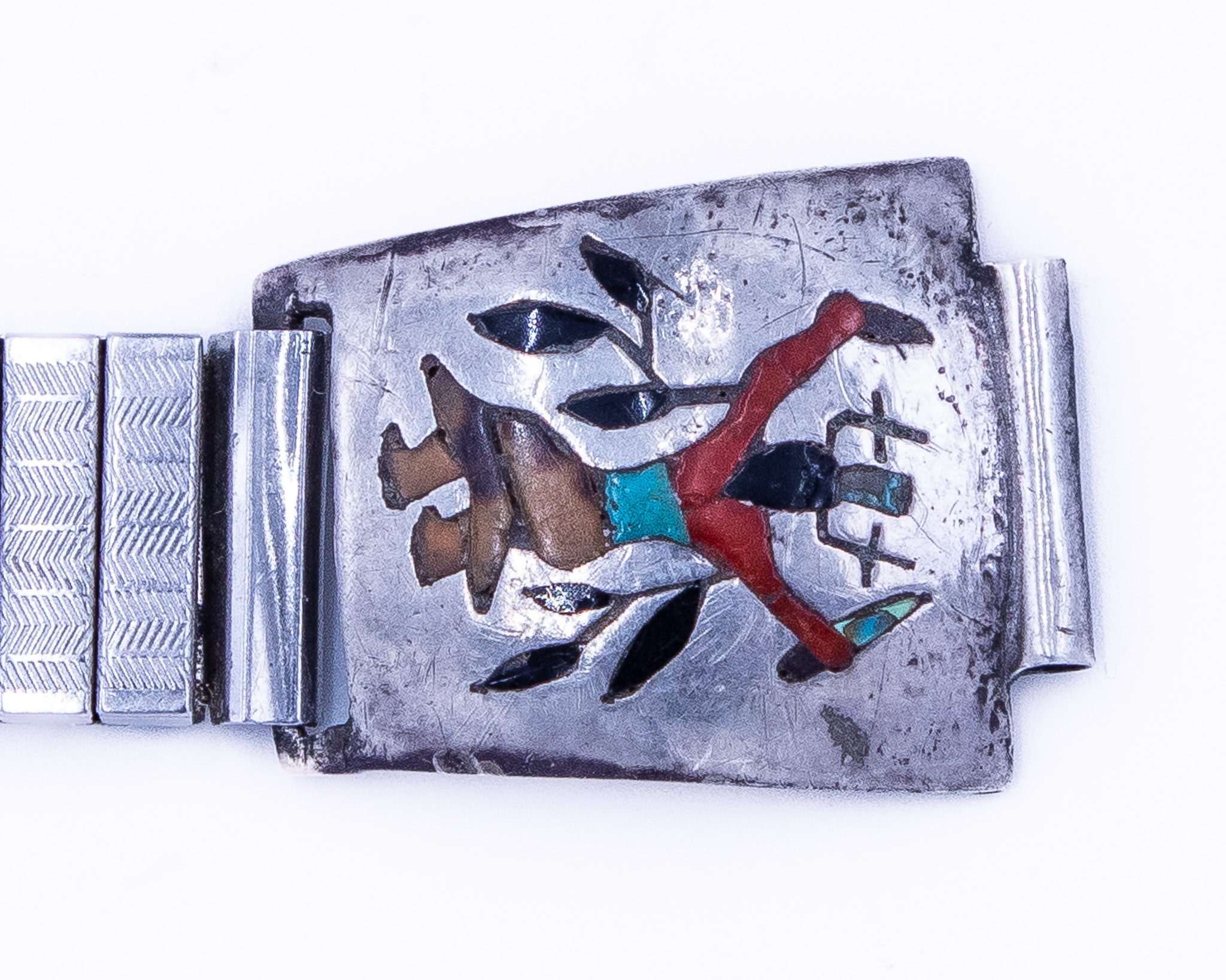 Vintage Zuni Multi Stone Sterling Inlay Kokopelli Watch Nibs And Steel Band 31.5g-Brown Agate, Coral, Turquoise, Coral, Onyx