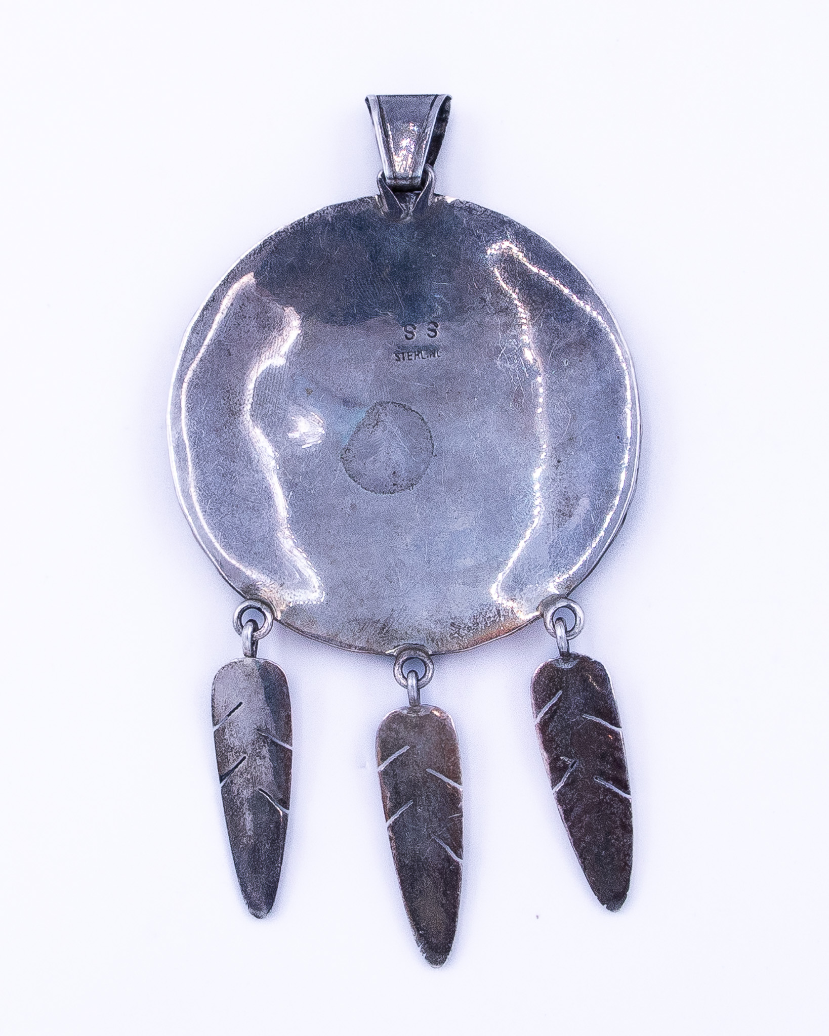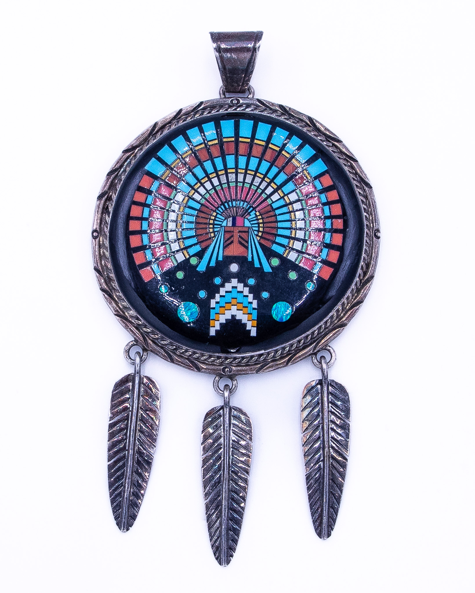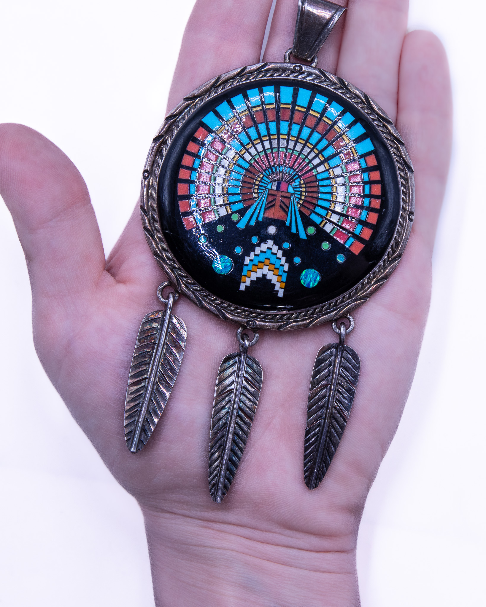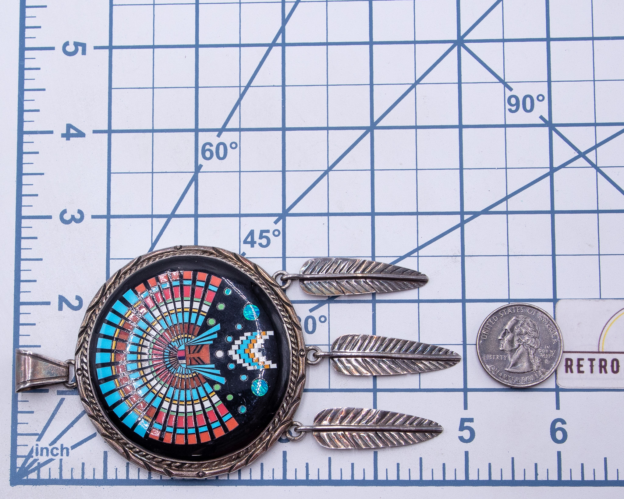 Silver Star Jewelry Huge Multi Stone Sterling Micro Inlay Yei Pendant 58g-Onyx, Turquoise, Coral, Spiny Oyster, Opal