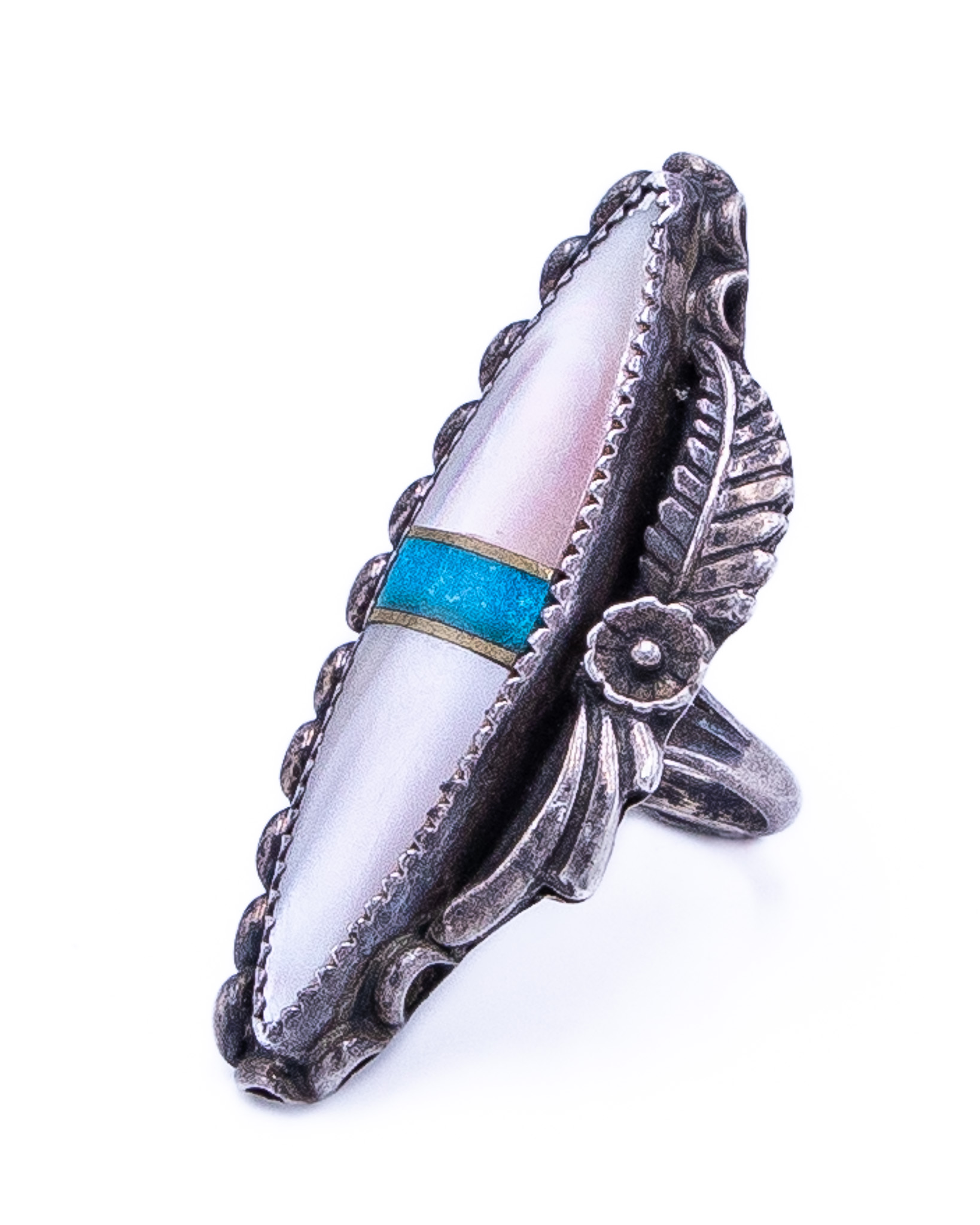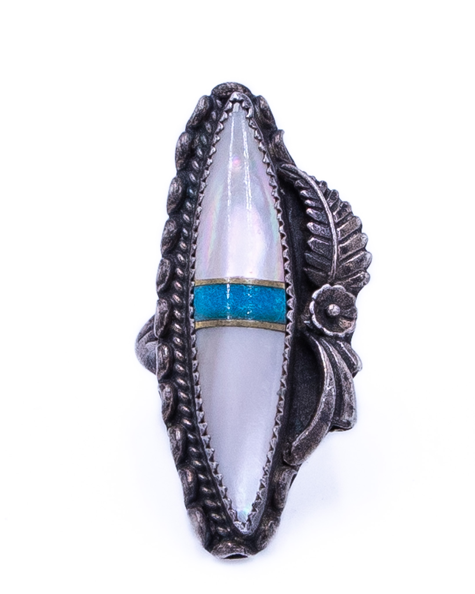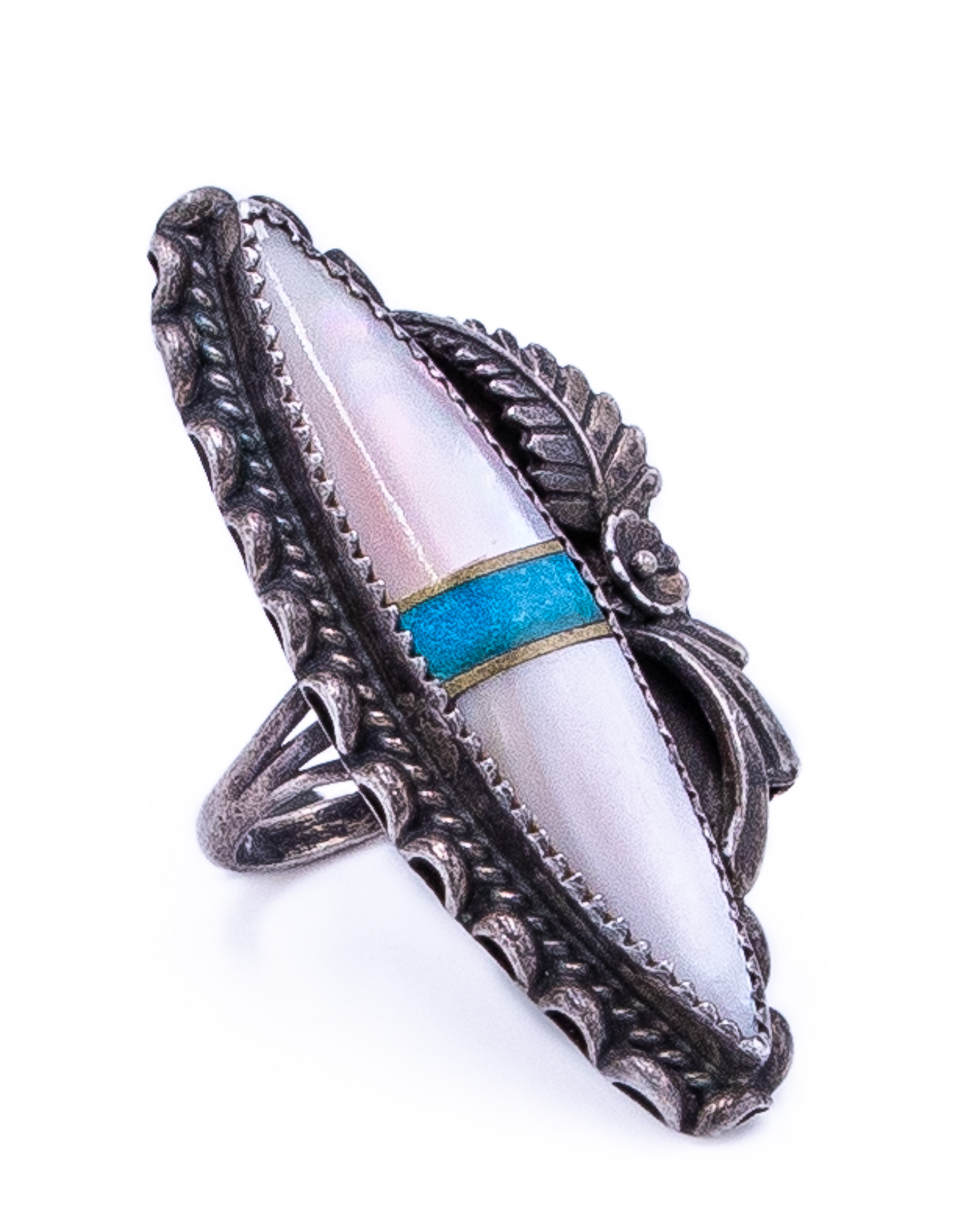 Vintage Zuni Mother Of Pearl Turquoise Sterling Inlay Ring Sz 7, 9.5g
