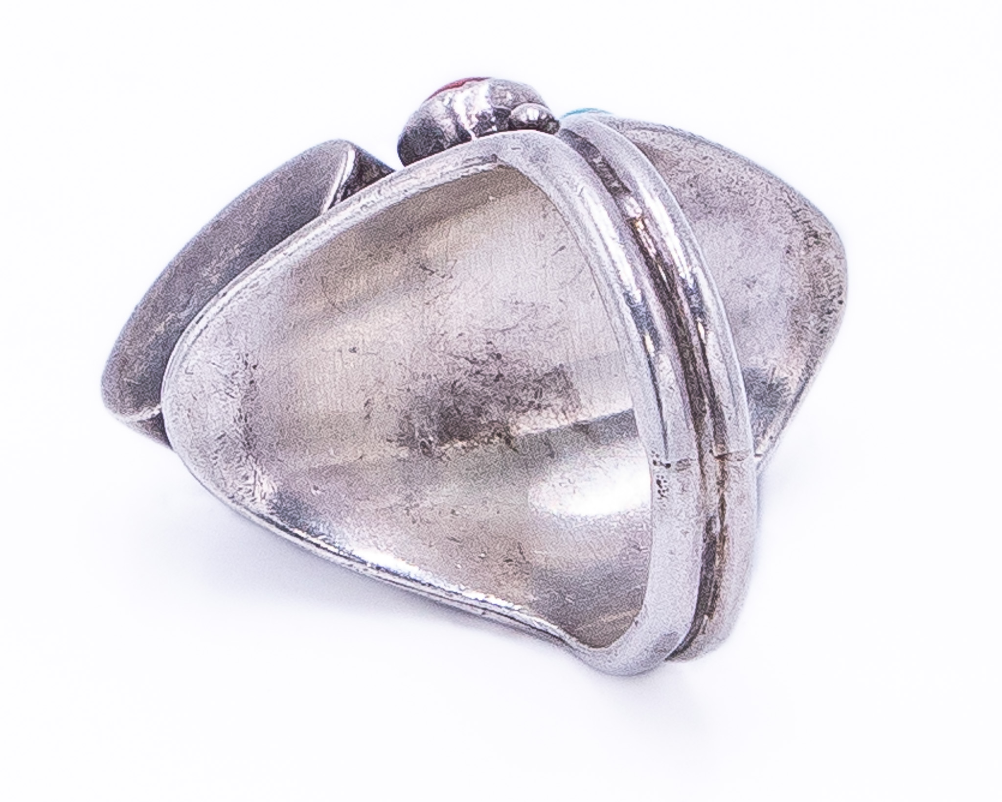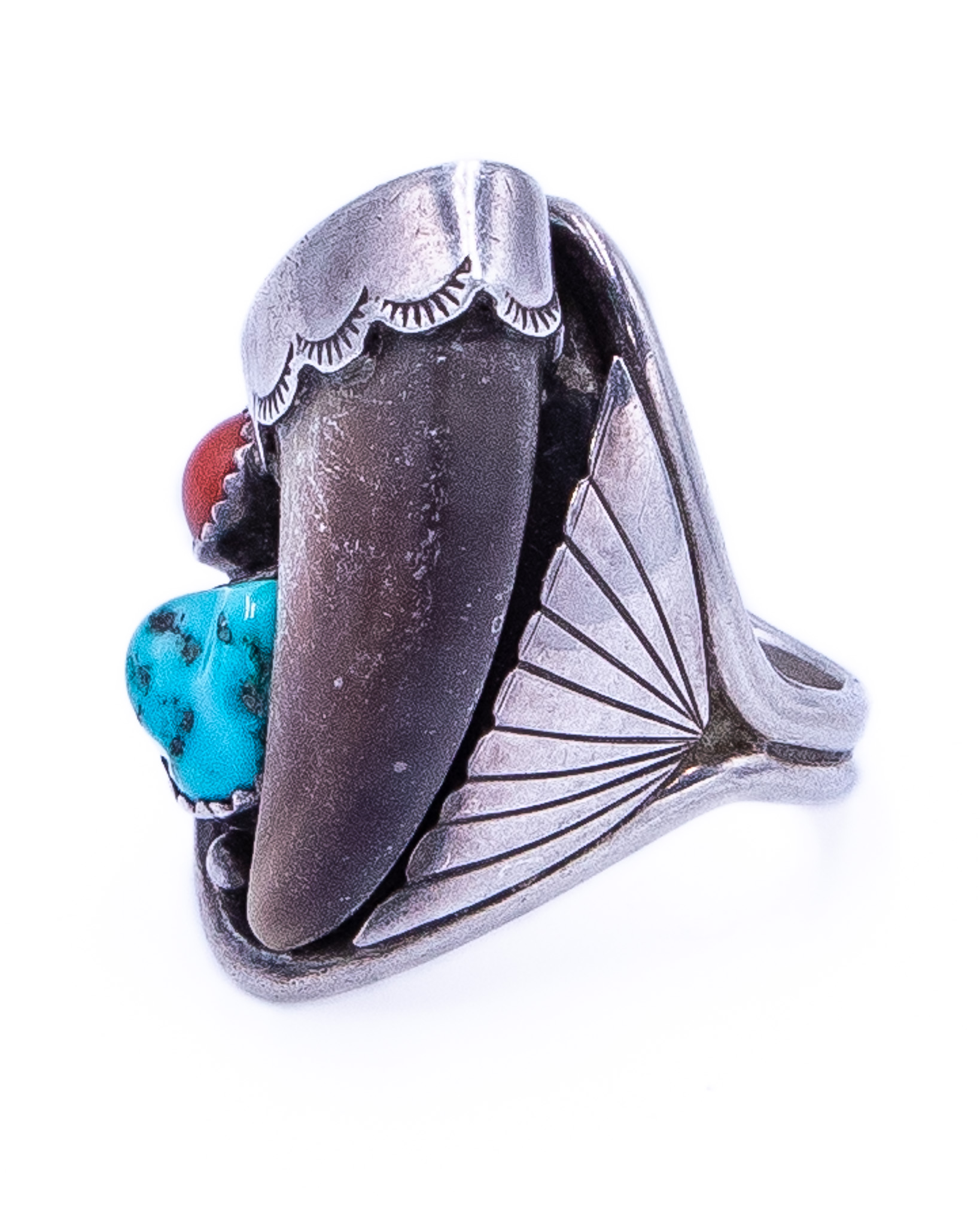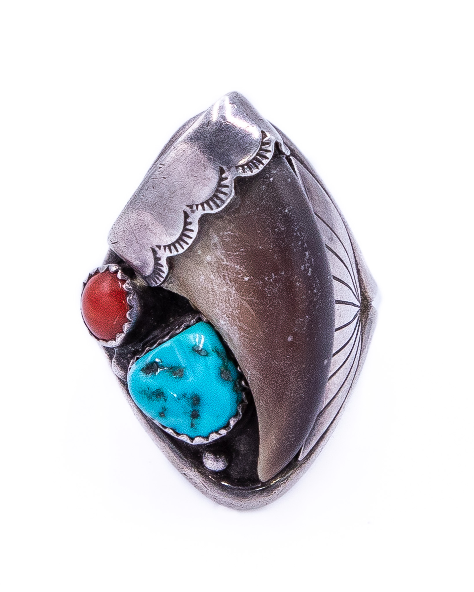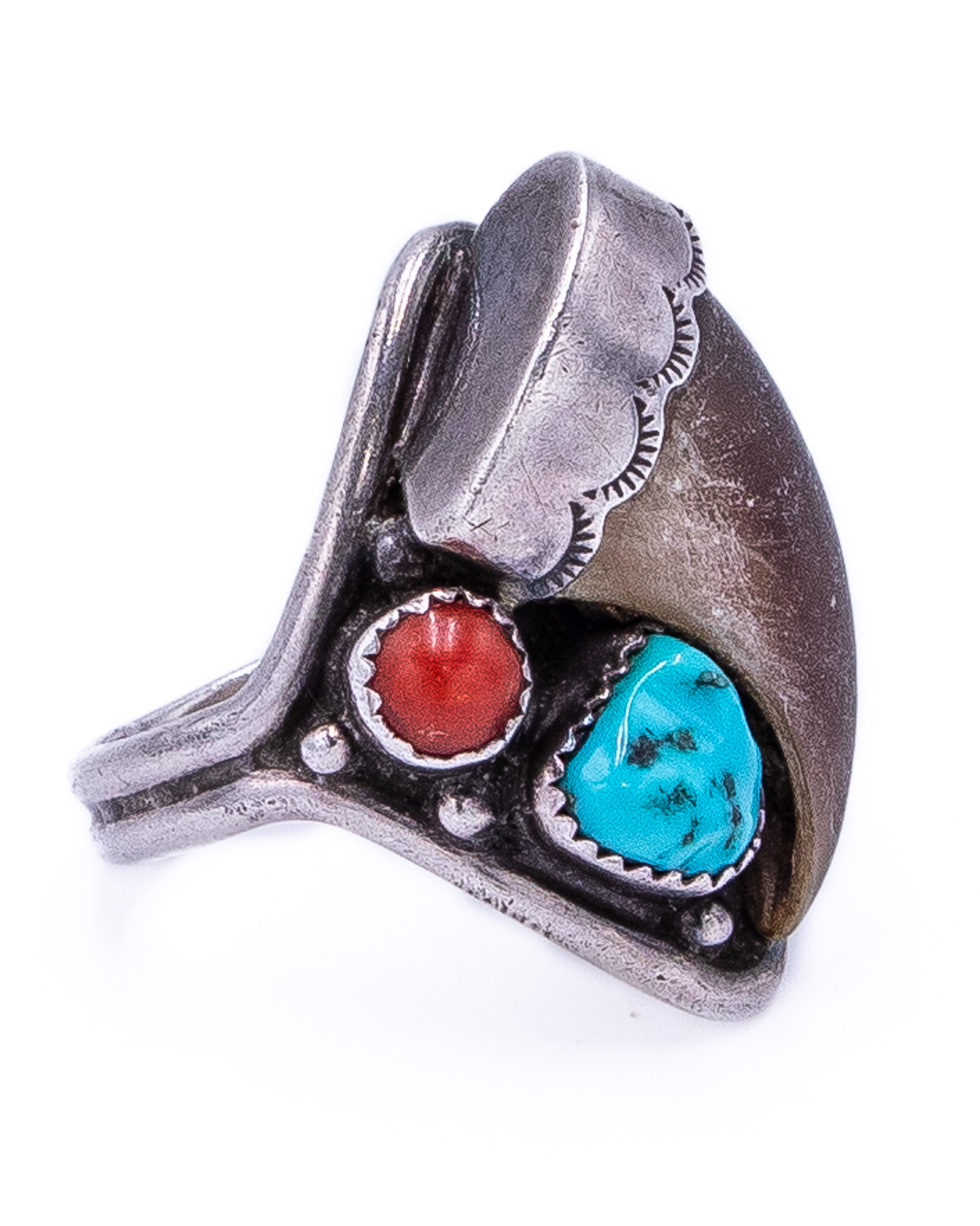 Vintage Navajo Turquoise Coral Bear Claw Sterling Ring Sz 11.75, 14g
