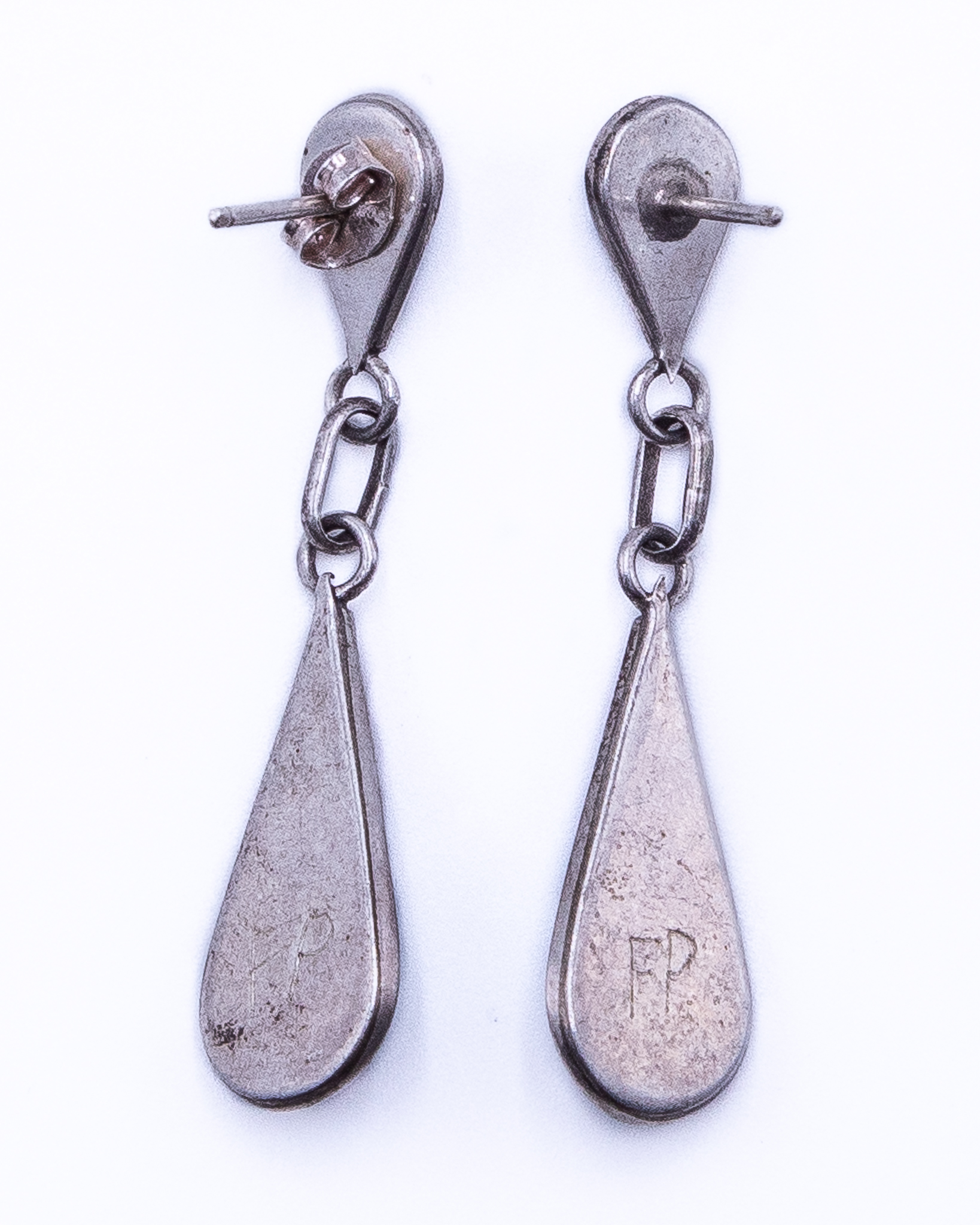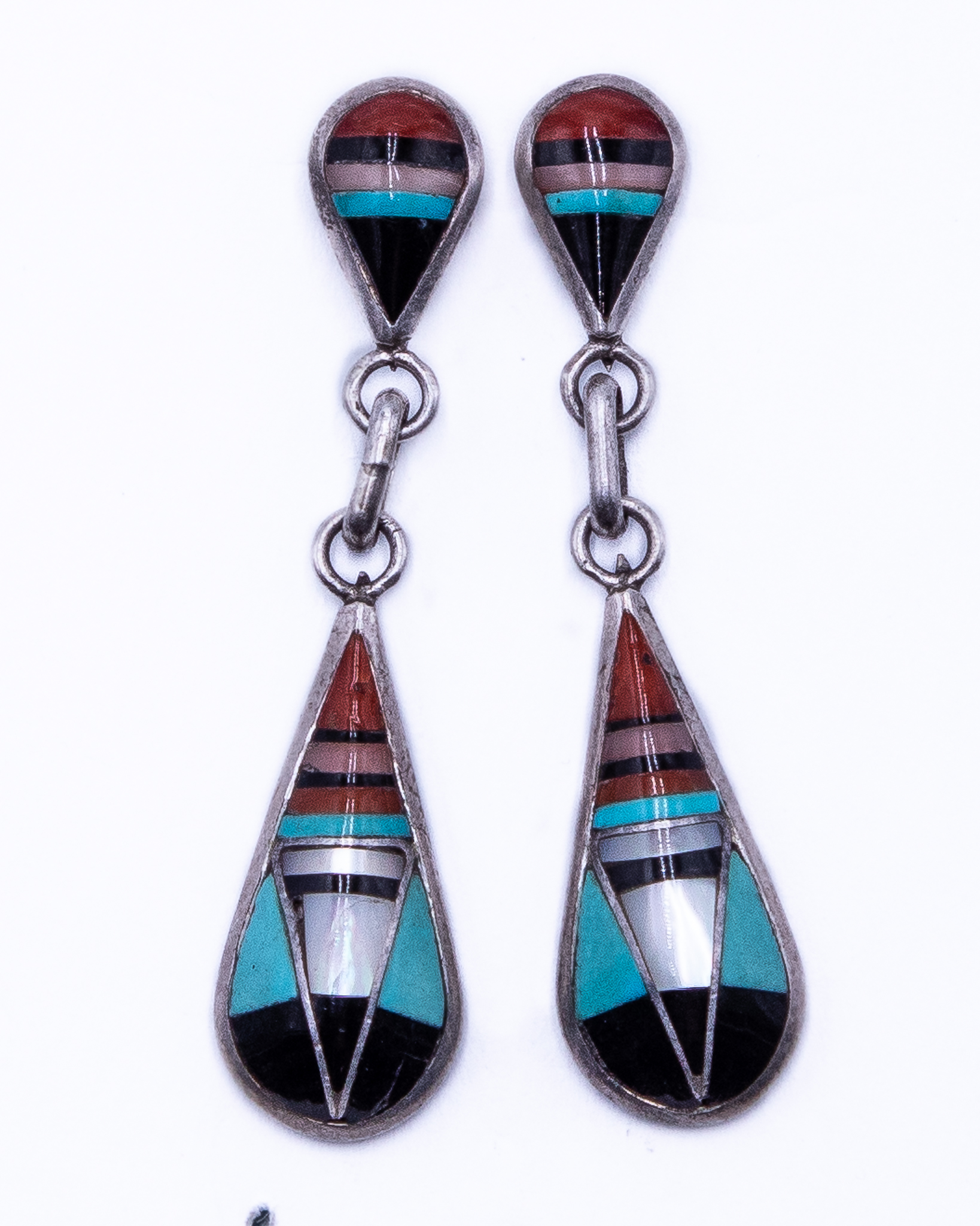 Signed FP Zuni Multi Stone Sterling Inlay Dangle Earrings