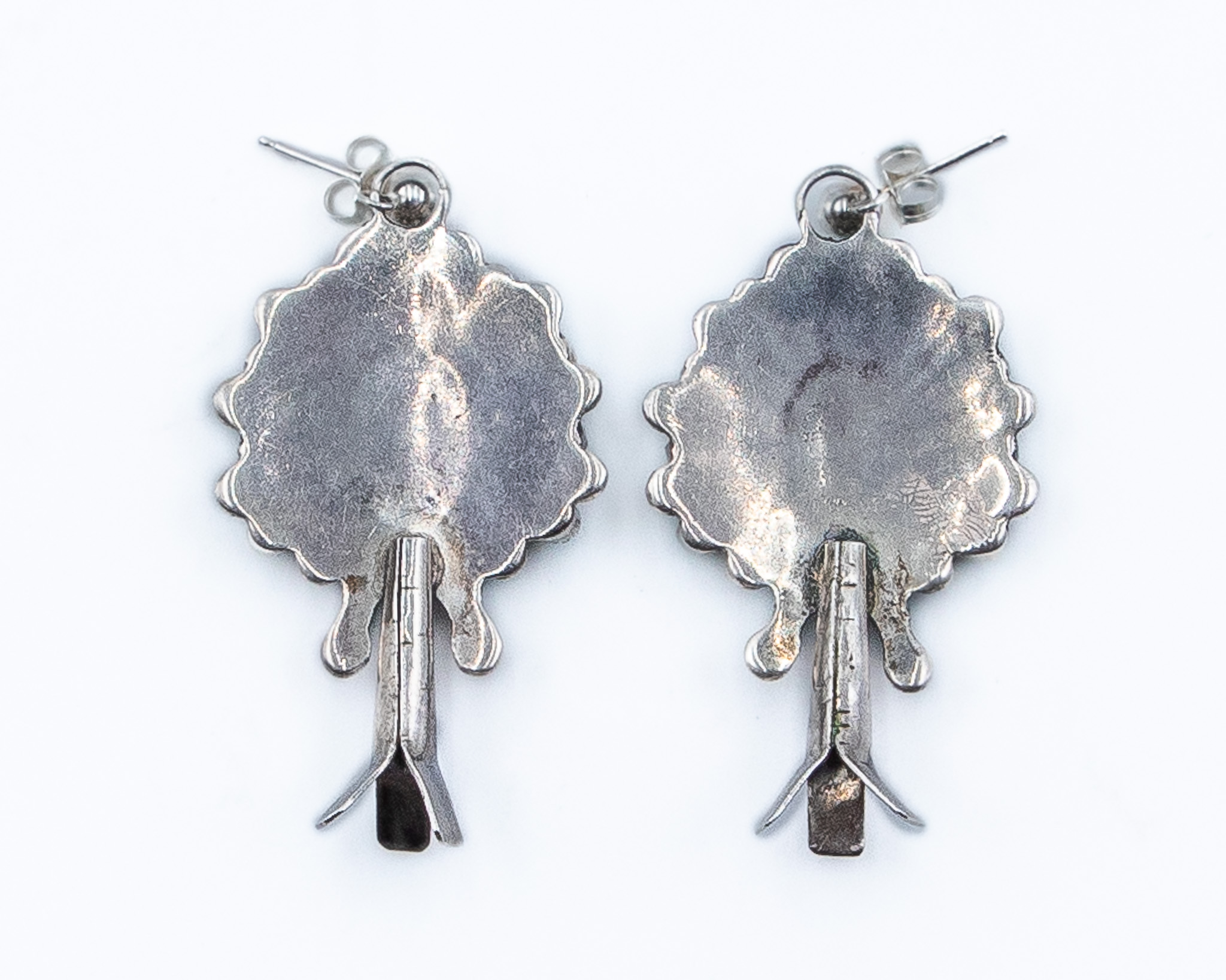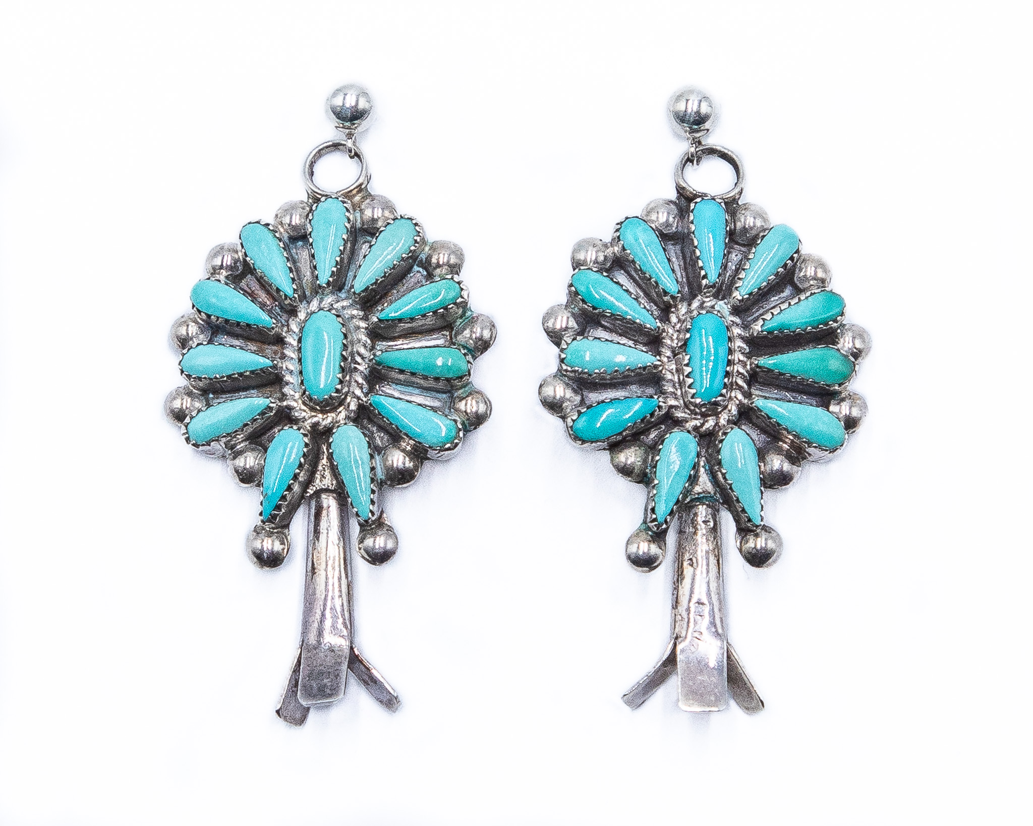 J Wallace Zuni Petit Point Turquoise Sterling Squash Blossom Earrings 11g