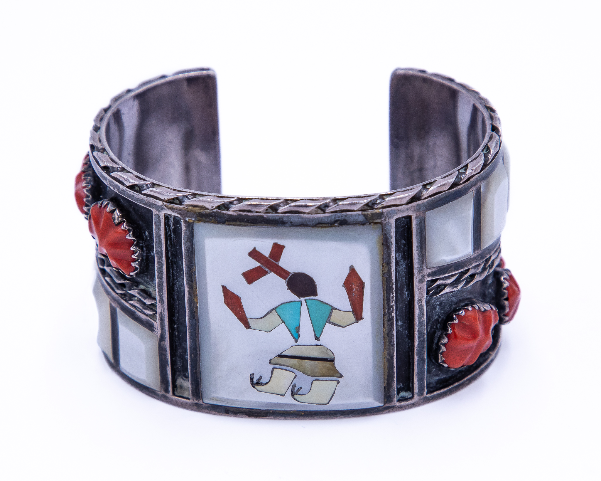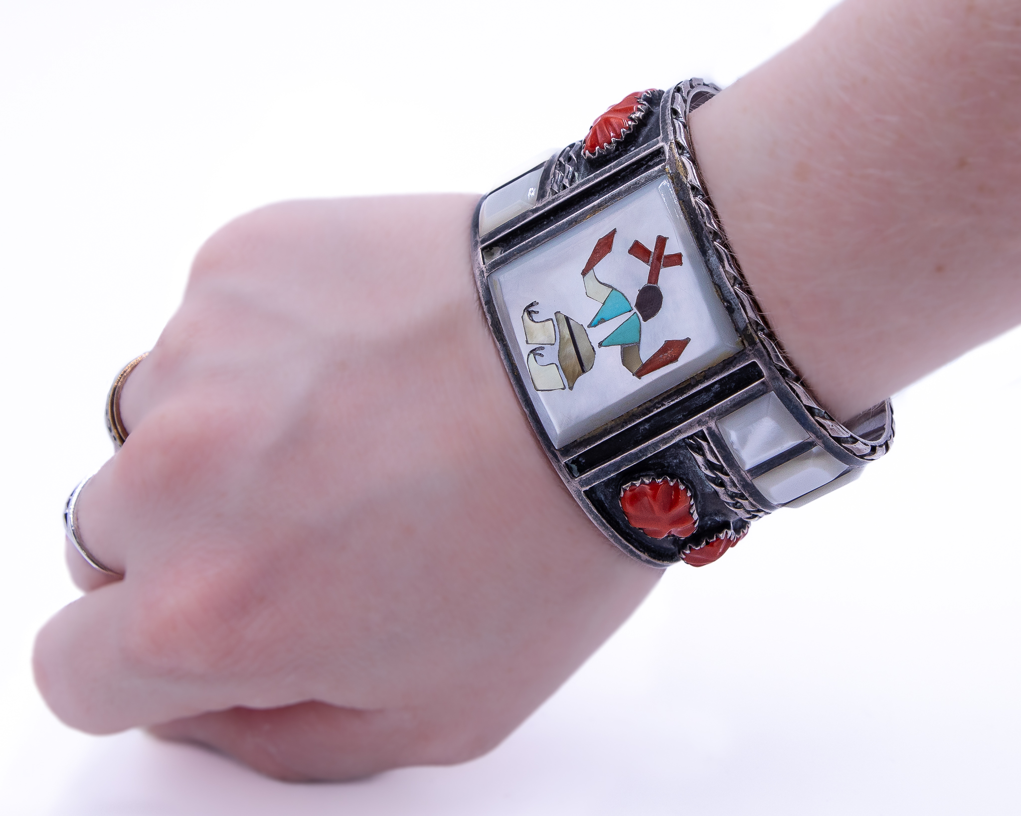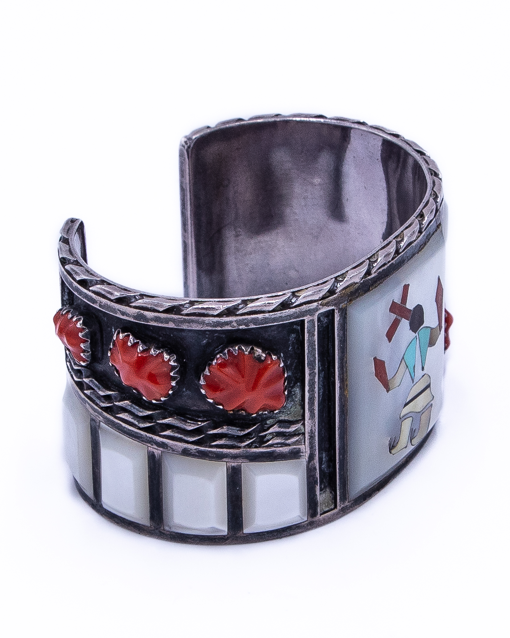 Frank Panteah Zuni Multi Stone Sterling Kachina Cuff Bracelet 96g-Mother of Pearl, Turquoise, Coral, Onyx