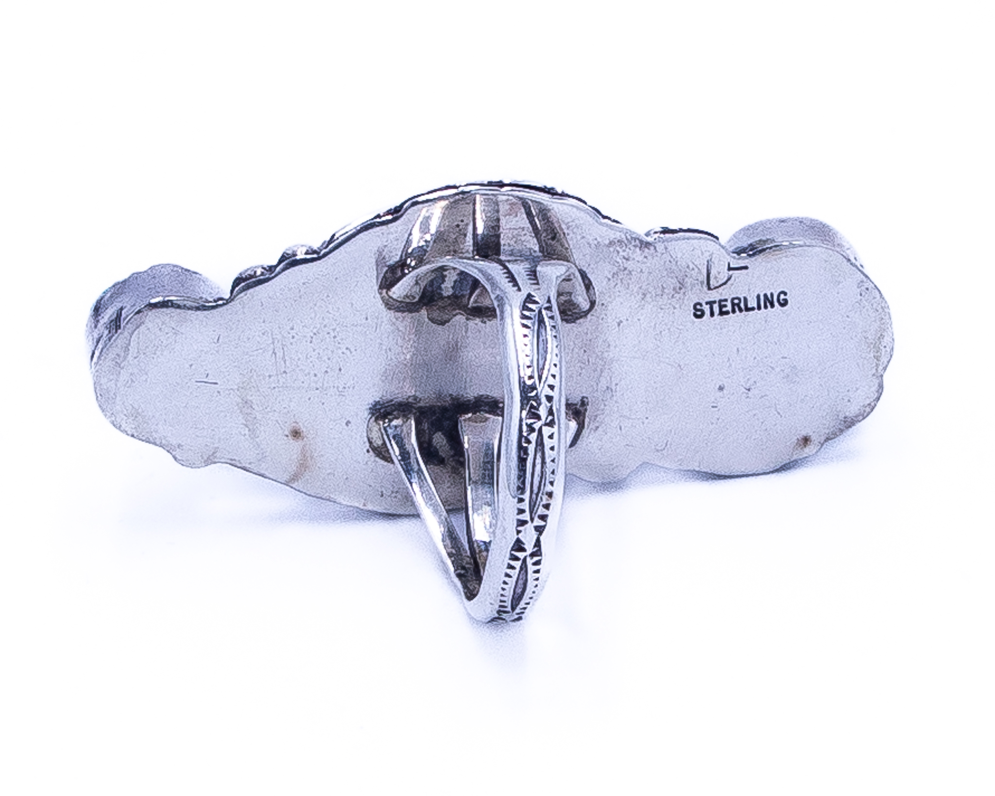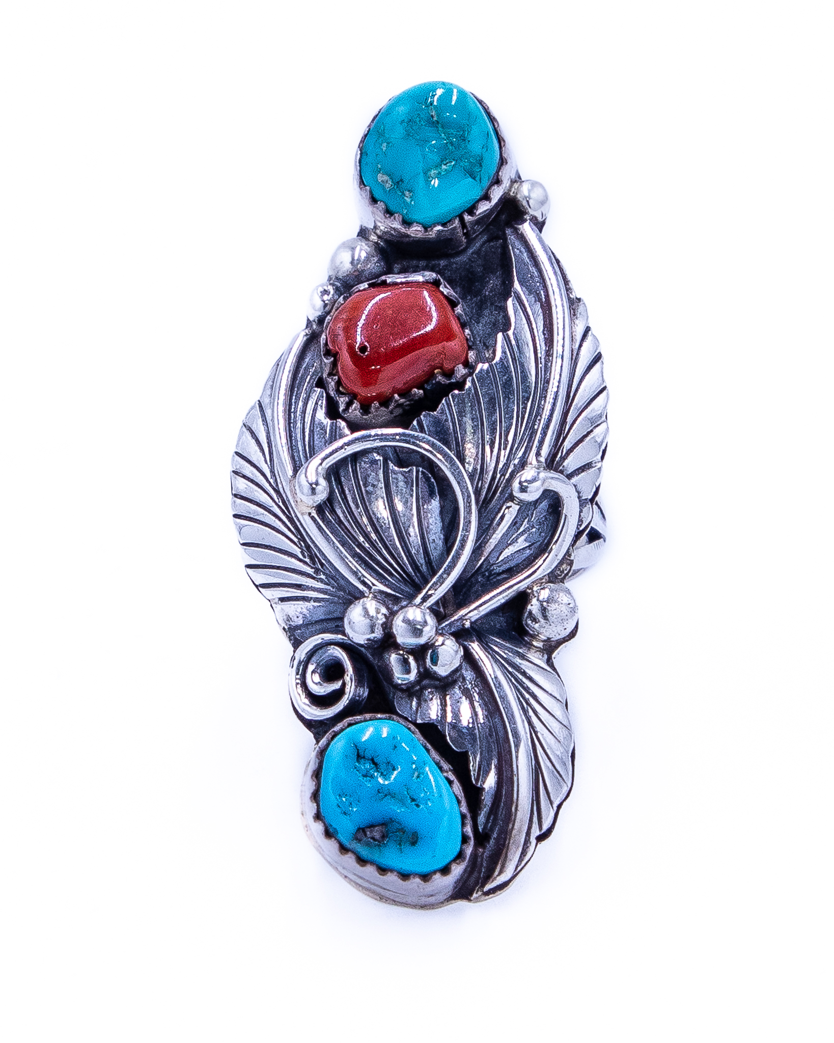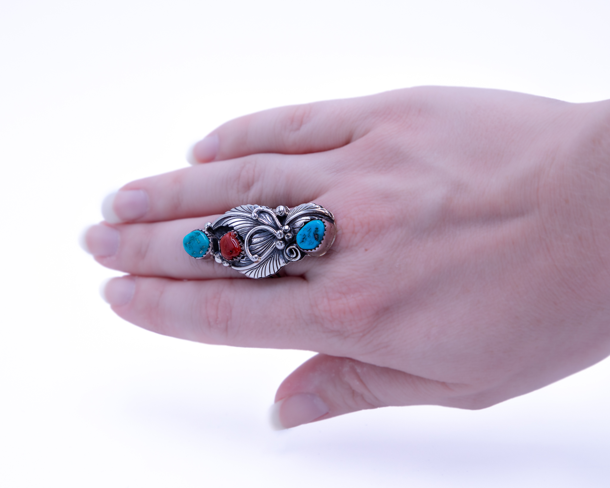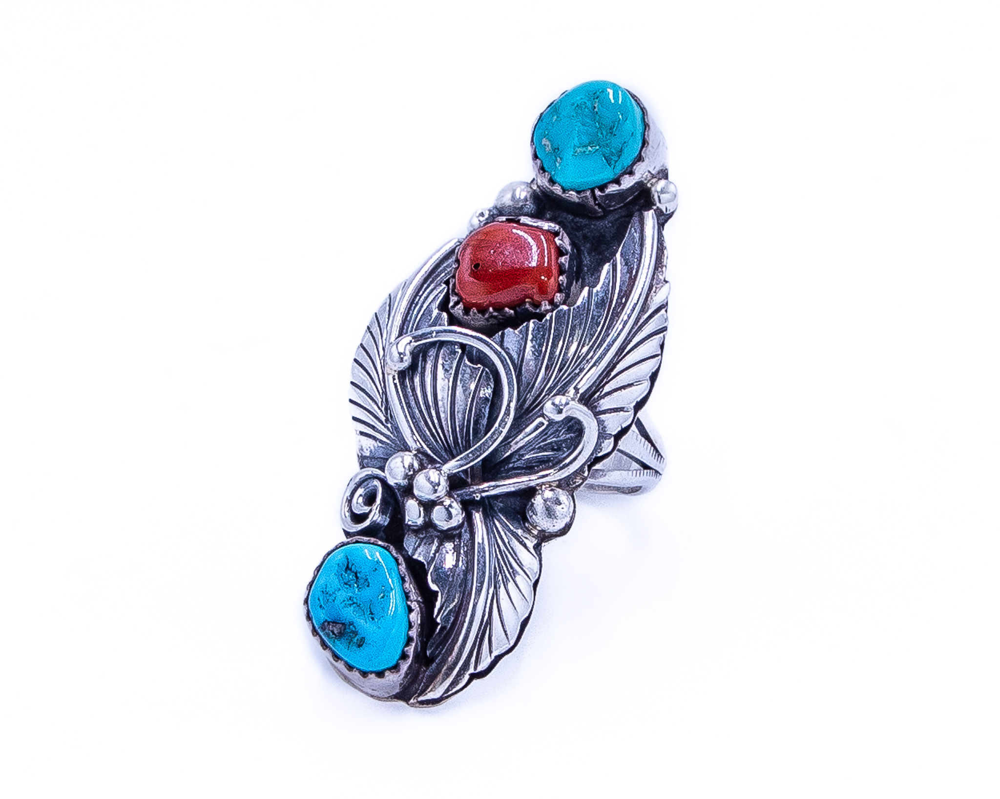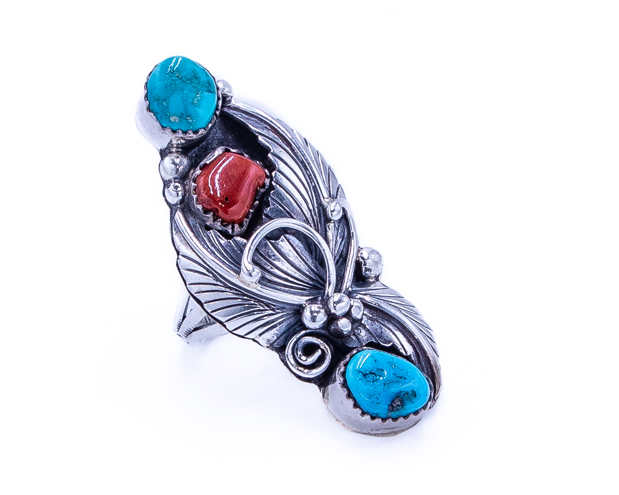 Signed DL Navajo Turquoise Coral Sterling Ring Sz 7.5, 11g