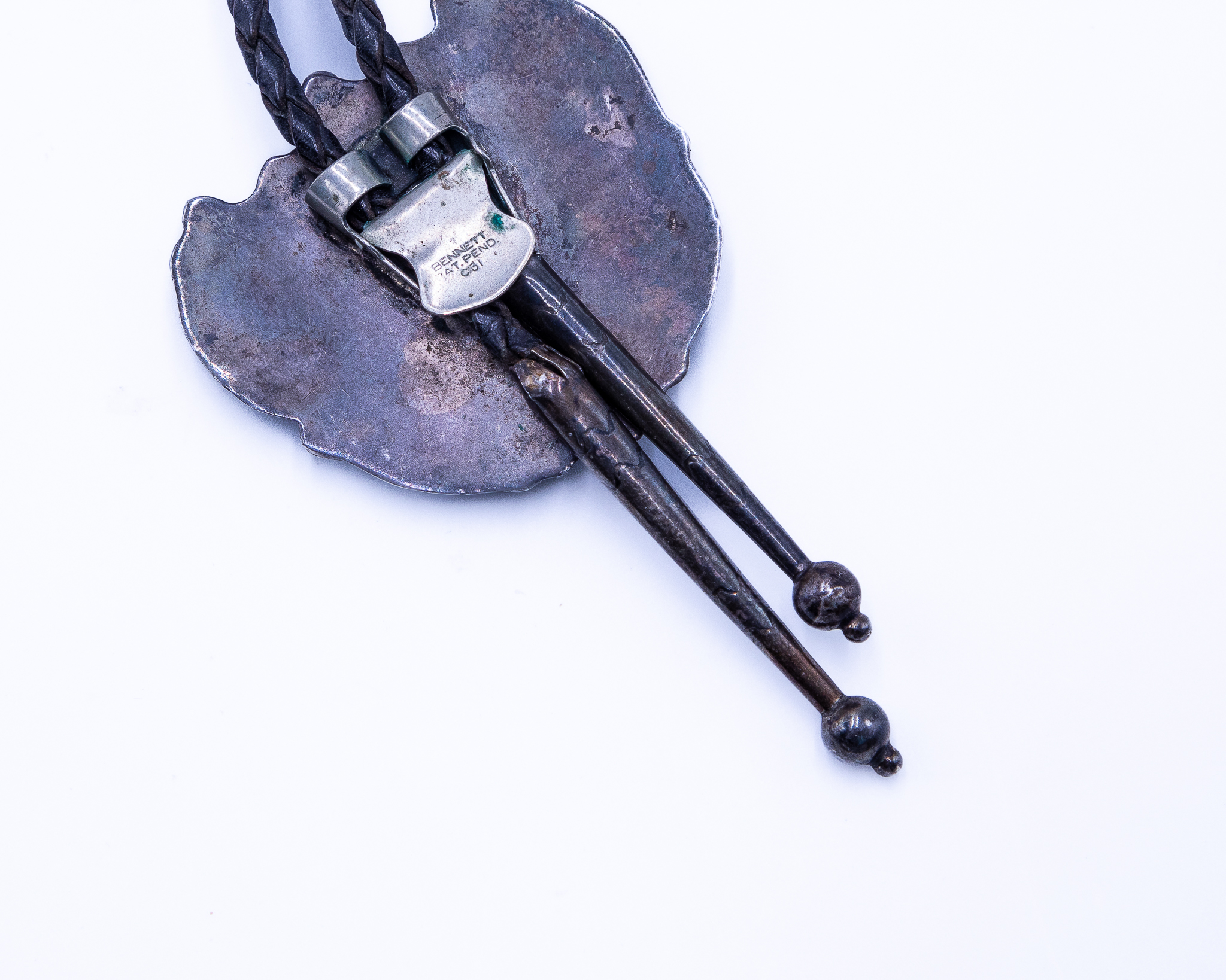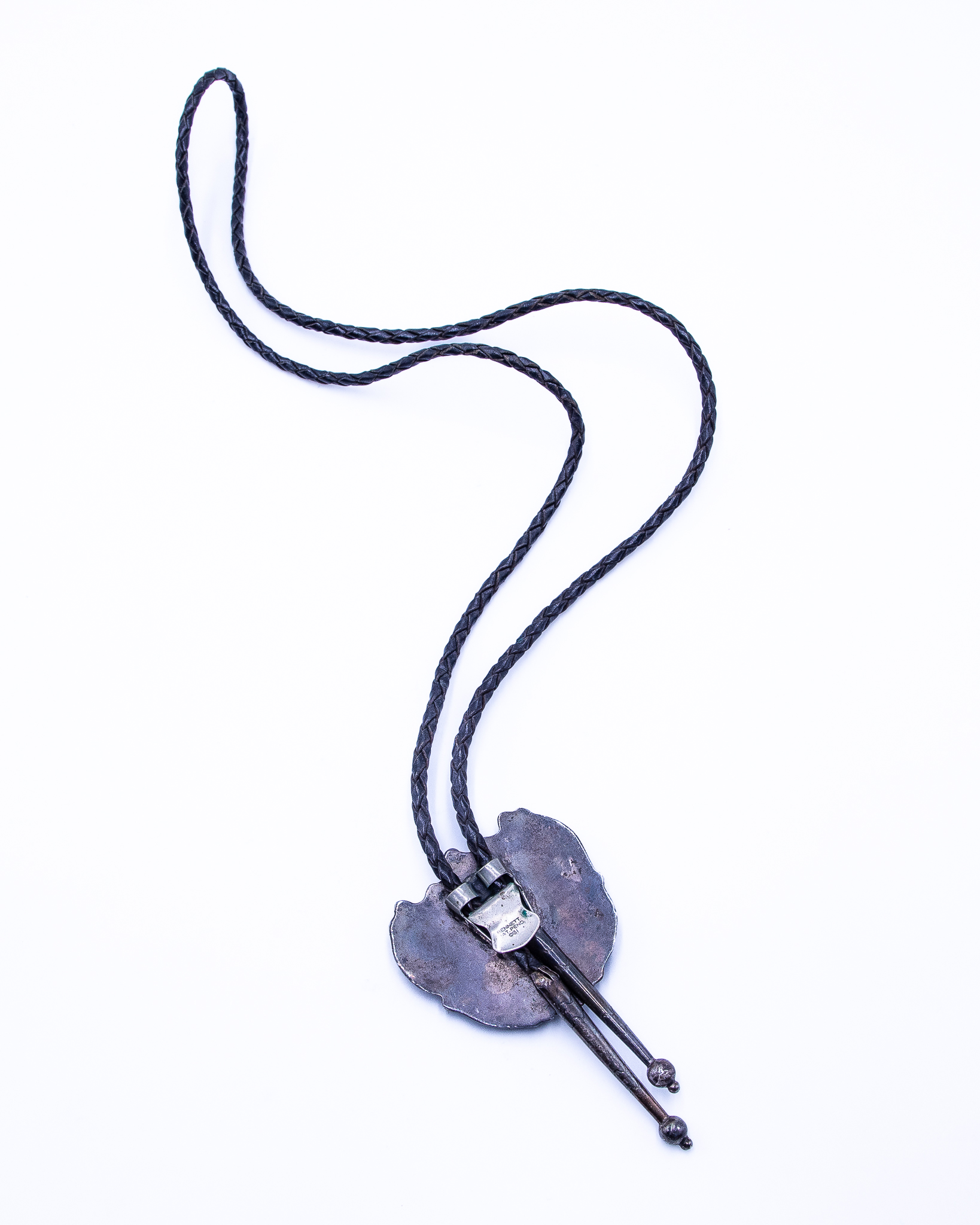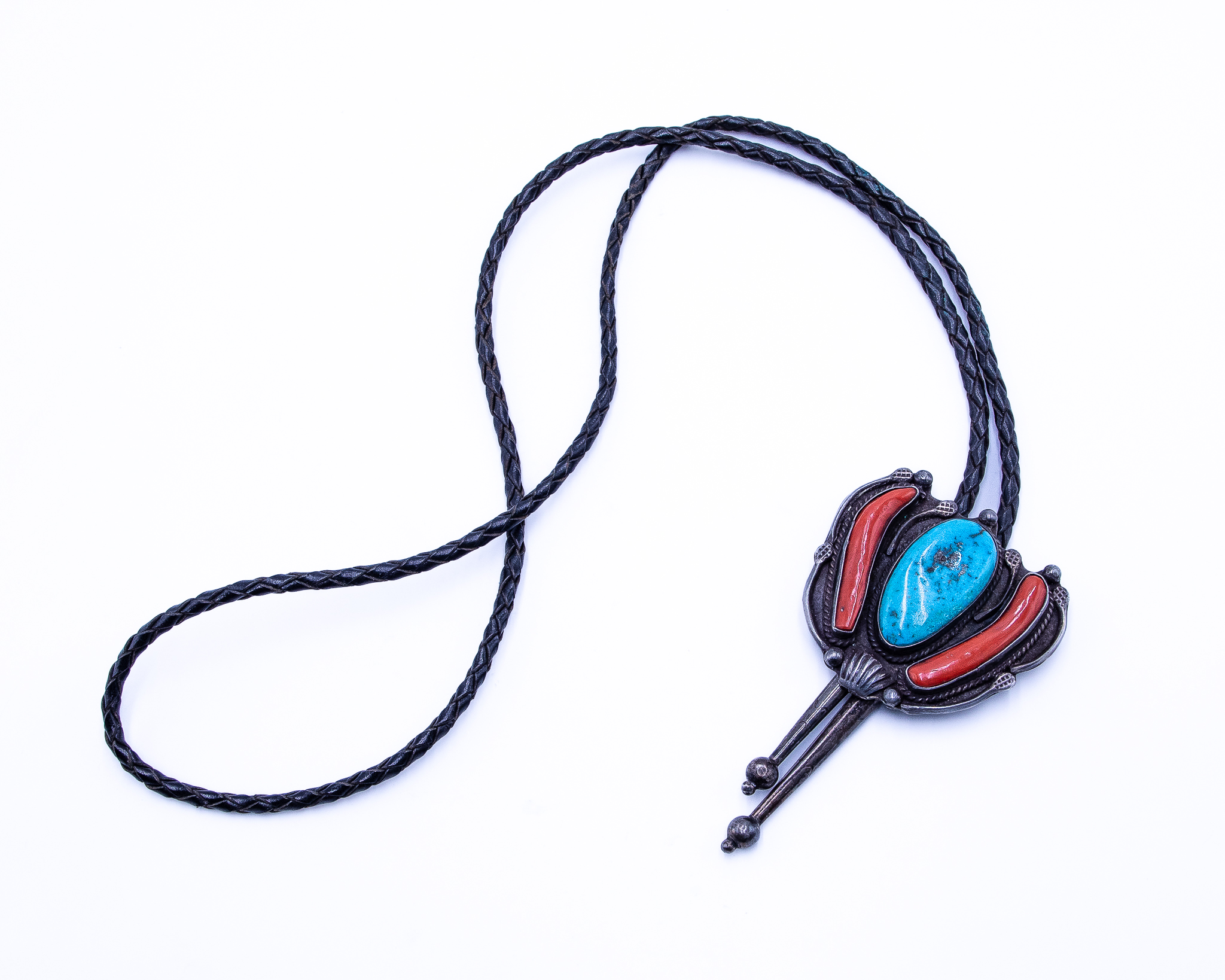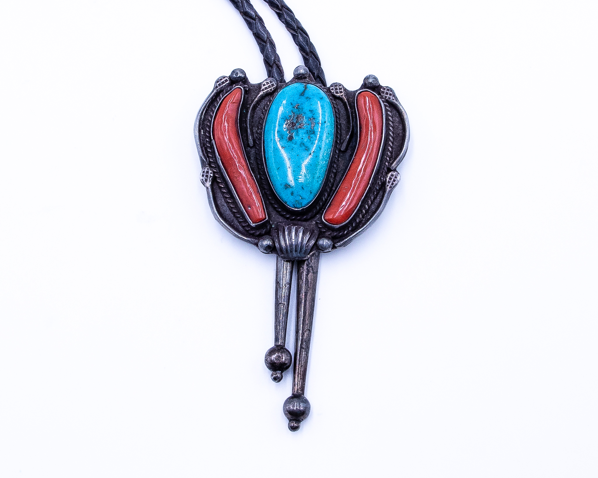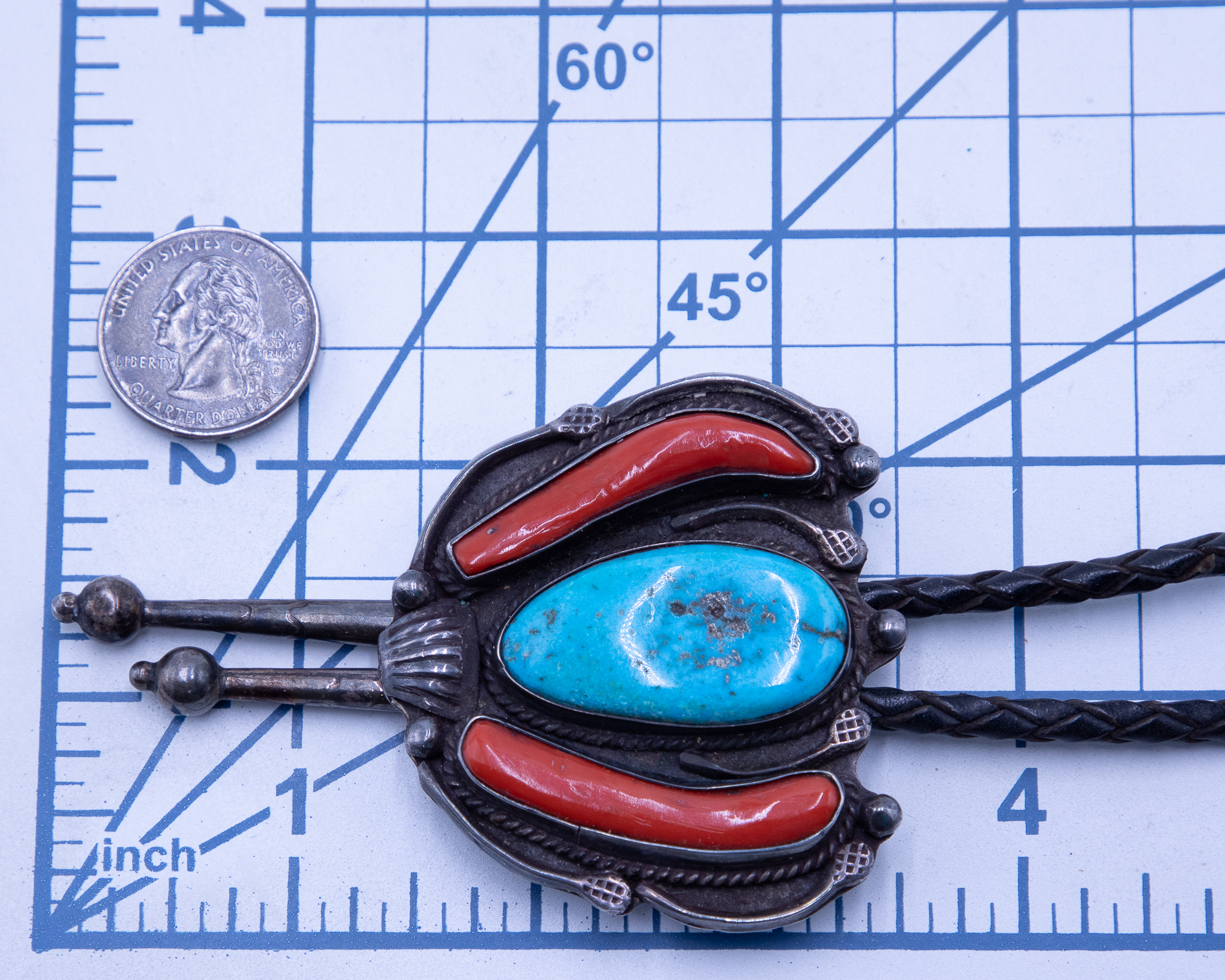 Vintage Signed Coral Turquoise Sterling Bolo Tie 60g-Pictograph Signature, 39″