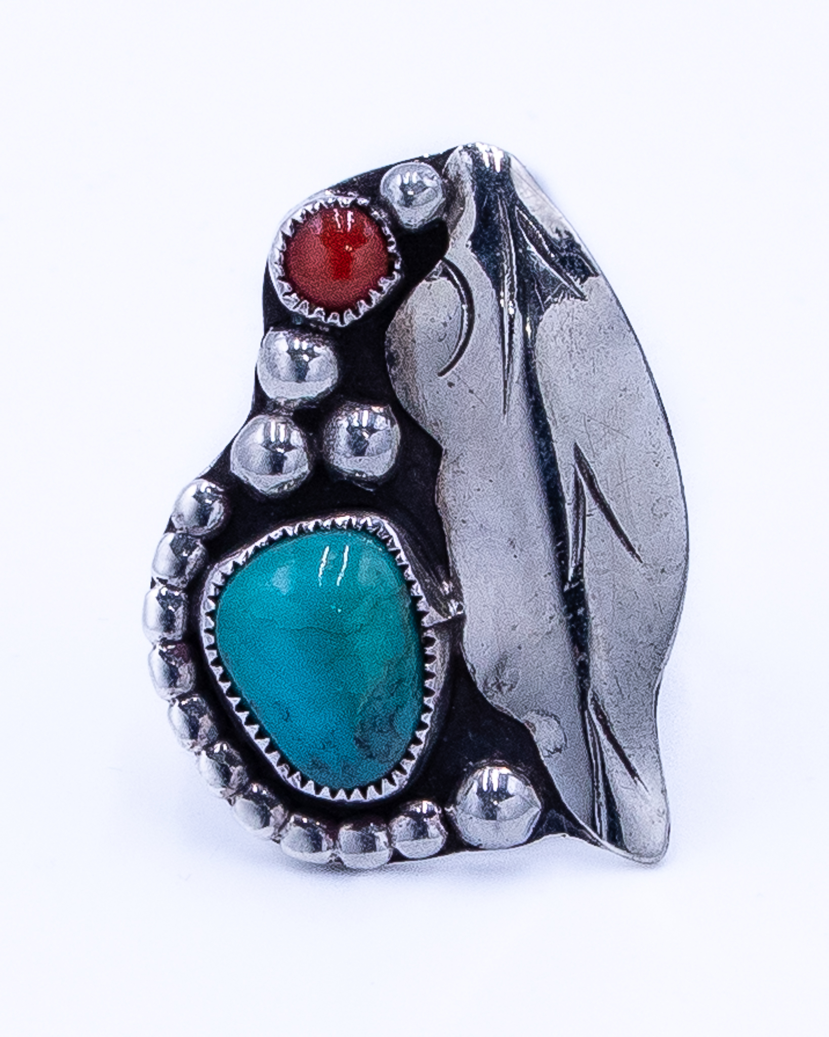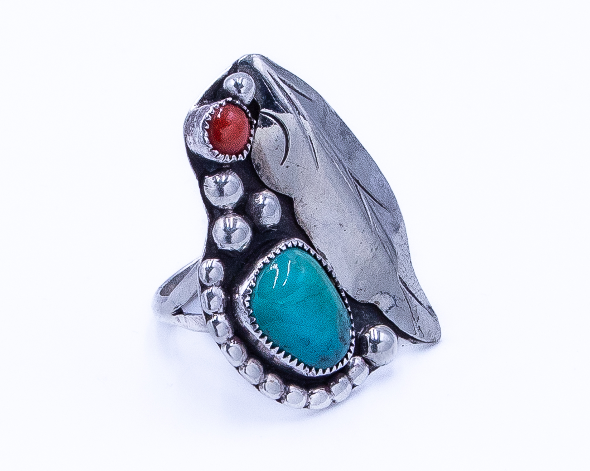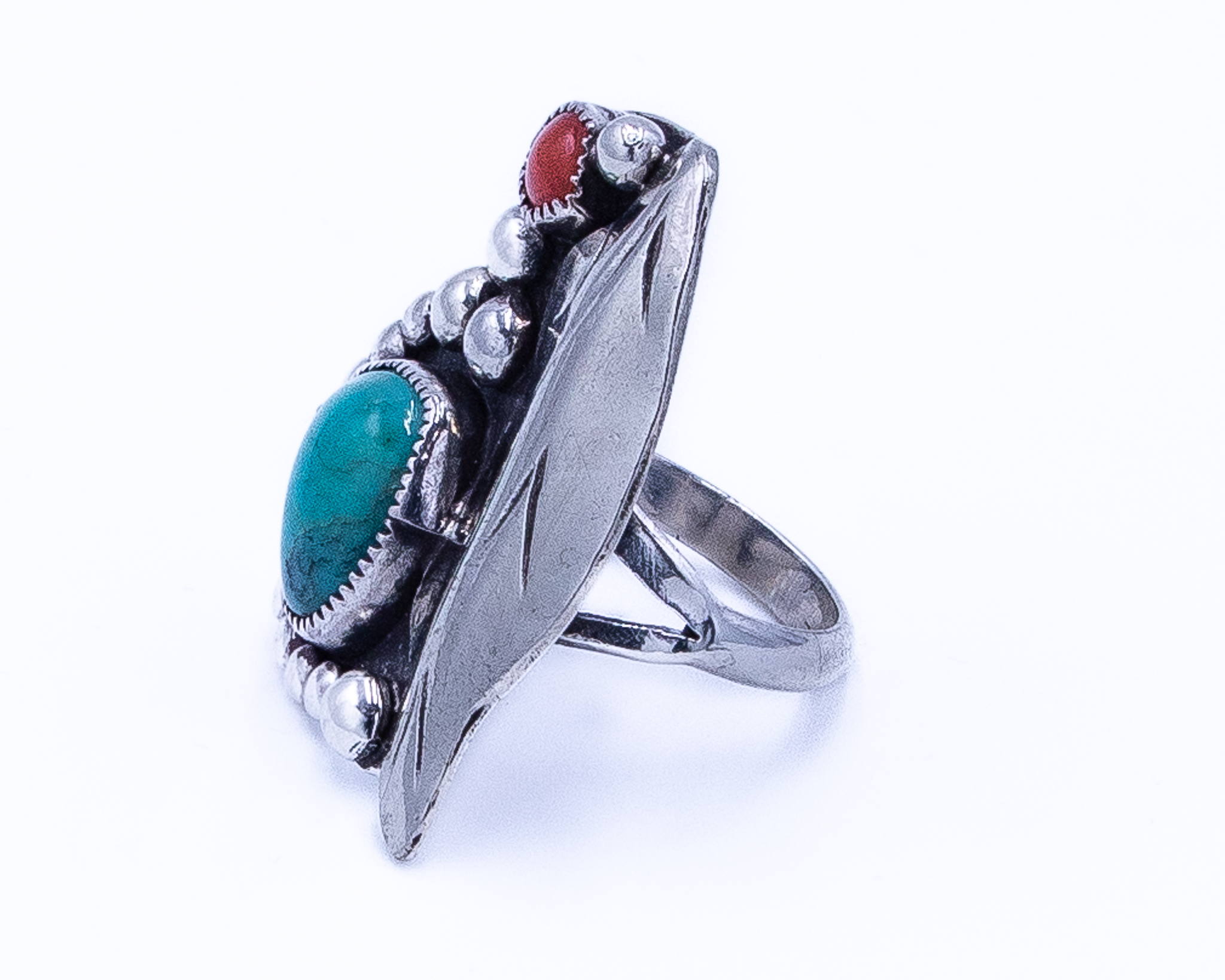 Navajo Turquoise Coral Sterling Ring Sz 8.25, 9.5g