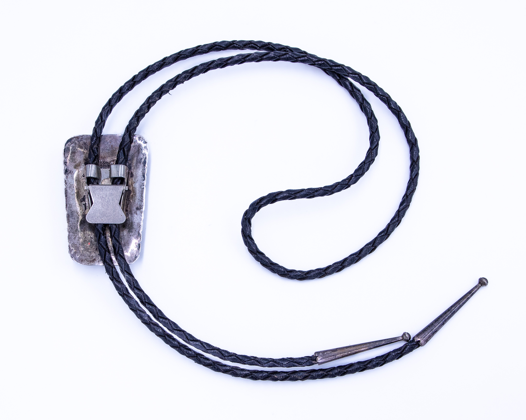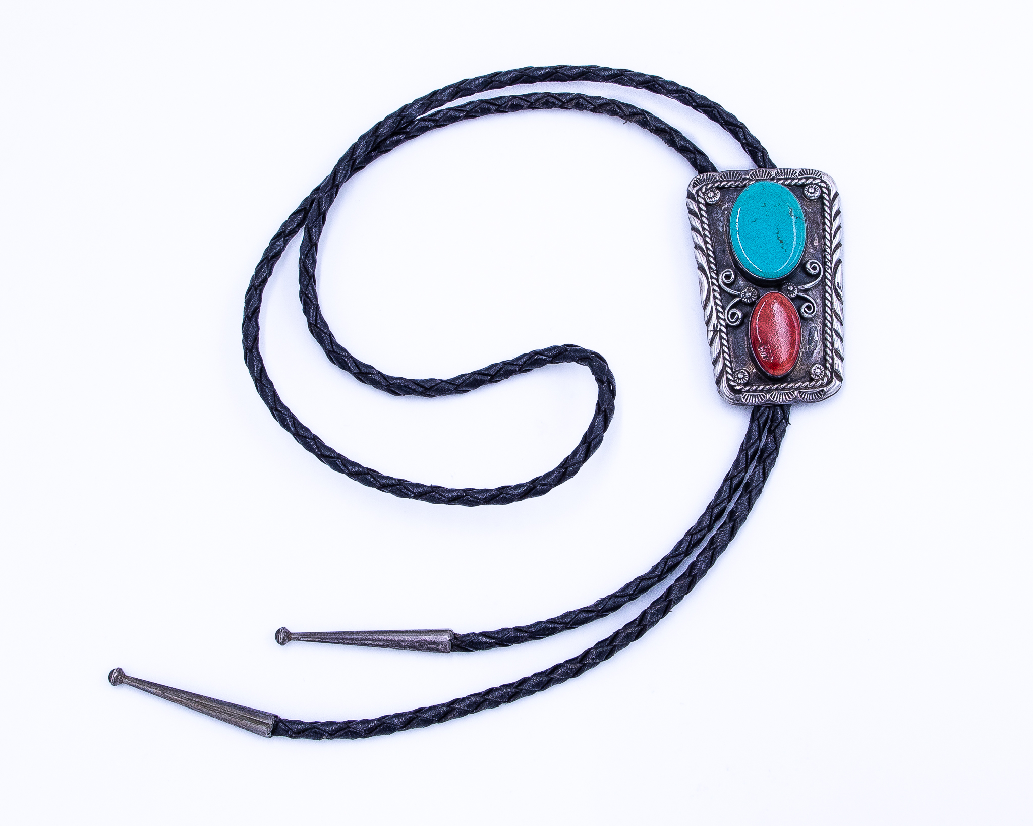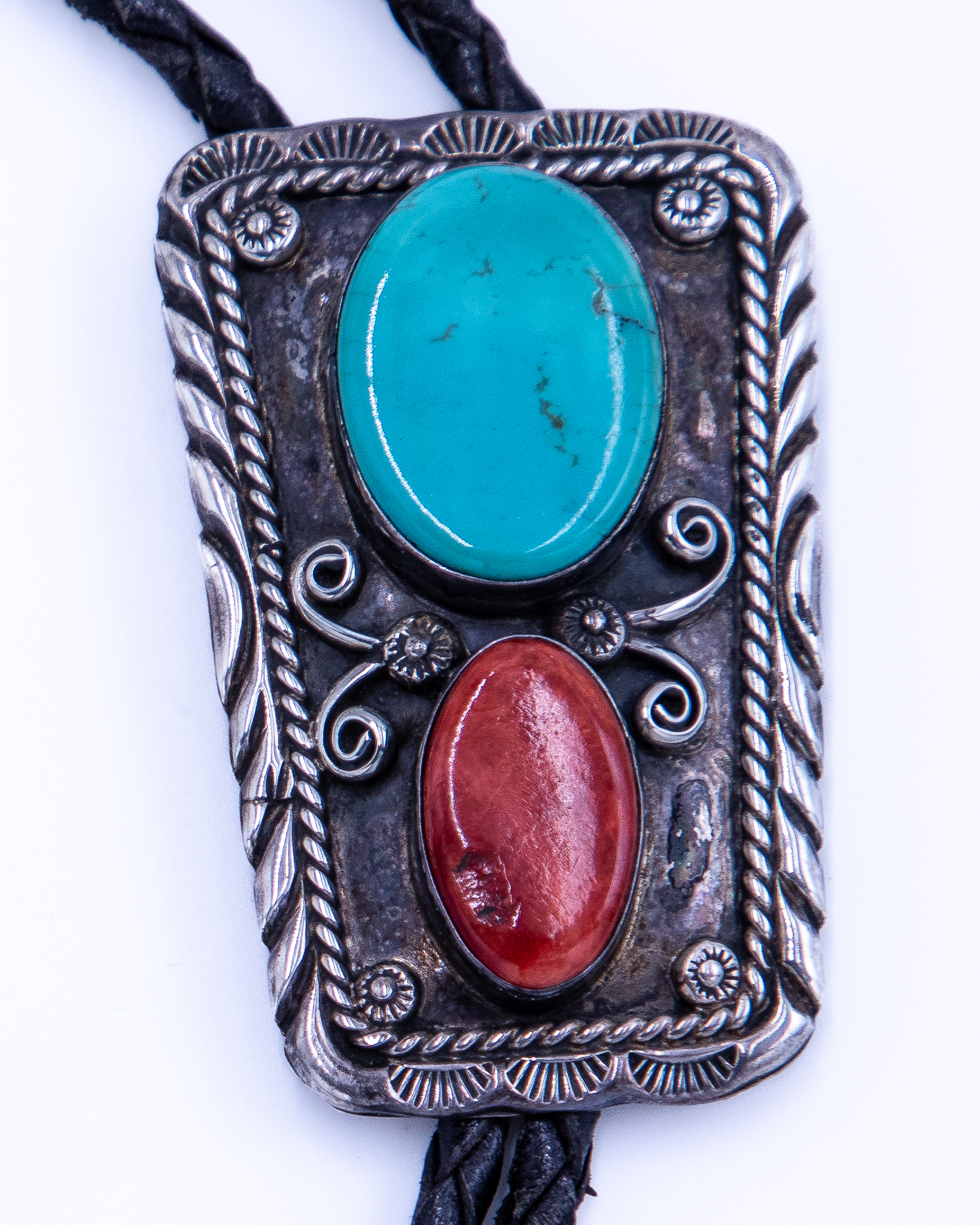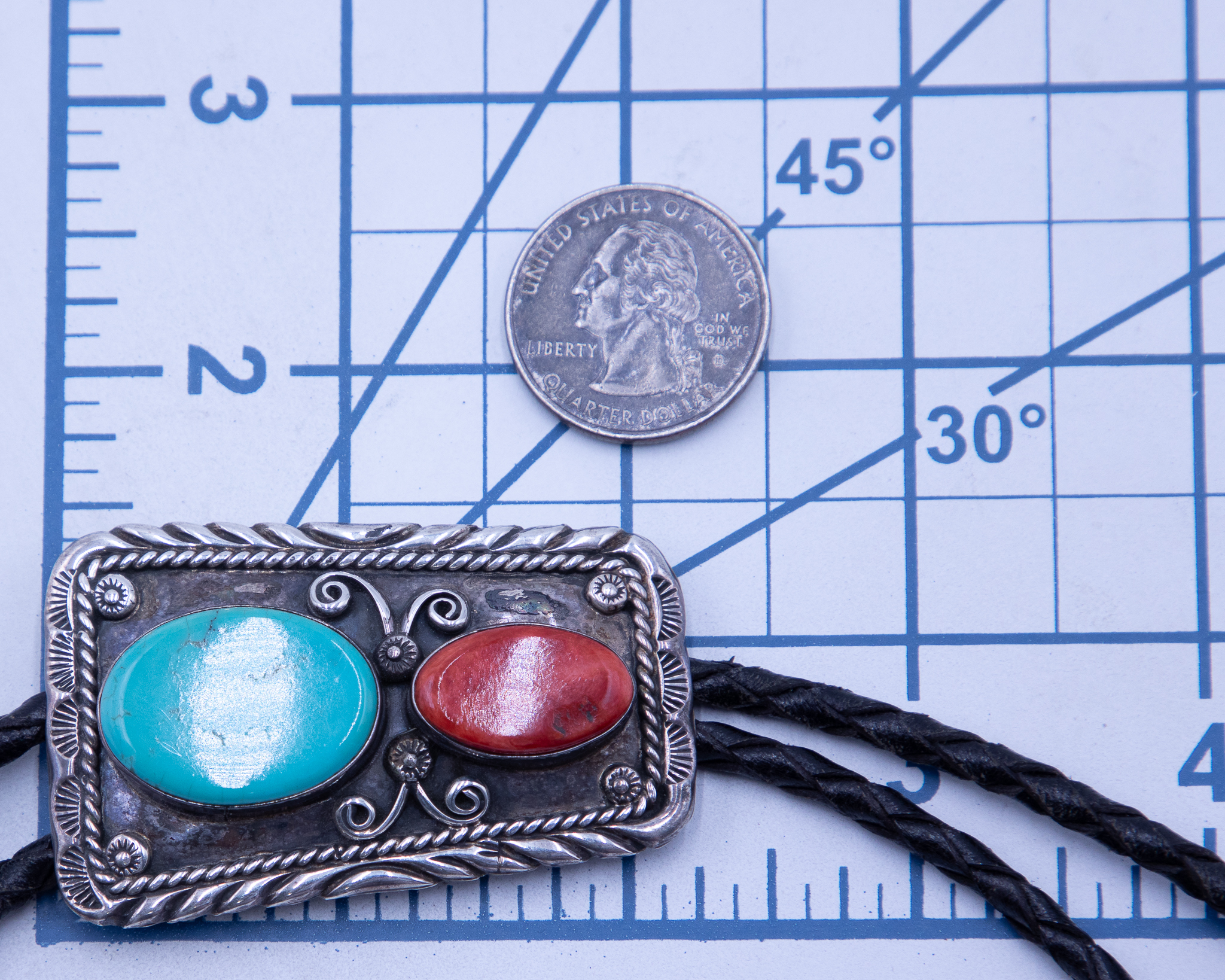 Vintage Navajo Coral Turquoise Sterling Overlay Bolo Tie 36.5g