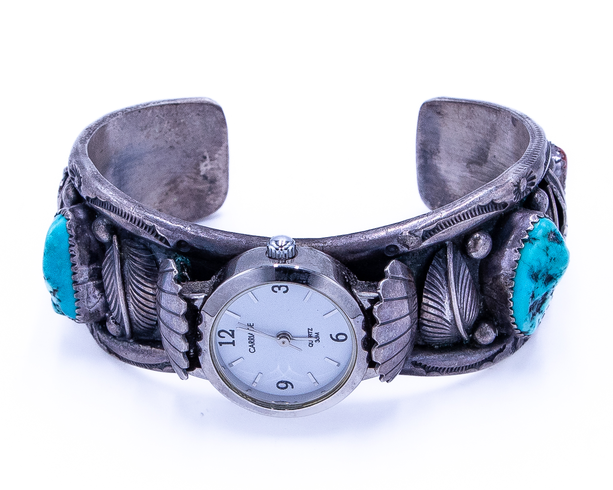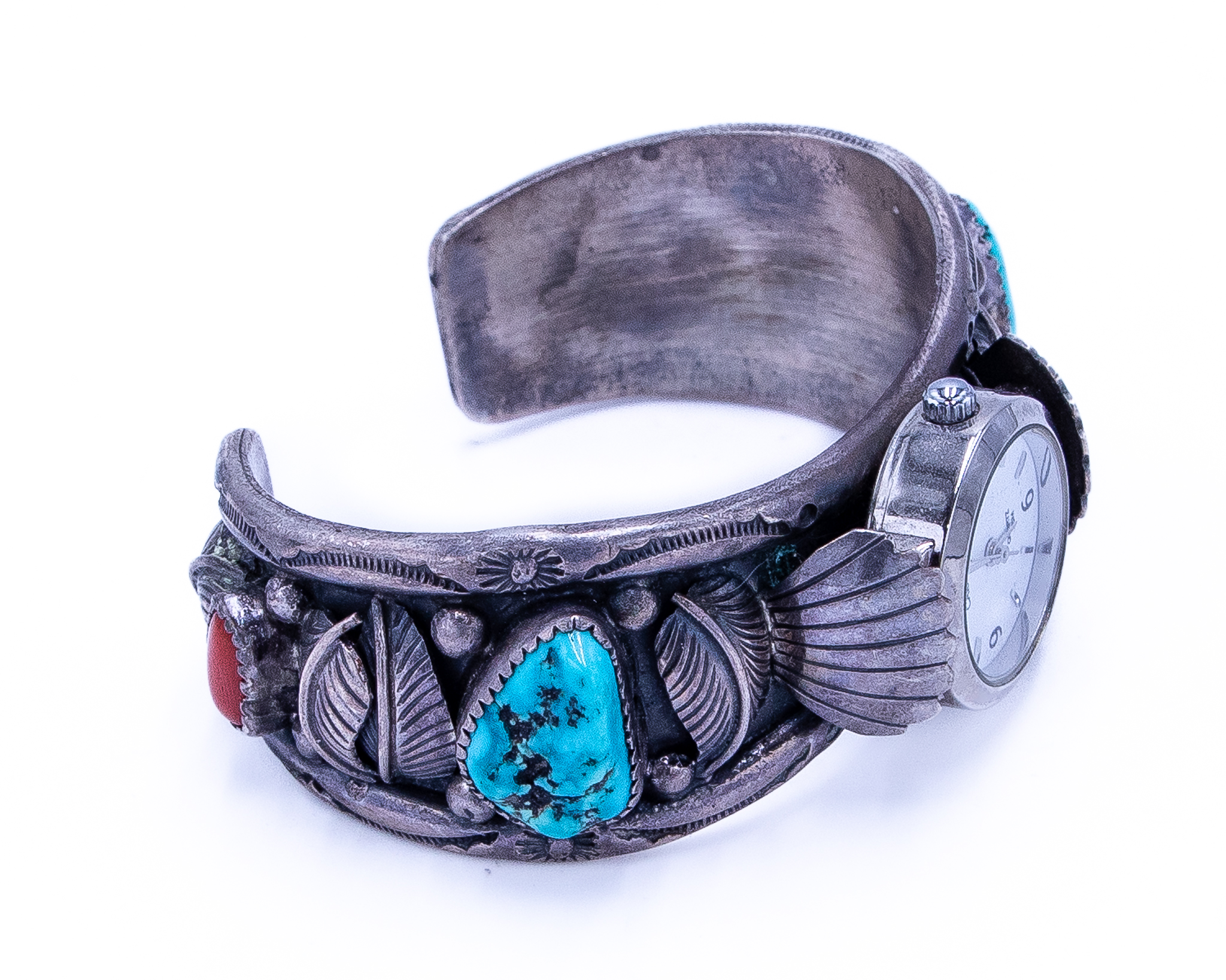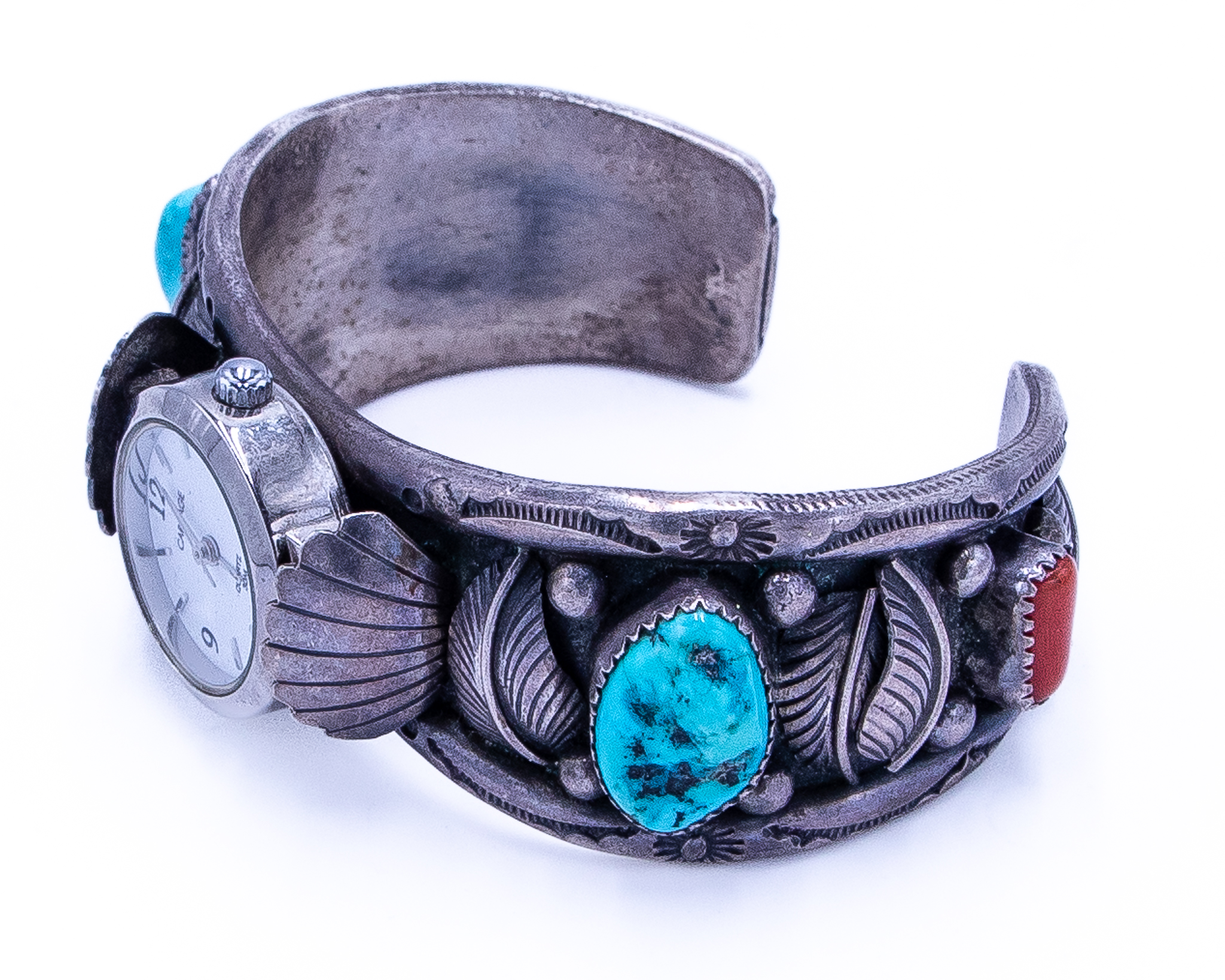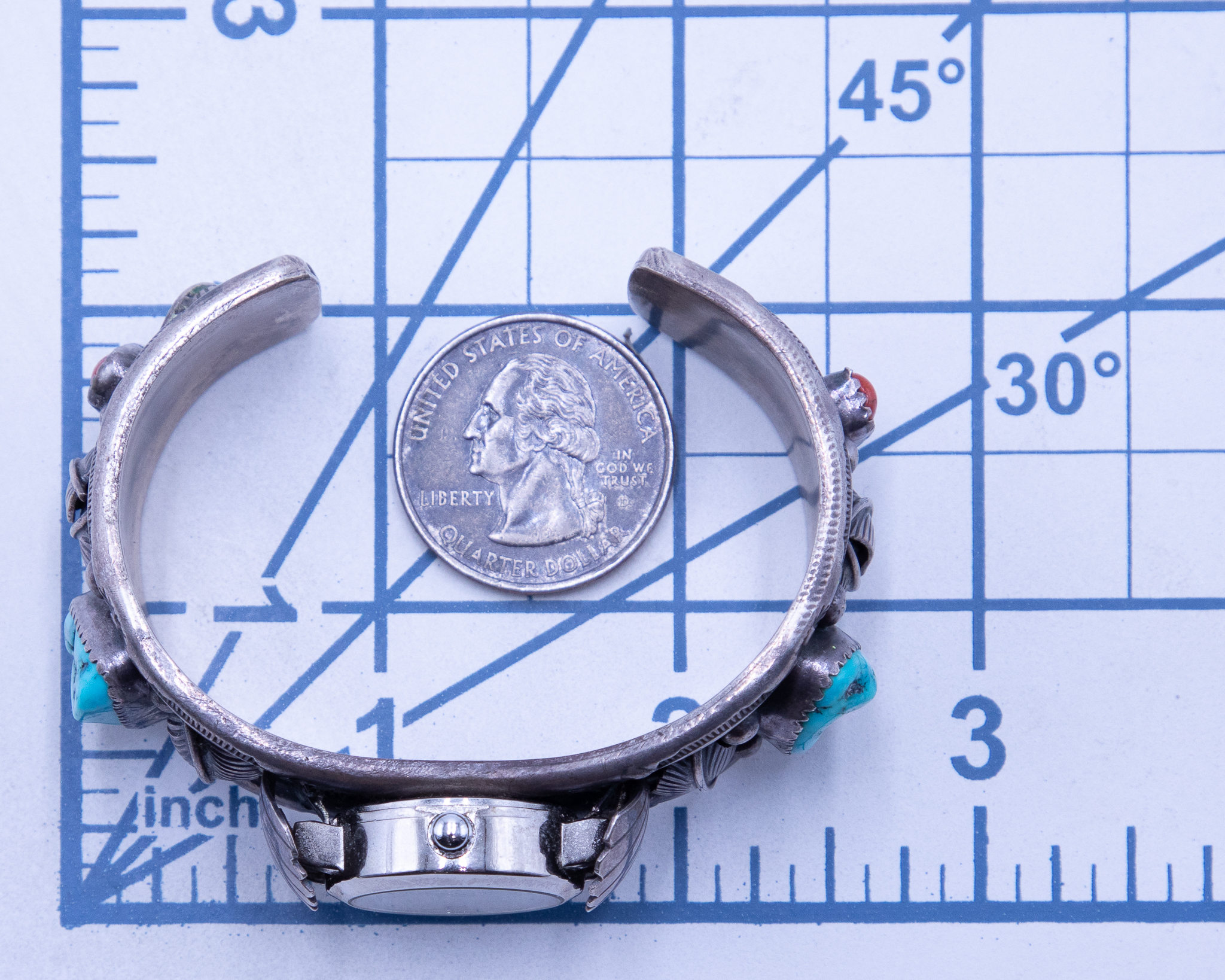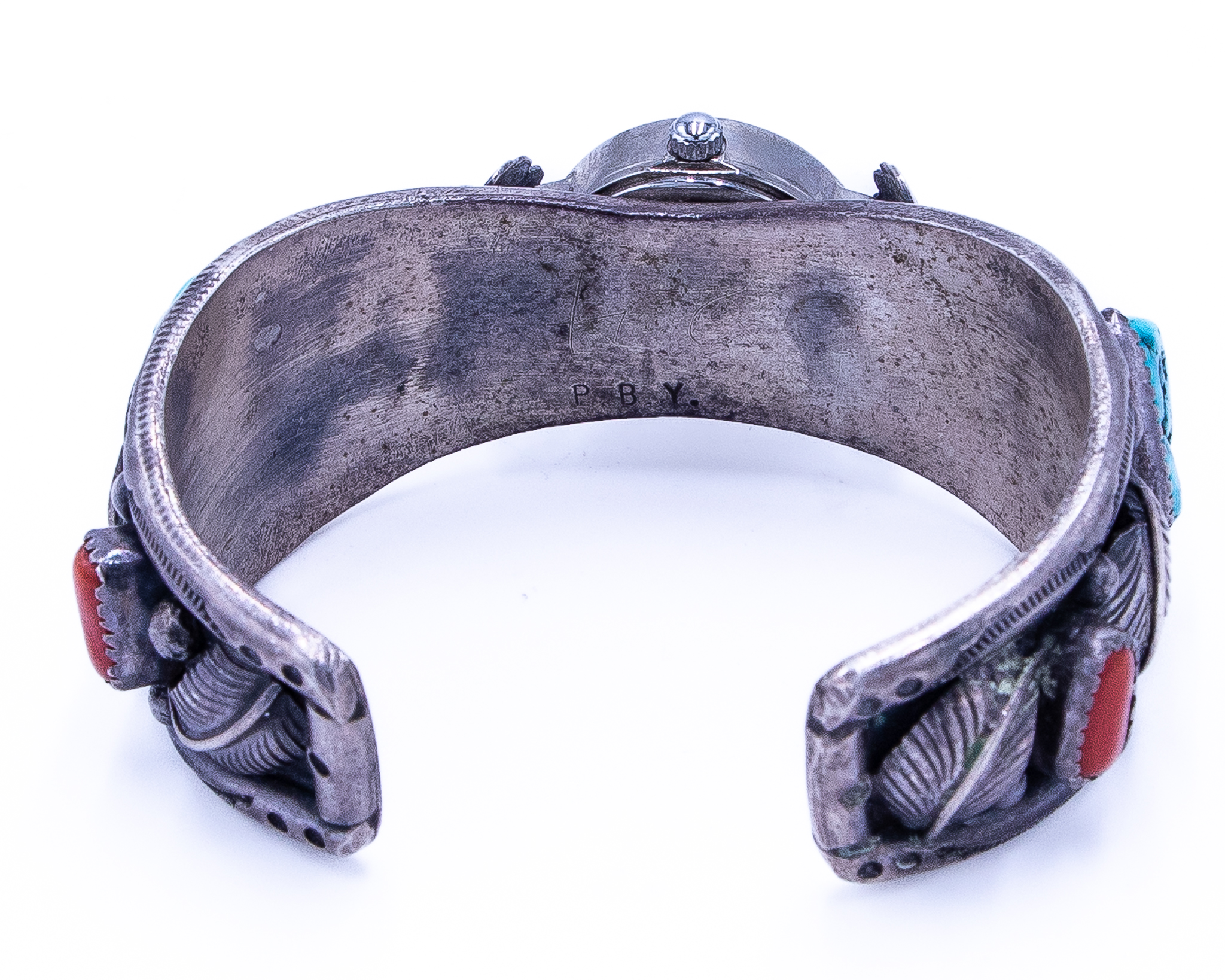 Signed PBY Navajo Turquoise Coral Sterling Watch Cuff With Carriage Watch