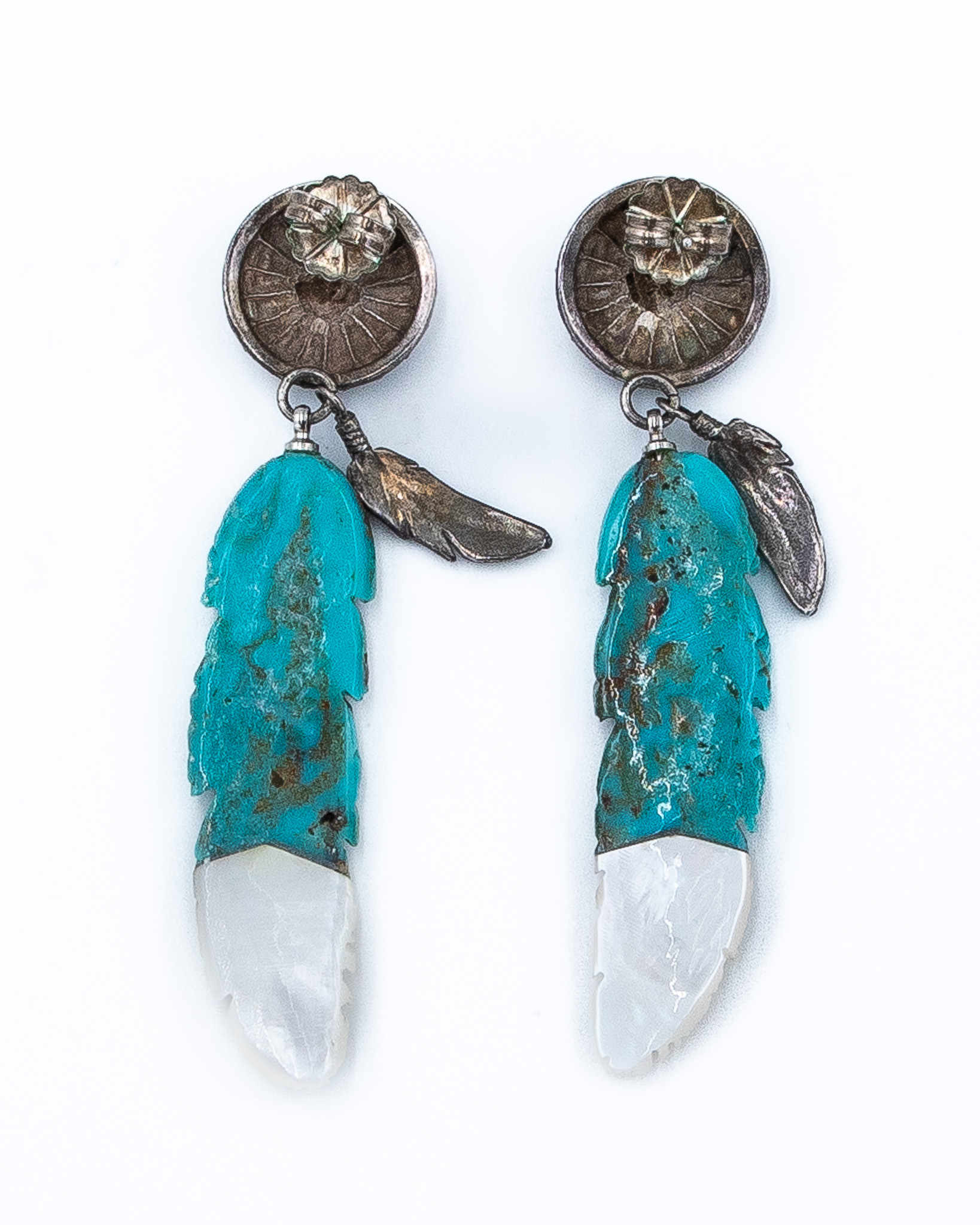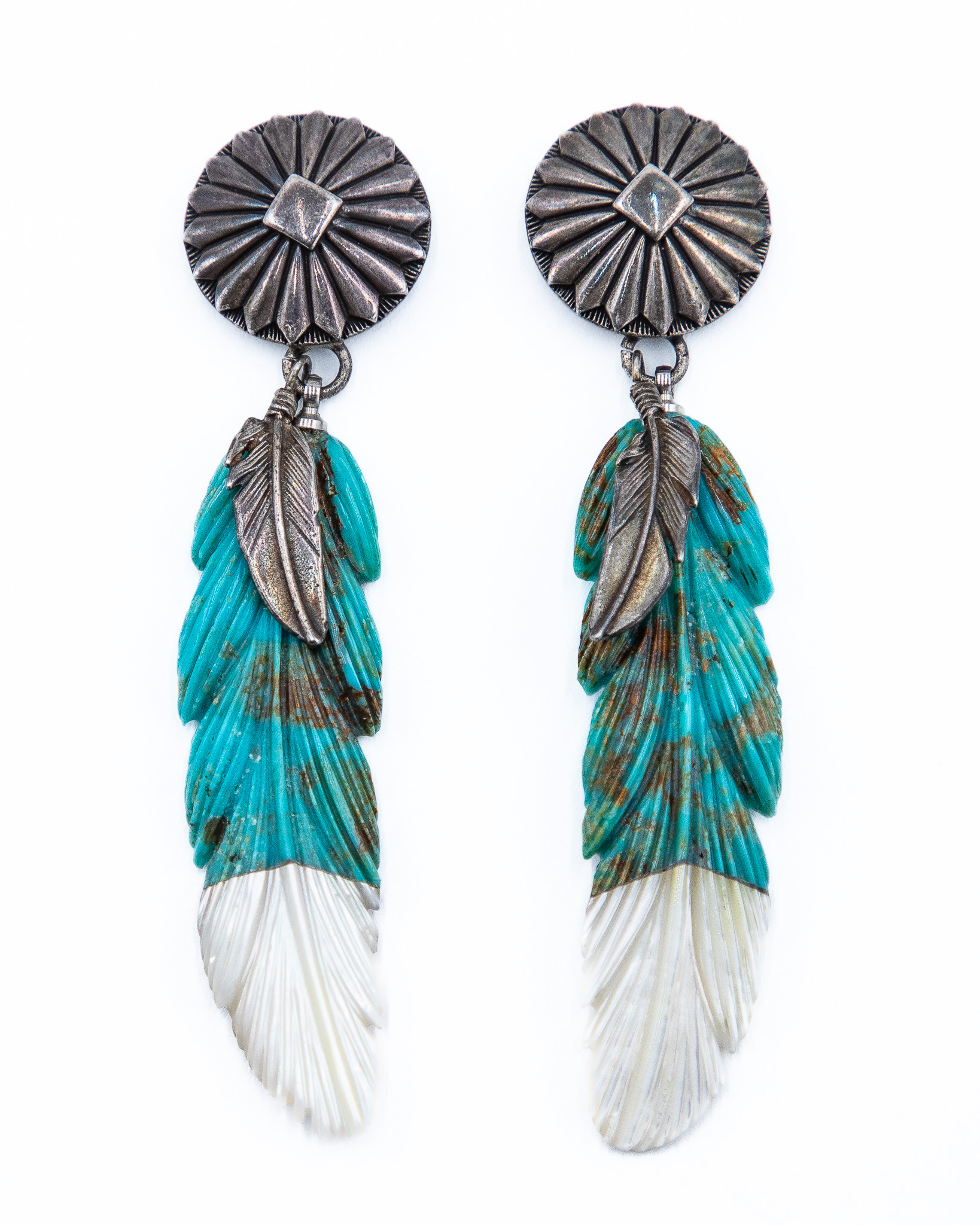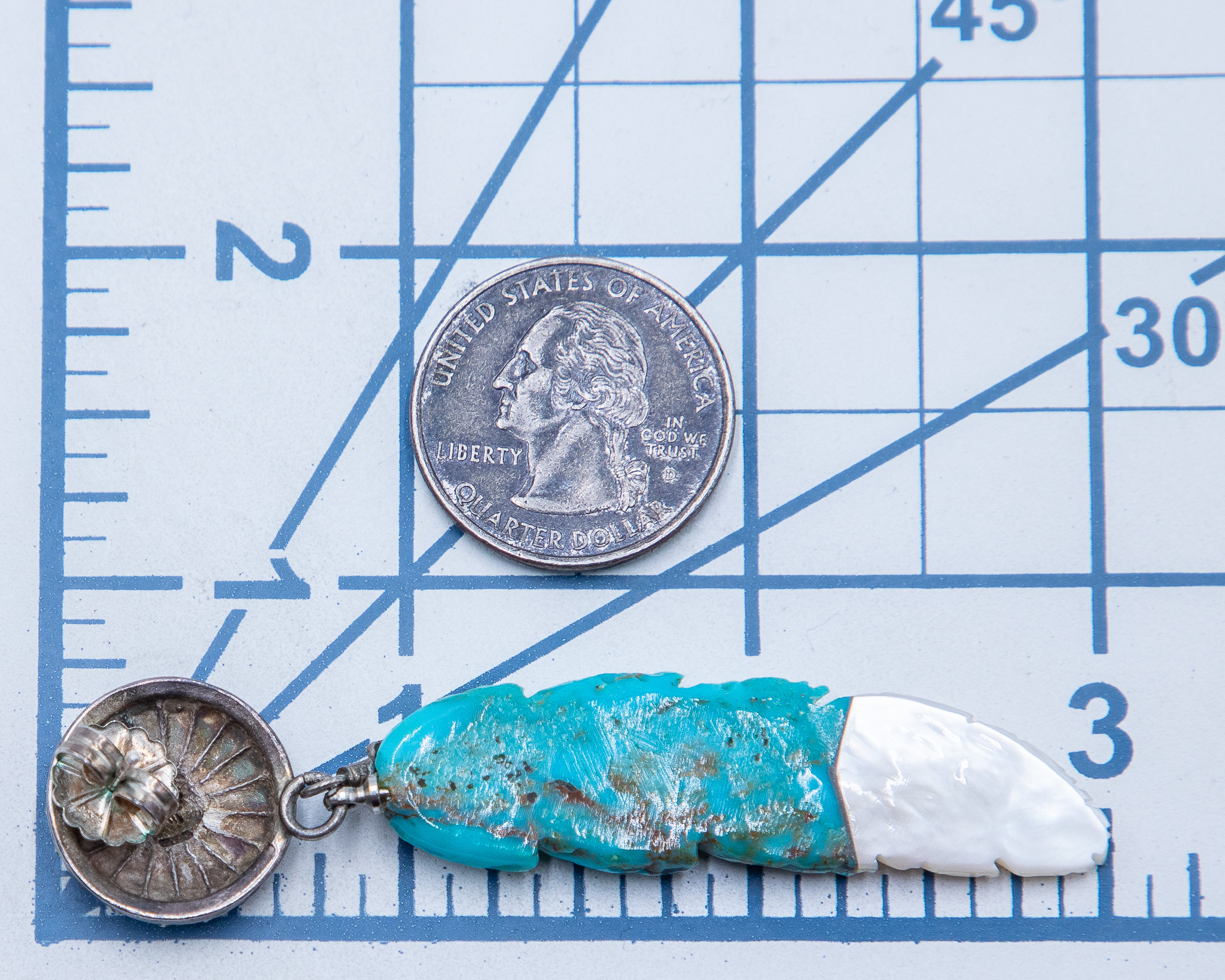 Stunning Native American Handsigned Handmade Sterling Concho Turquoise/Mother of Pearl Feather Dangle Earrings 19.8g