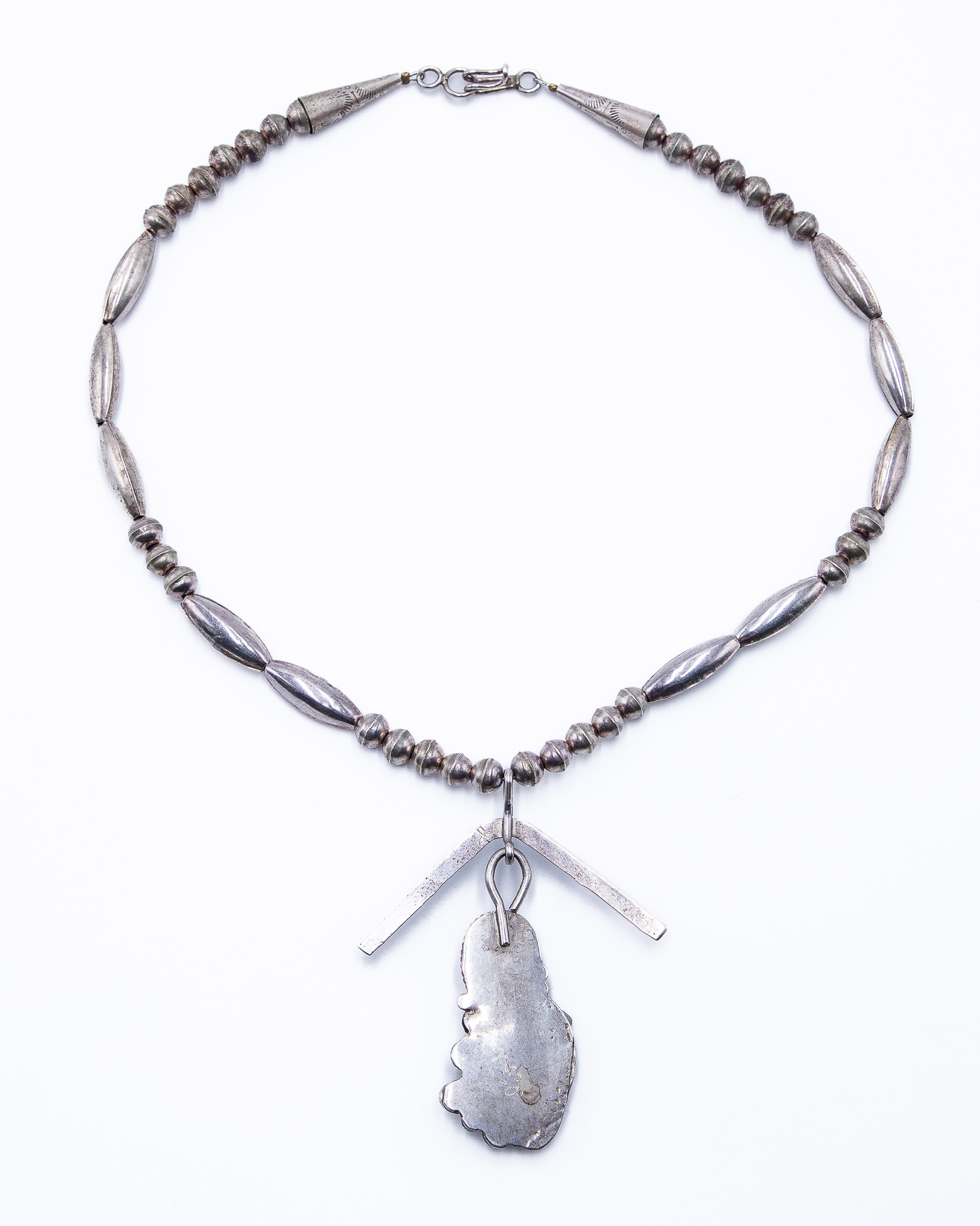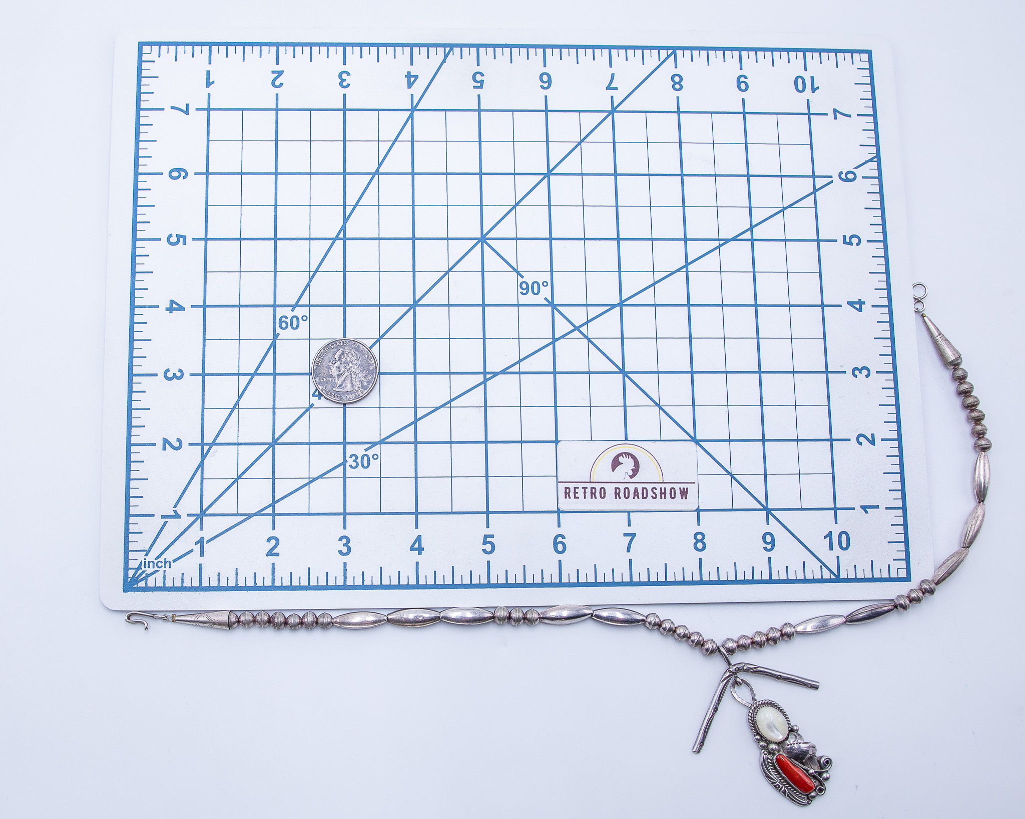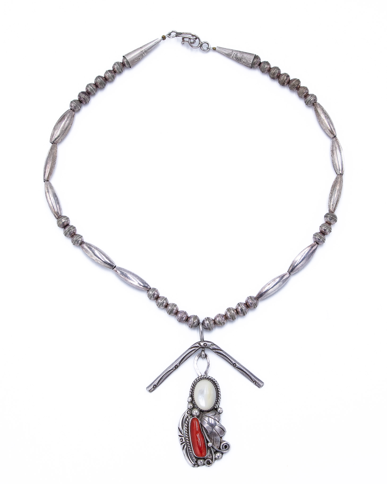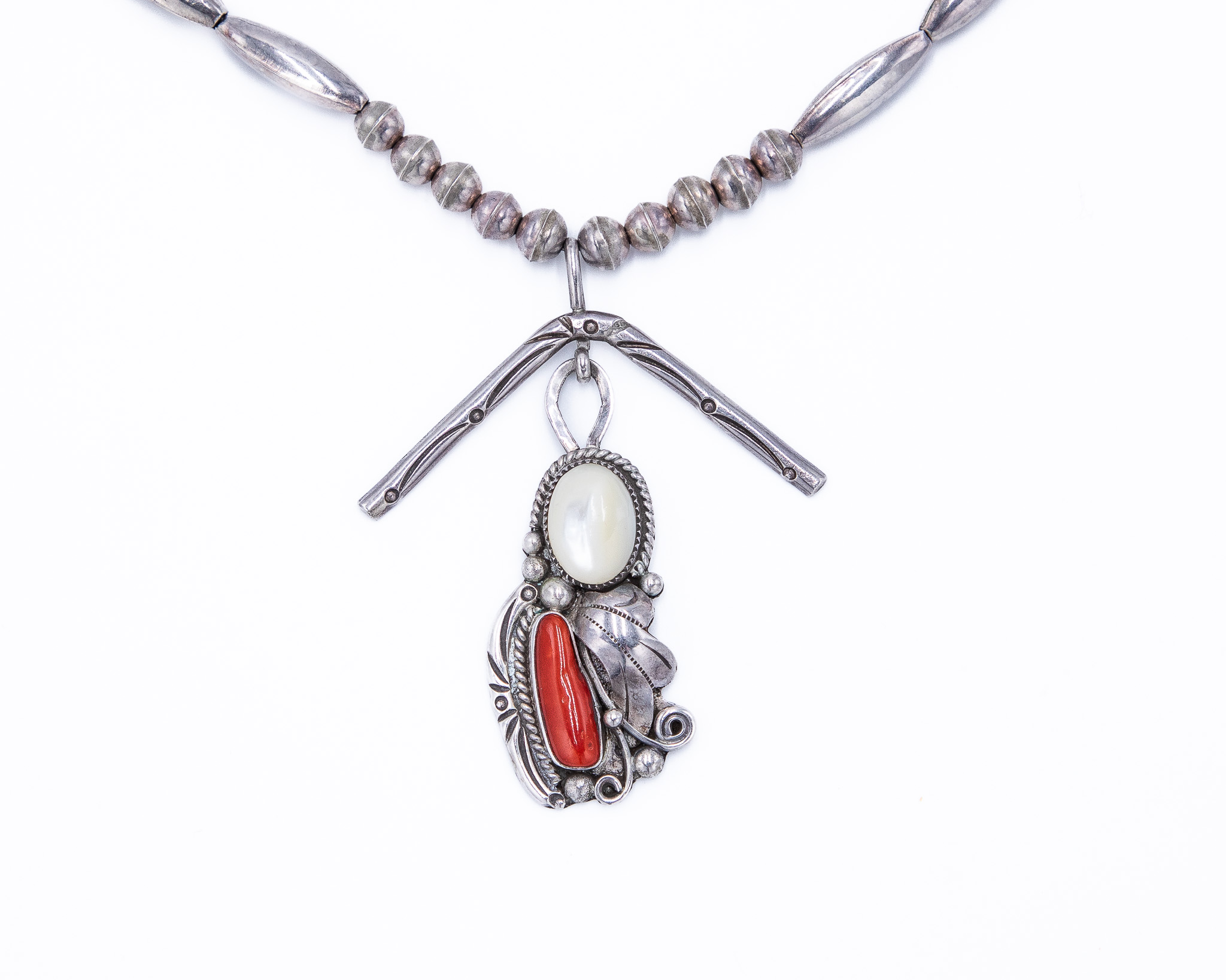 Nez Navajo Handsigned Handstamped Coral Mother of Pearl Sterling Handlebar Bead Necklace 25g