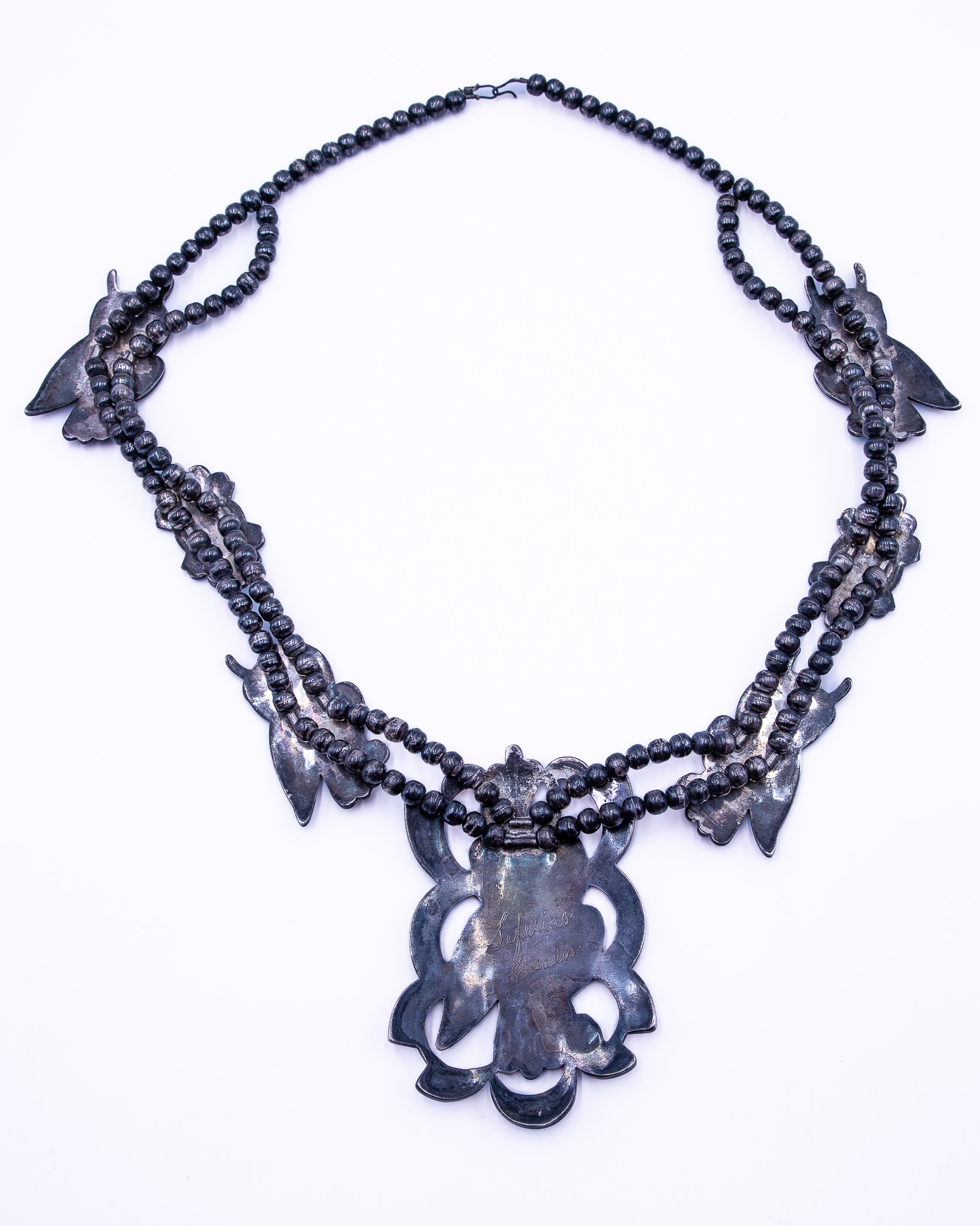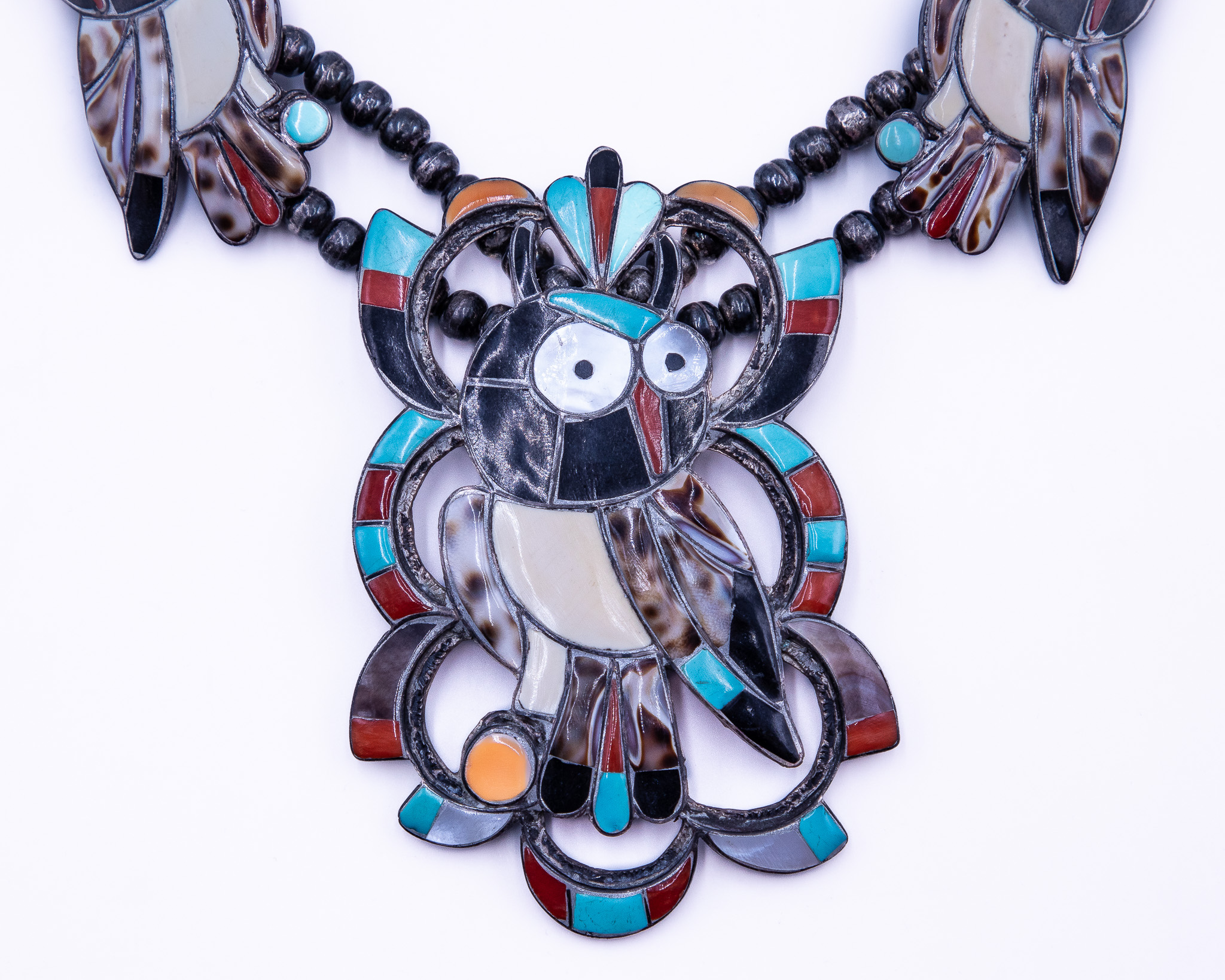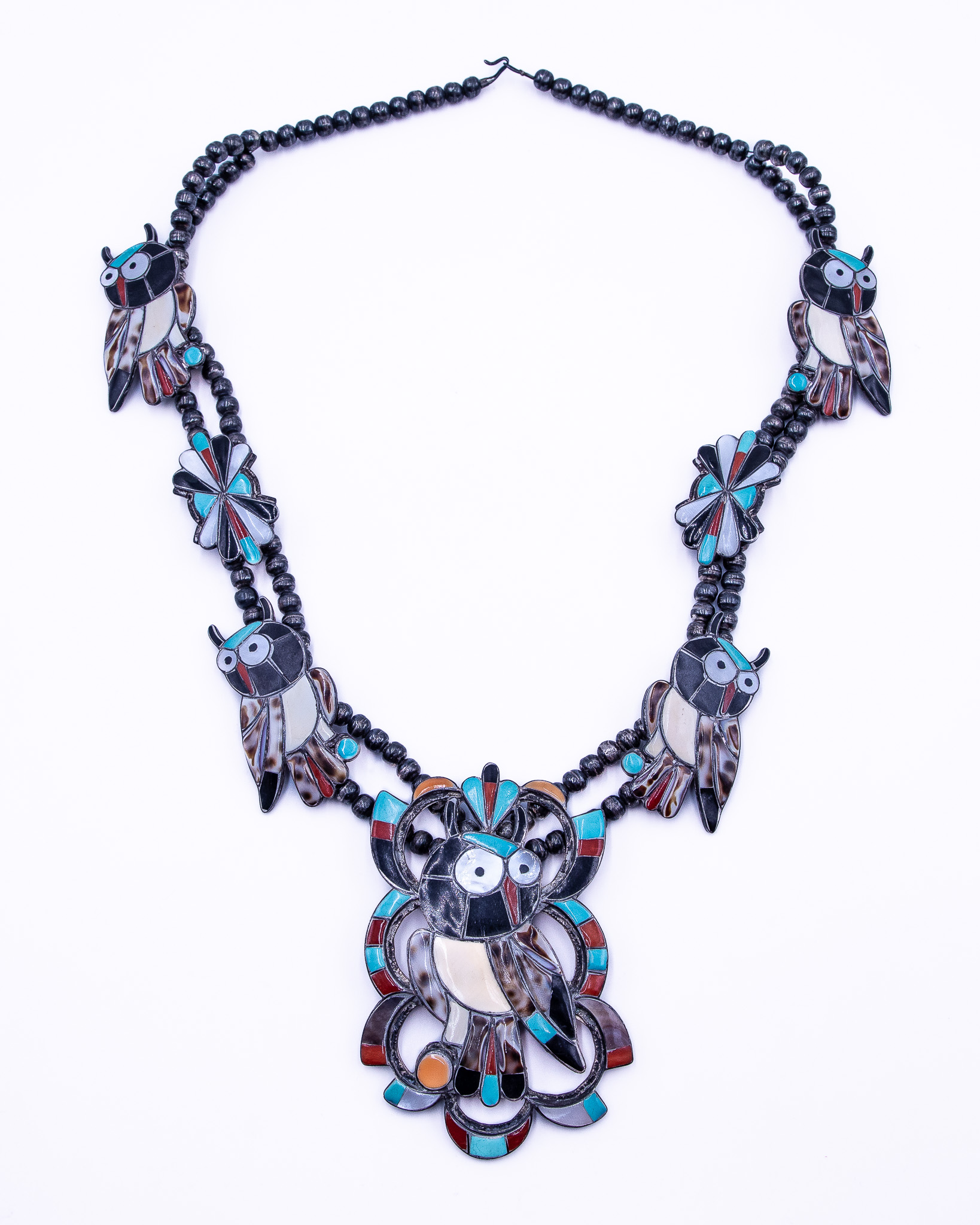 Seferino Esalio Zuni Multi Stone Sterling Inlay Owl Squash Blossom Necklace 186g-Coral, Turquoise, Spiny Oyster, Onyx, Mother of Pearl, Cowrie Shell