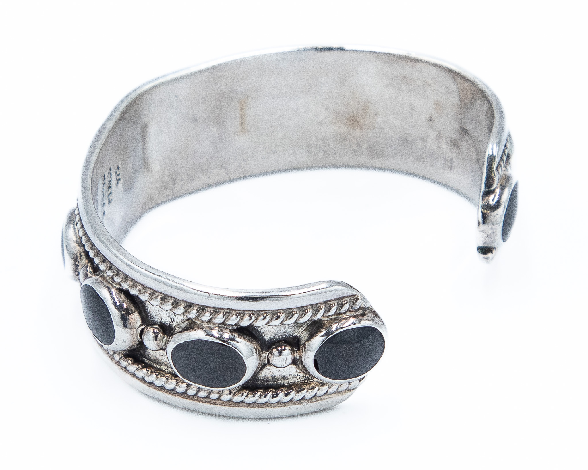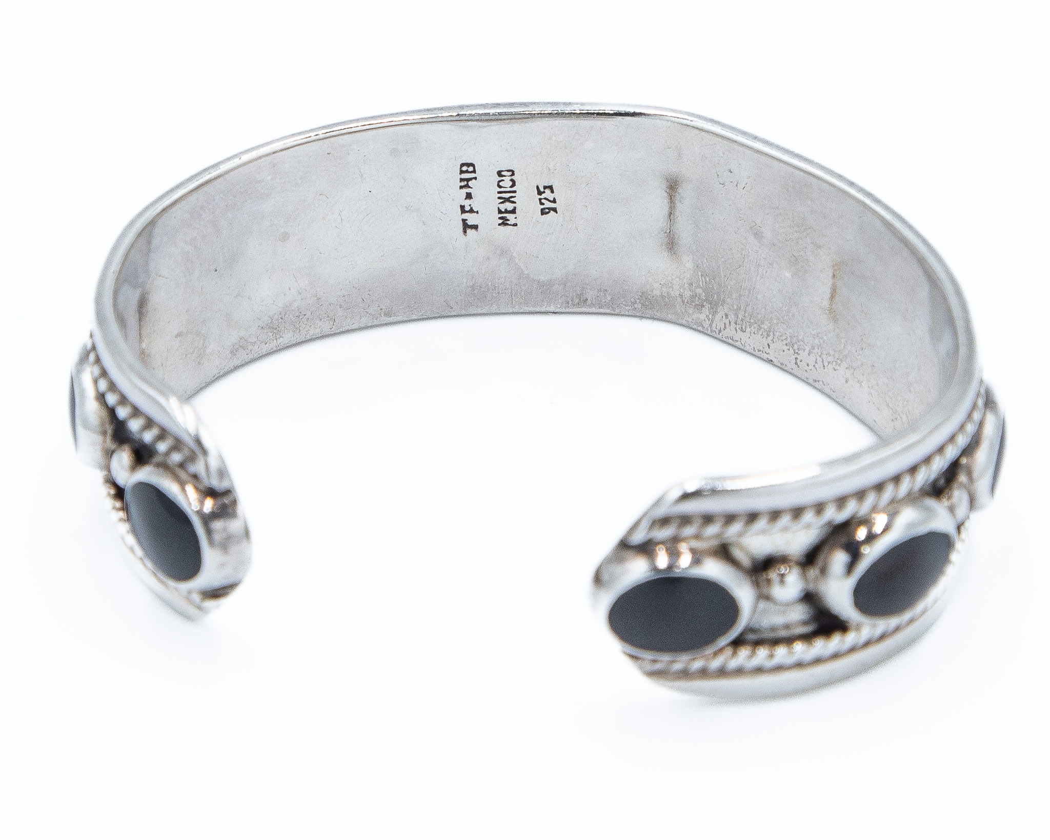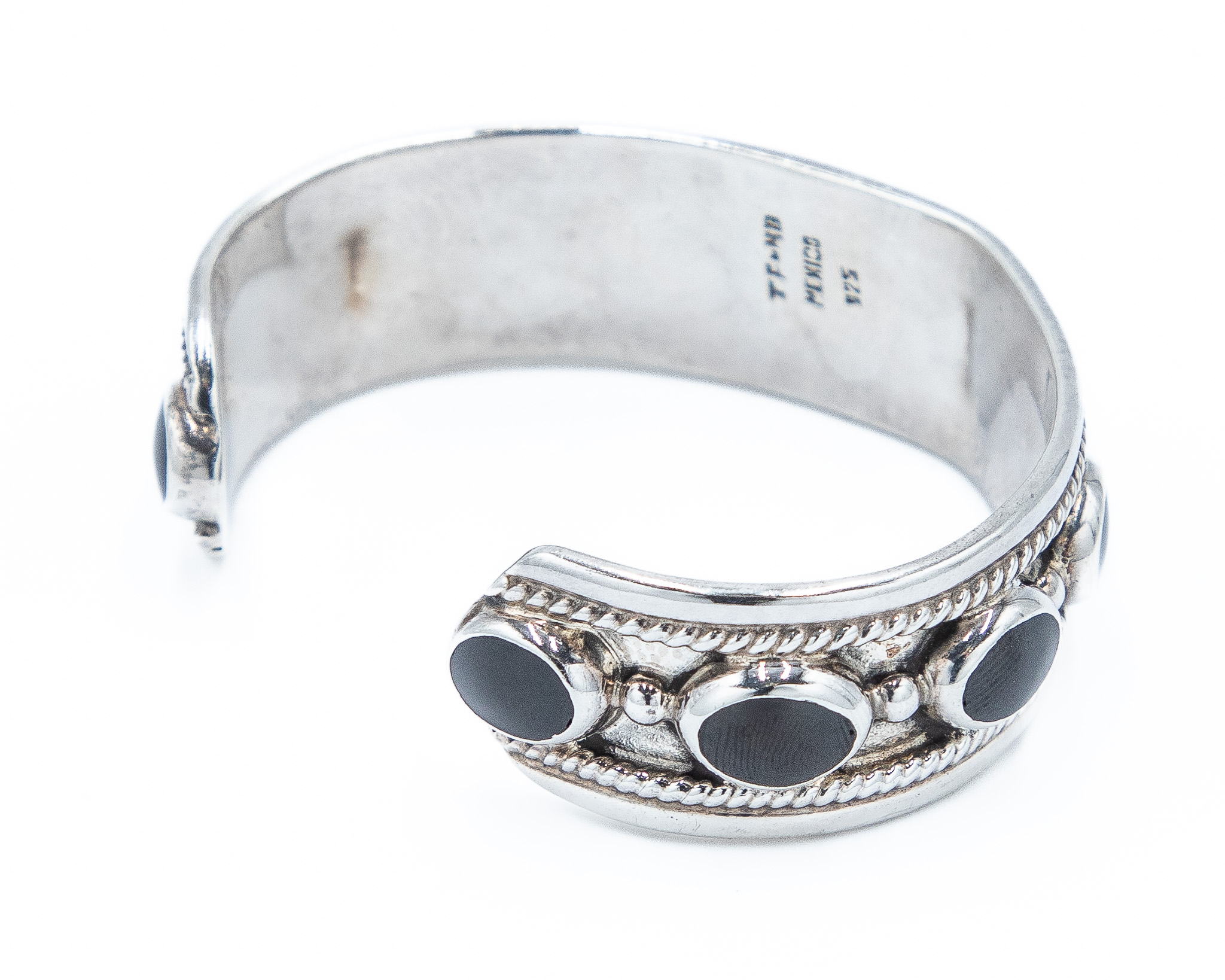 Signed TF-48 Taxco Mexico Onyx Sterling Cuff Bracelet 41g