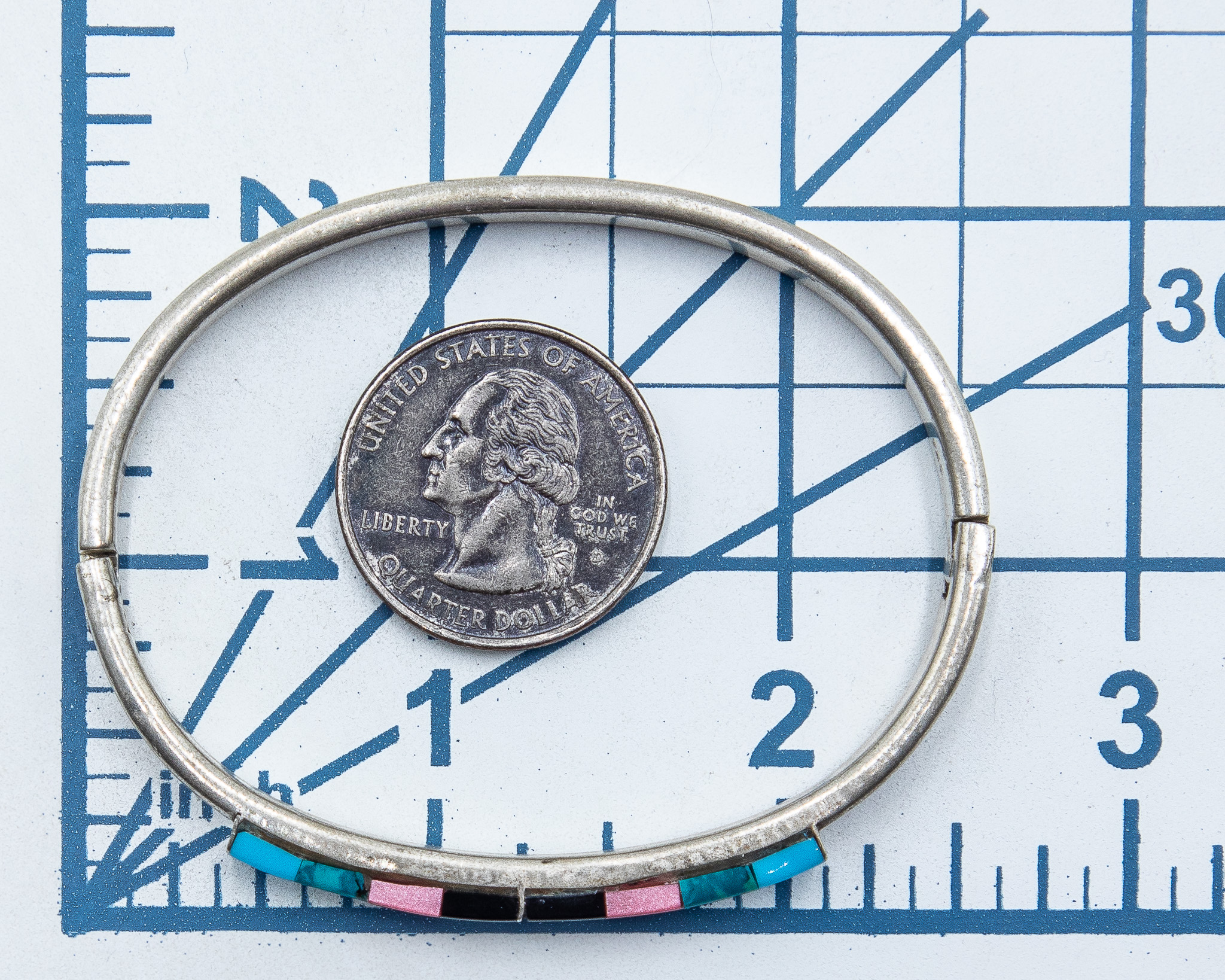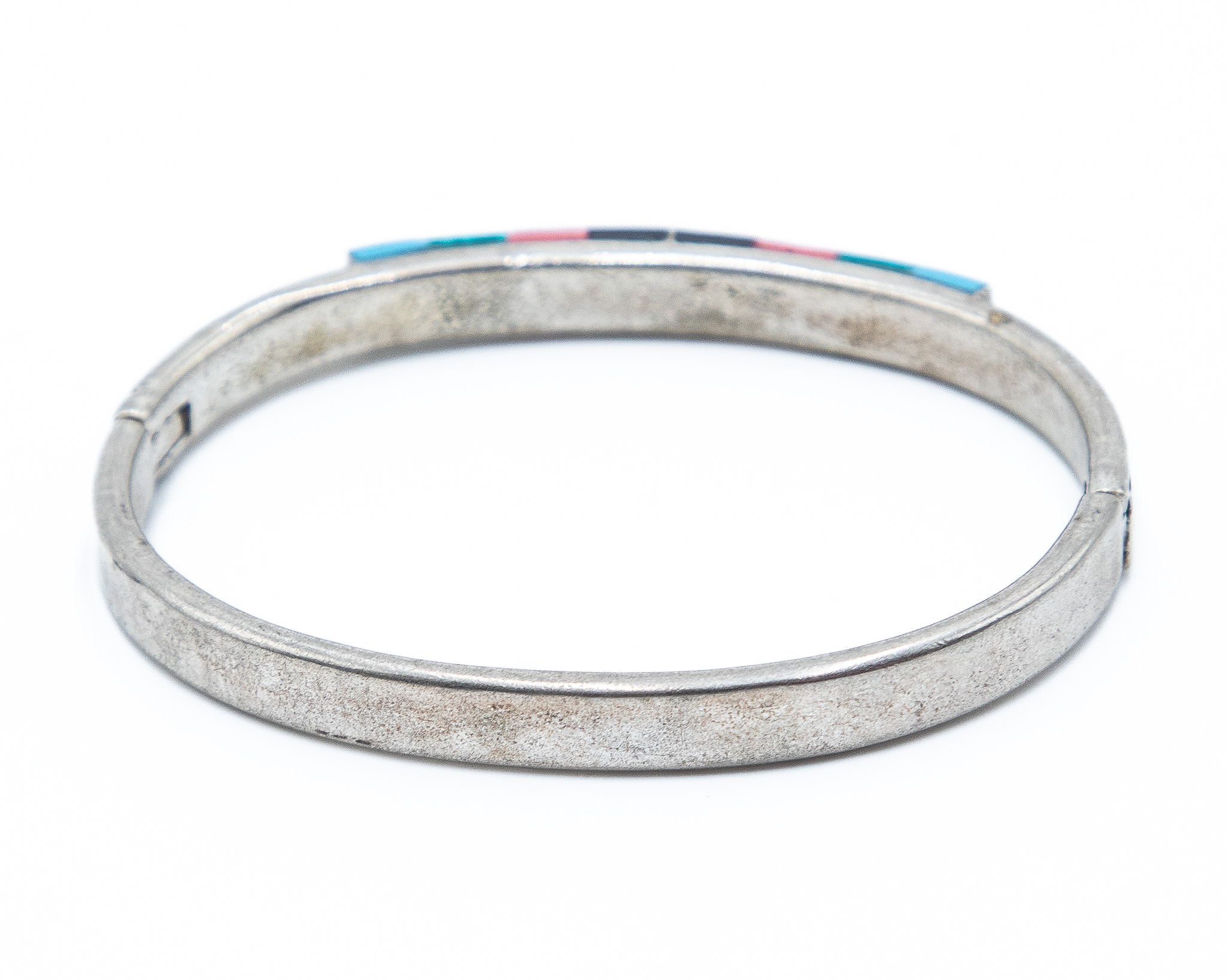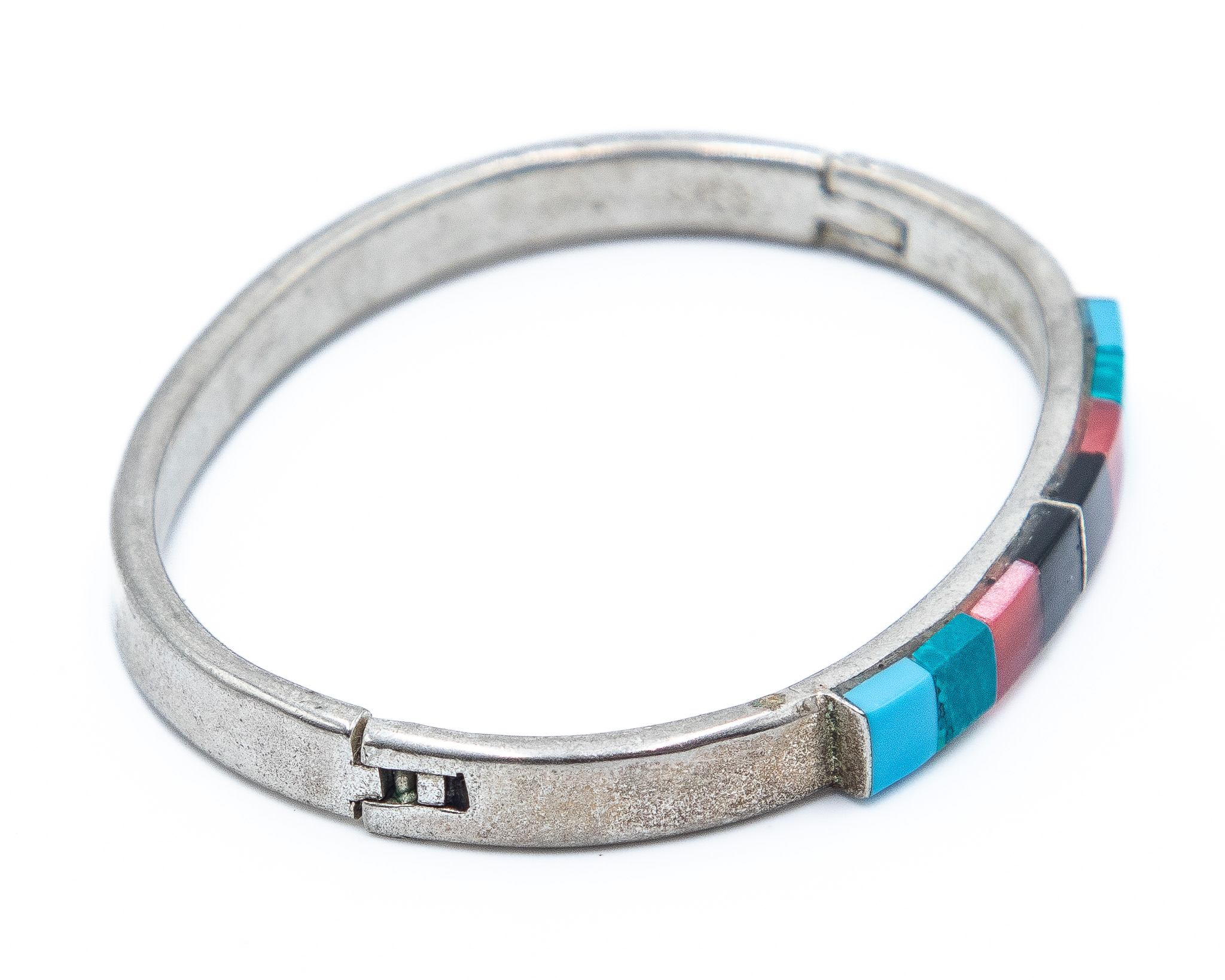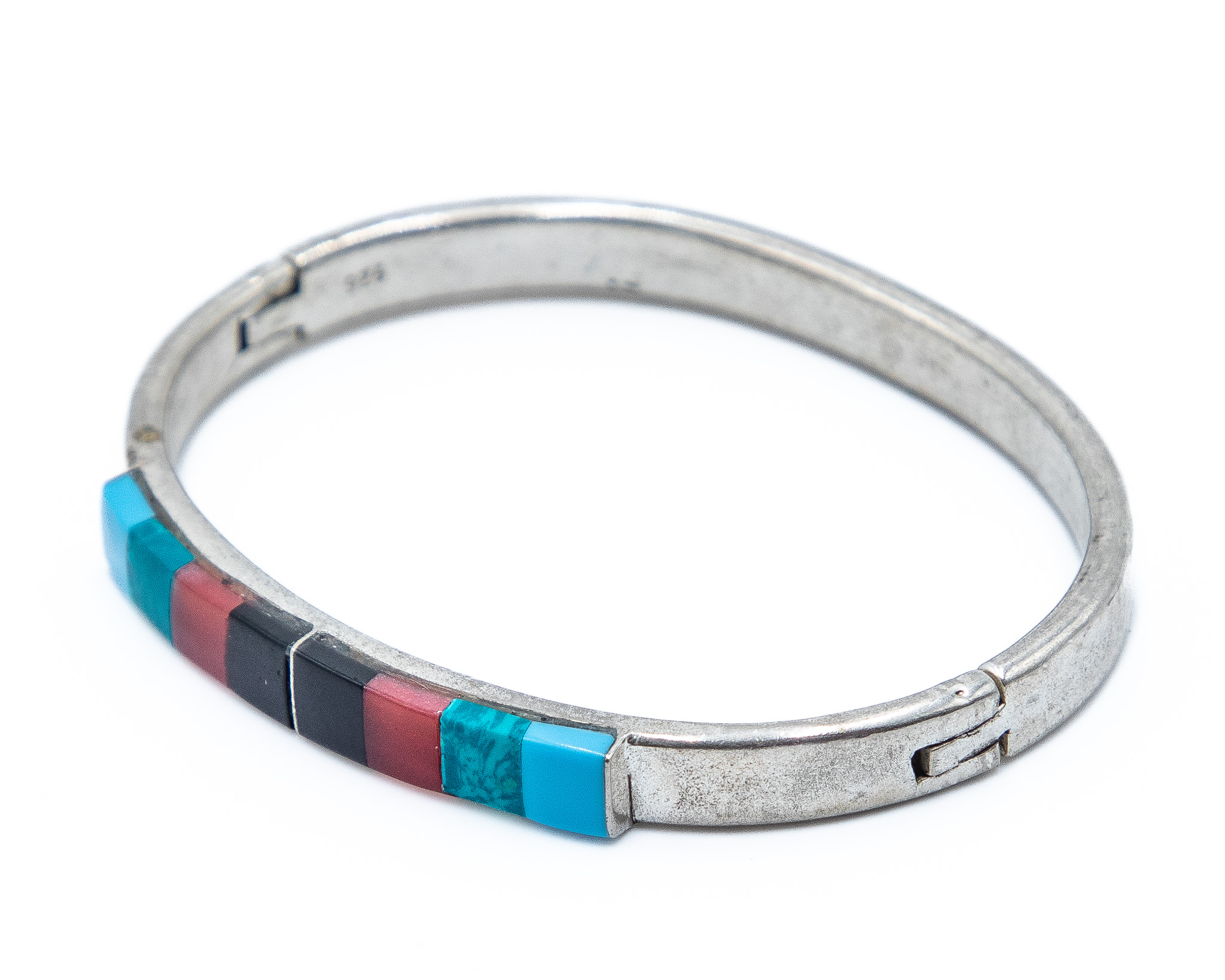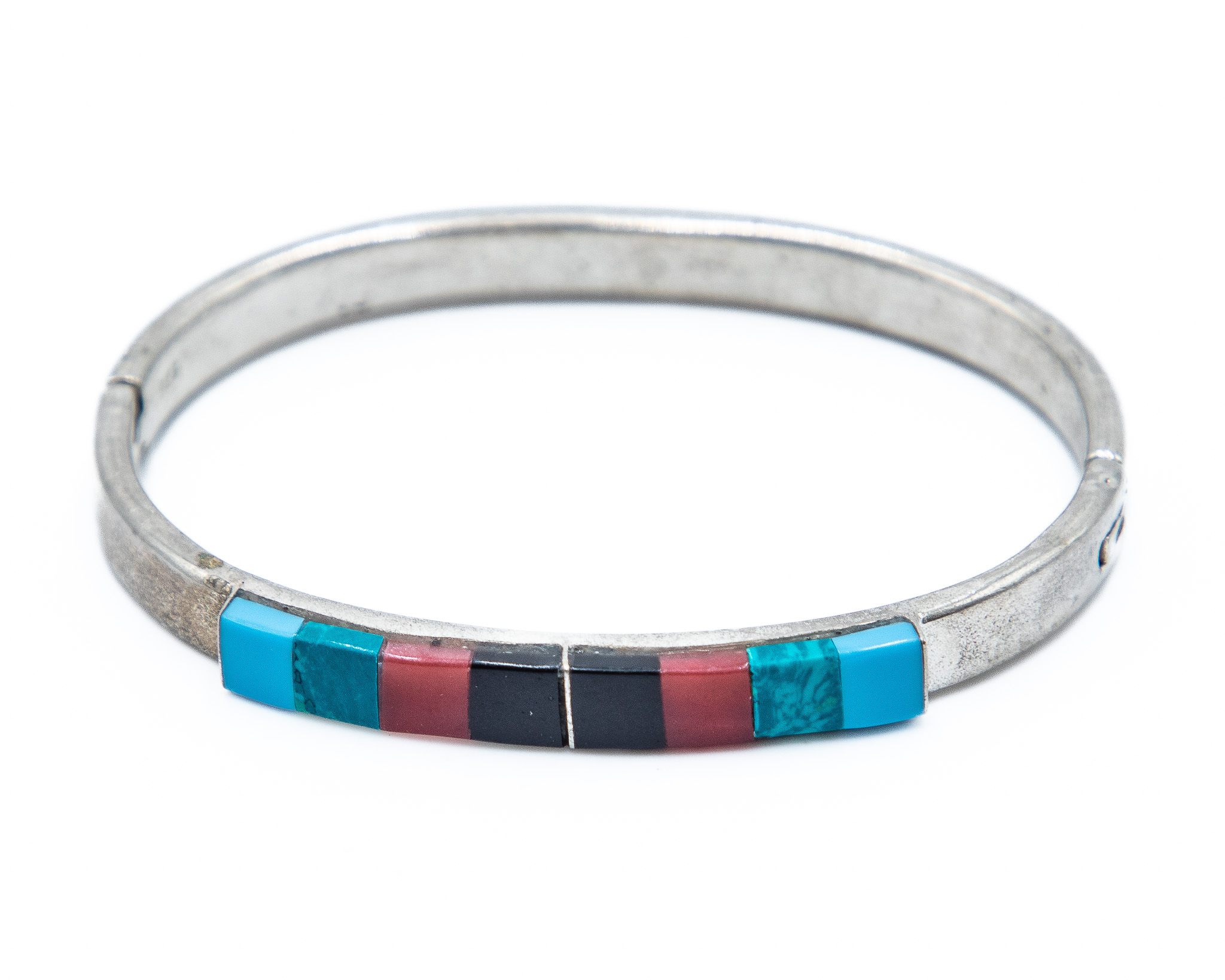 Southwestern Onyx Coral Turquoise Sterling Raised Inlay Hinge Bangle Bracelet 26g