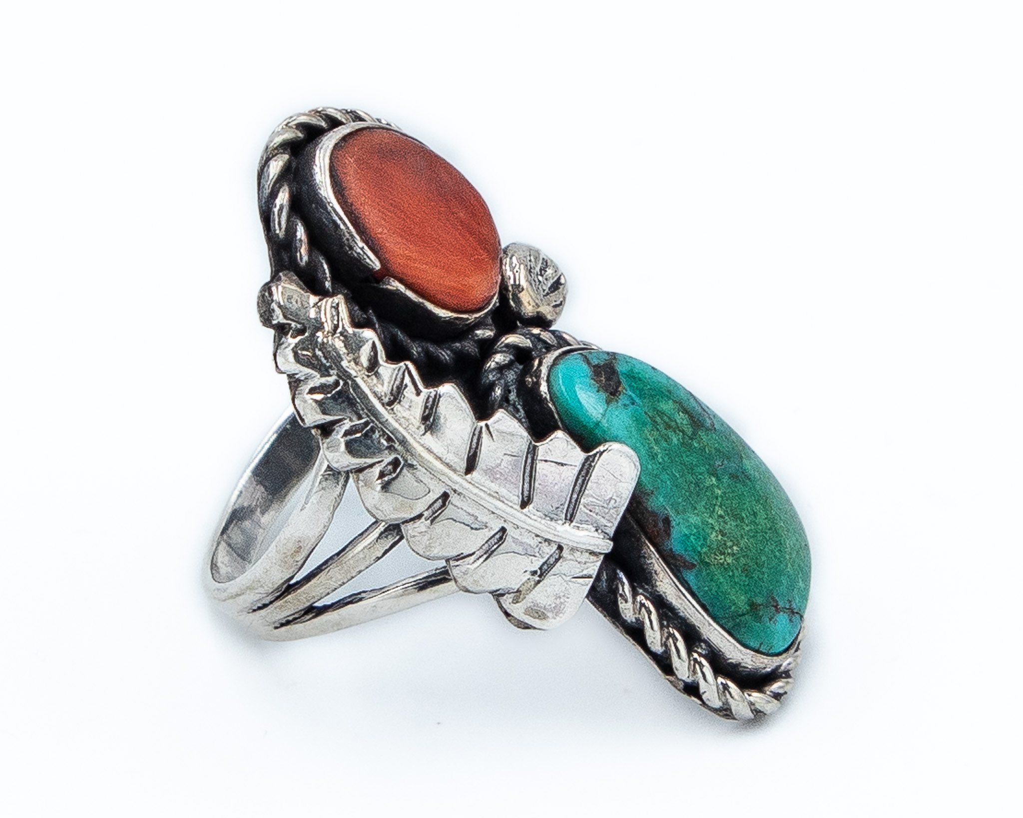 Vintage Navajo Coral Turquoise Sterling Ring Sz 7.25, 10g