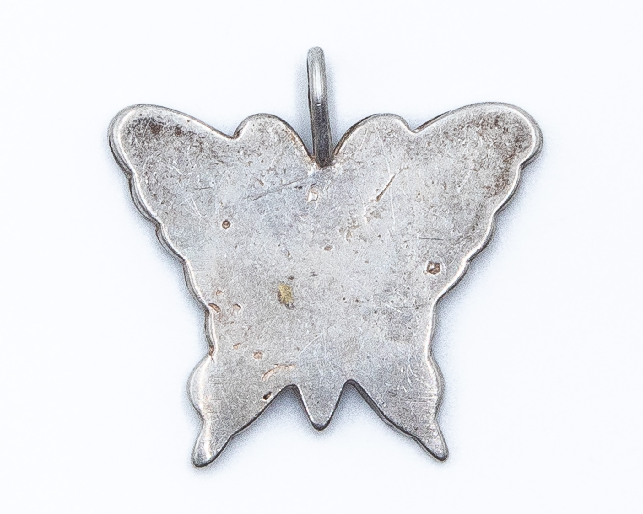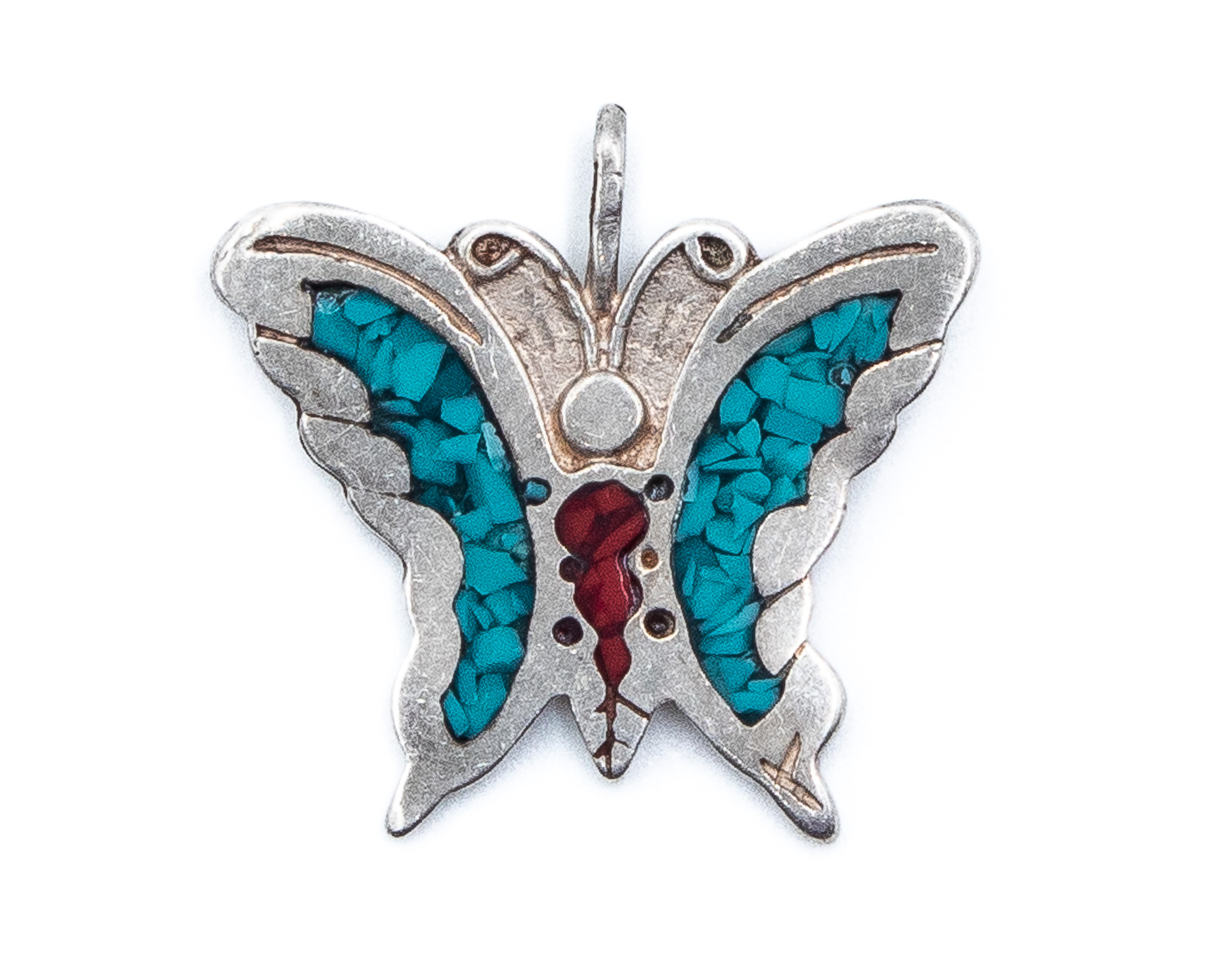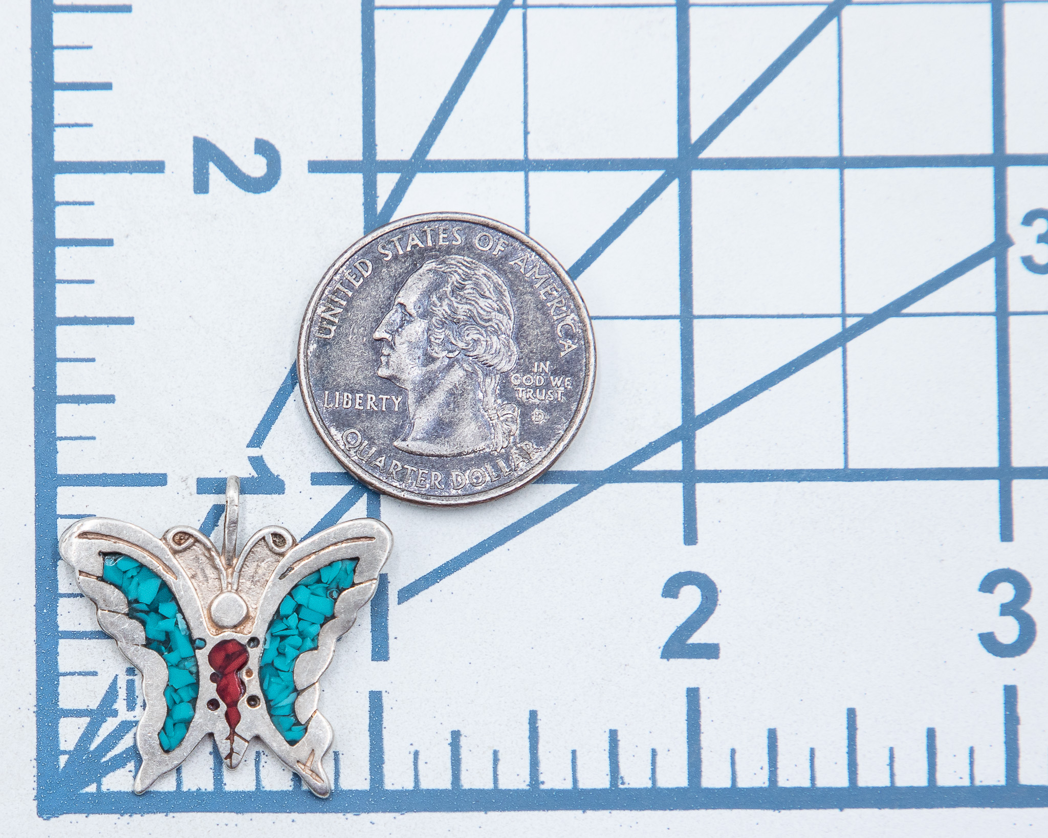 Vintage Navajo Crushed Turquoise Coral Sterling Butterfly Pendant 5g