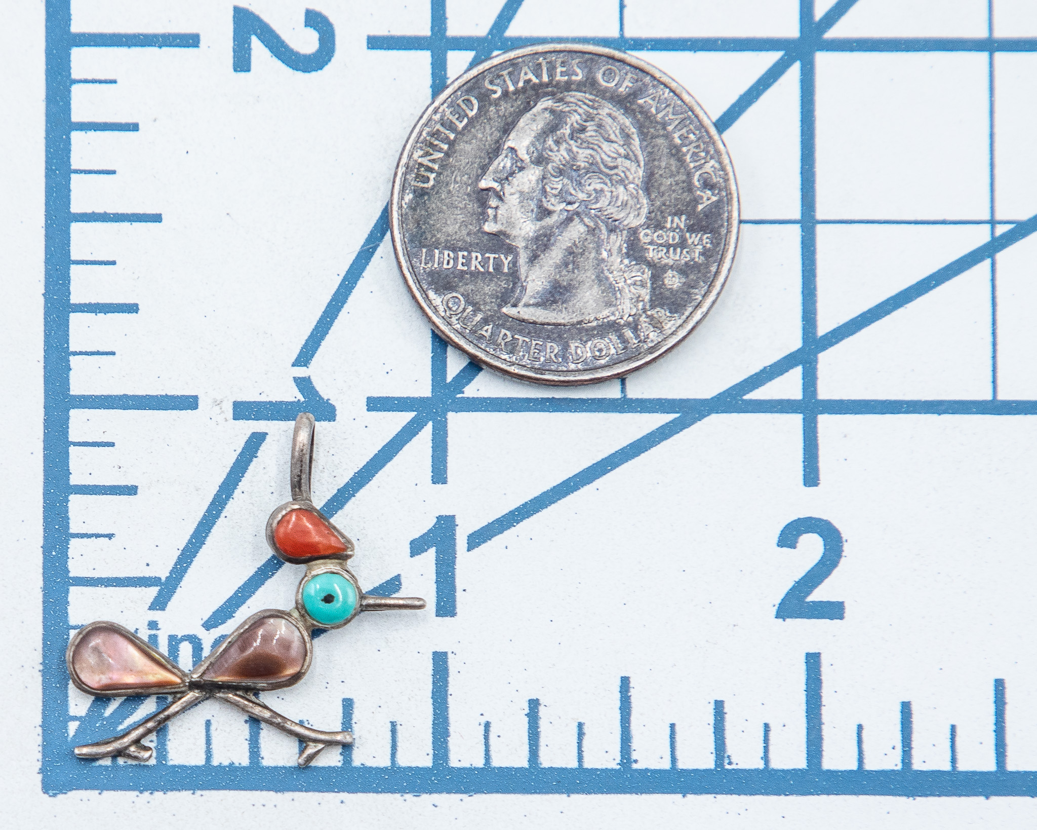 Vintage Zuni Turquoise Coral Abalone Sterling Inlay Roadrunner Pendant 1.5g