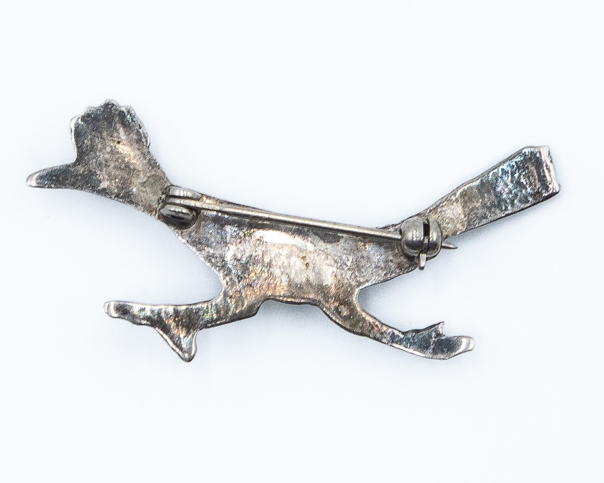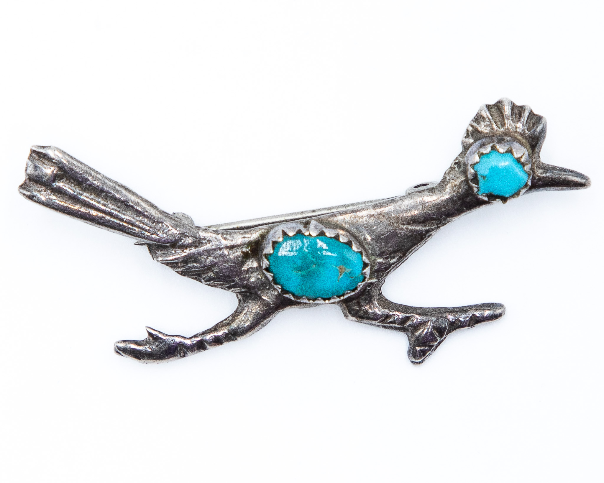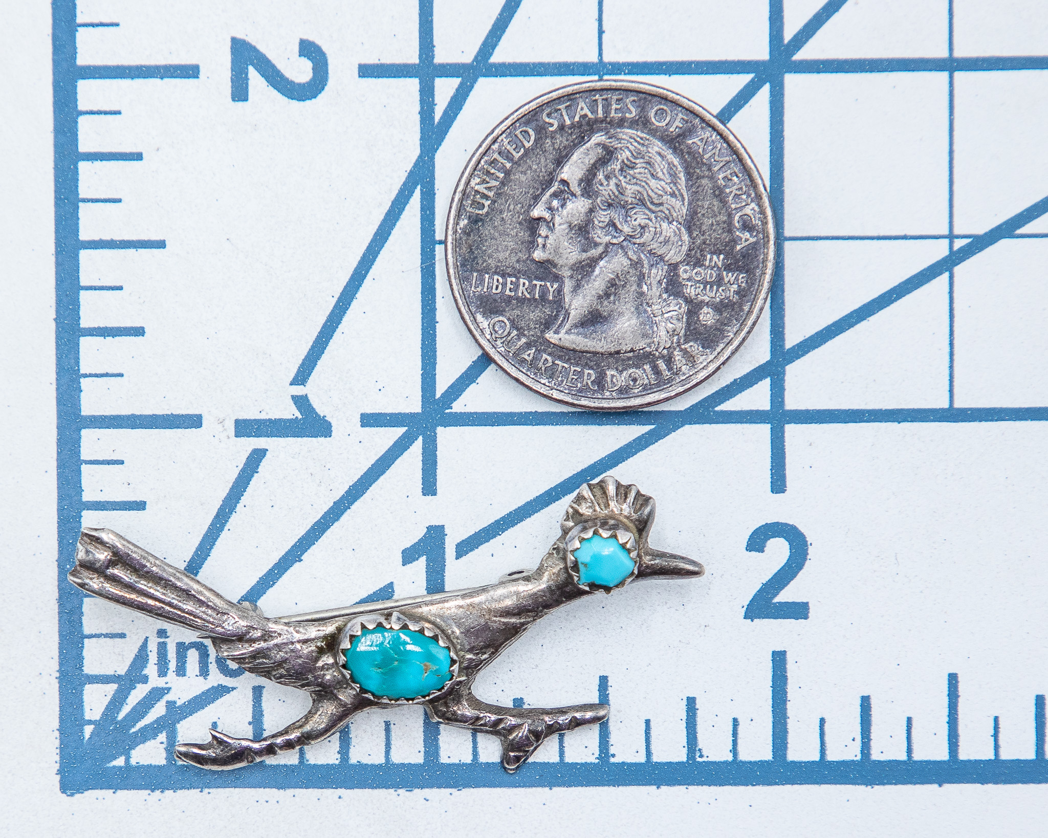 Vintage Navajo Turquoise Sand Cast Silver Roadrunner Brooch 5g