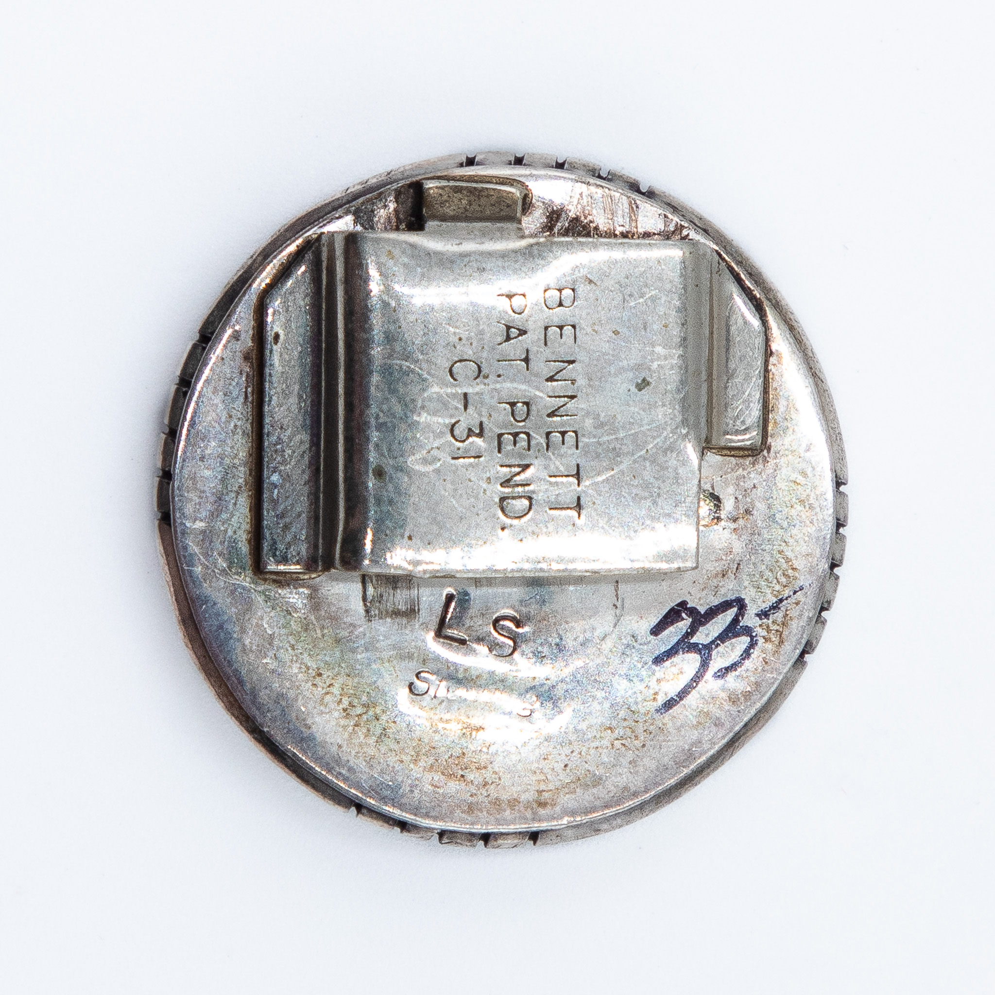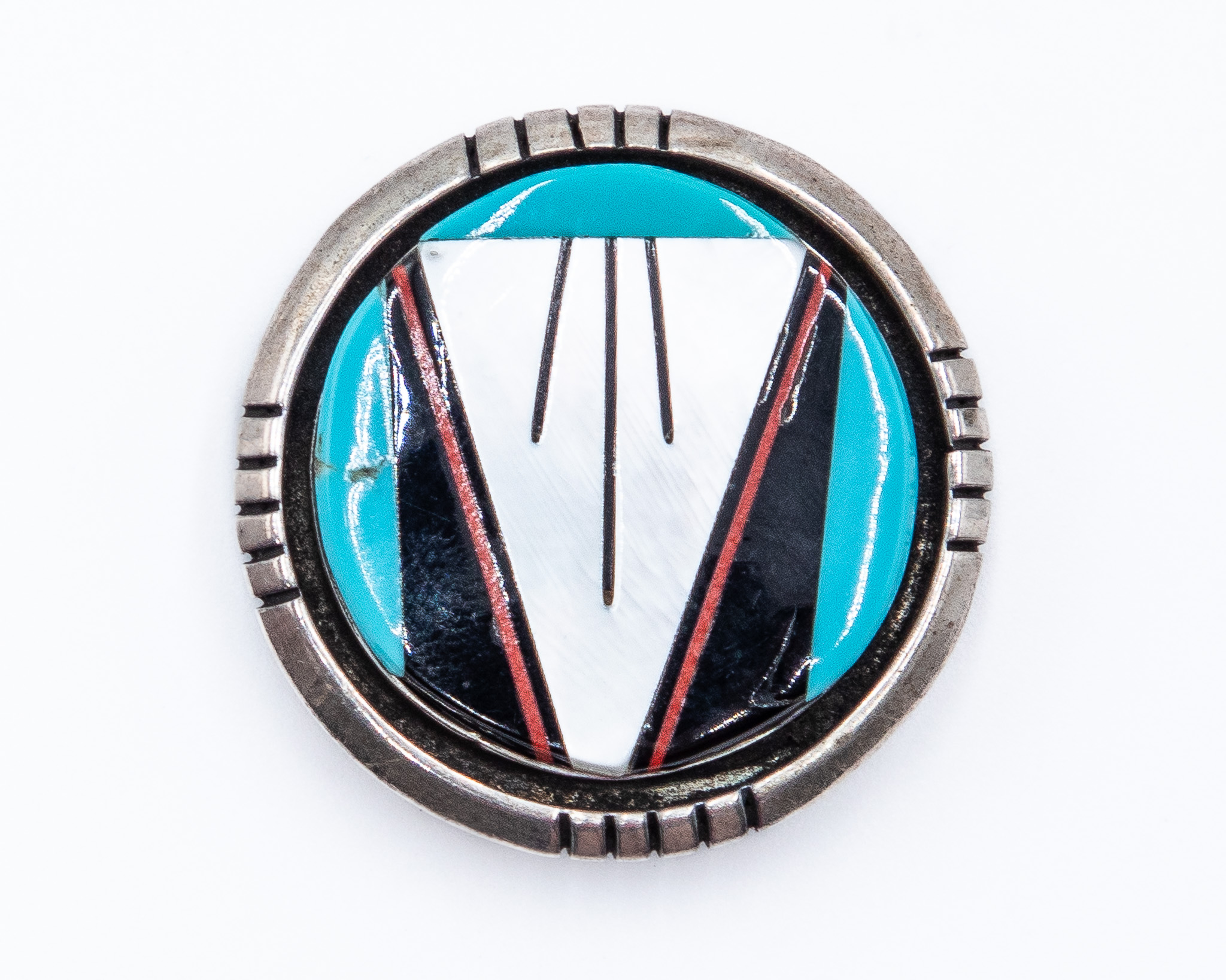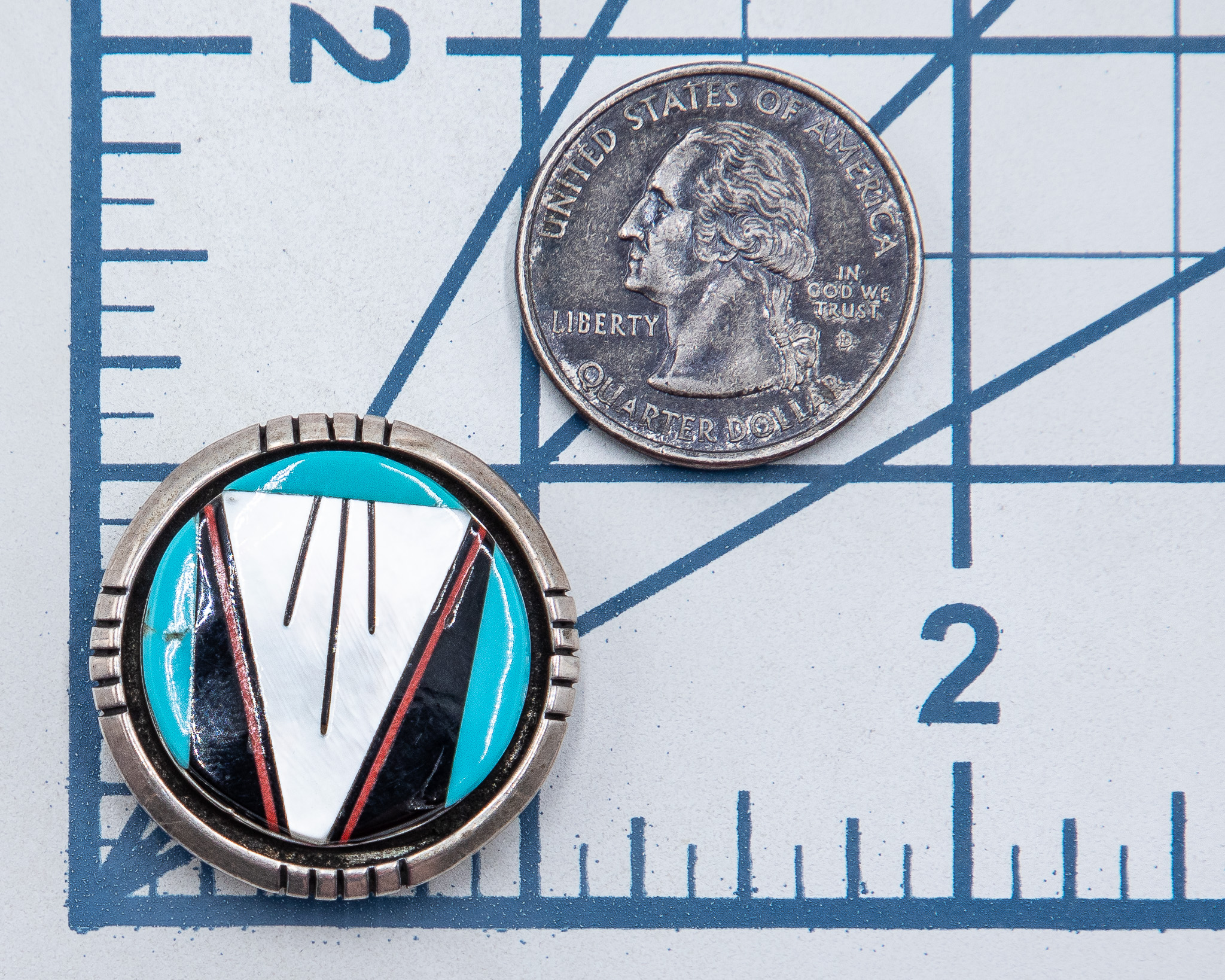 Signed LS Navajo Multi Stone Sterling Inlay Bolo Tie Clasp 9g-Coral, Mother of Pearl, Turquoise, Onyx