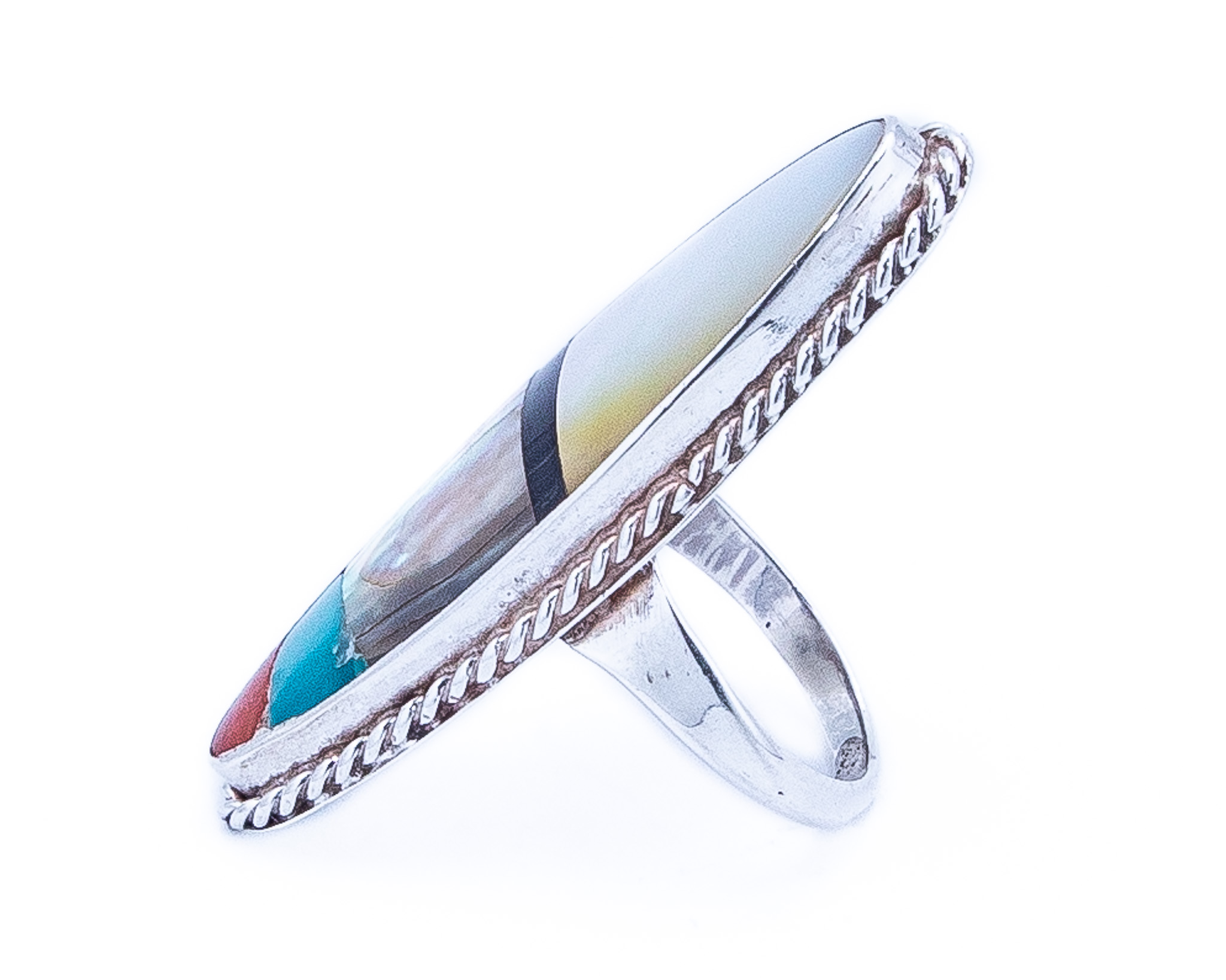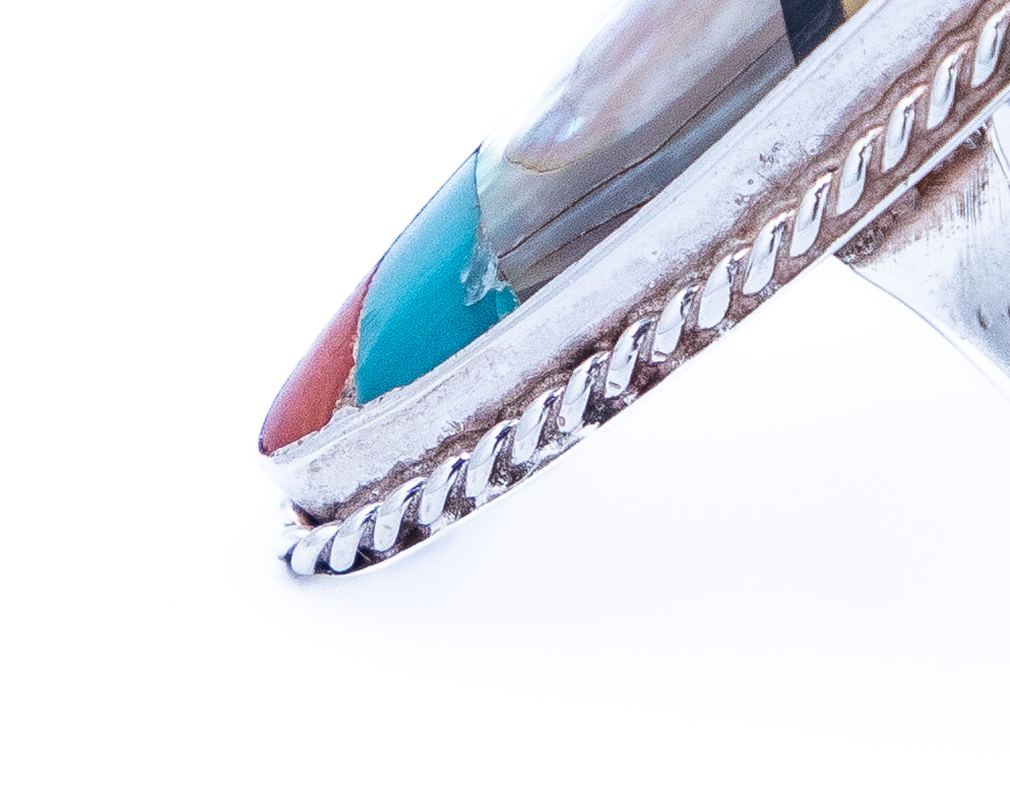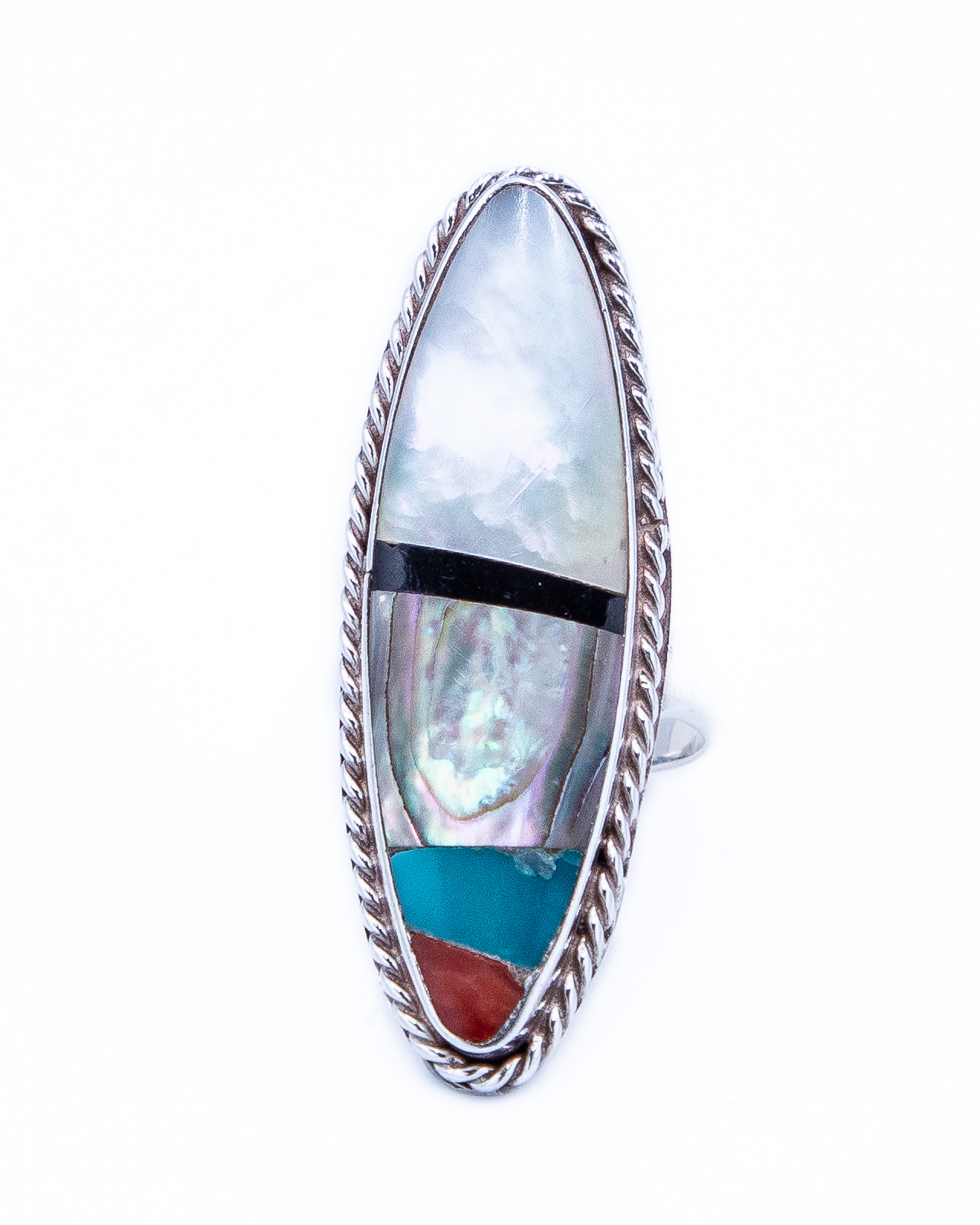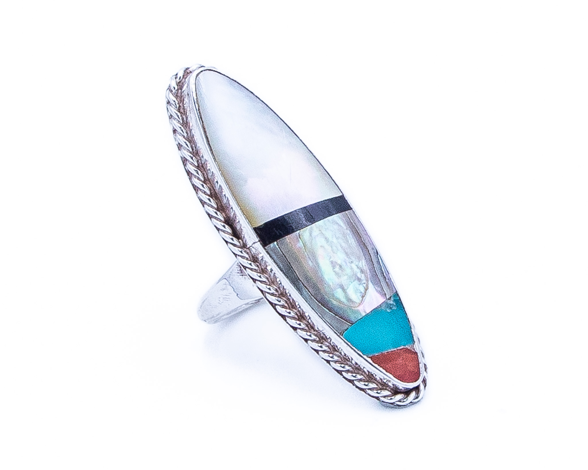 Vintage Zuni Multi Stone Sterling Inlay Ring Sz 5, 7g-Mother of Pearl, Coral, Turquoise, Onyx, Abalone