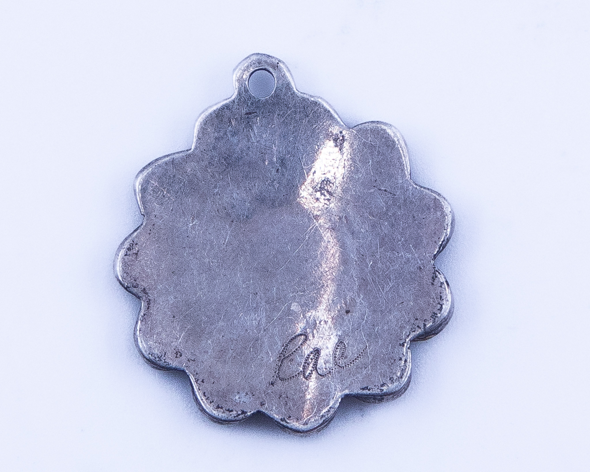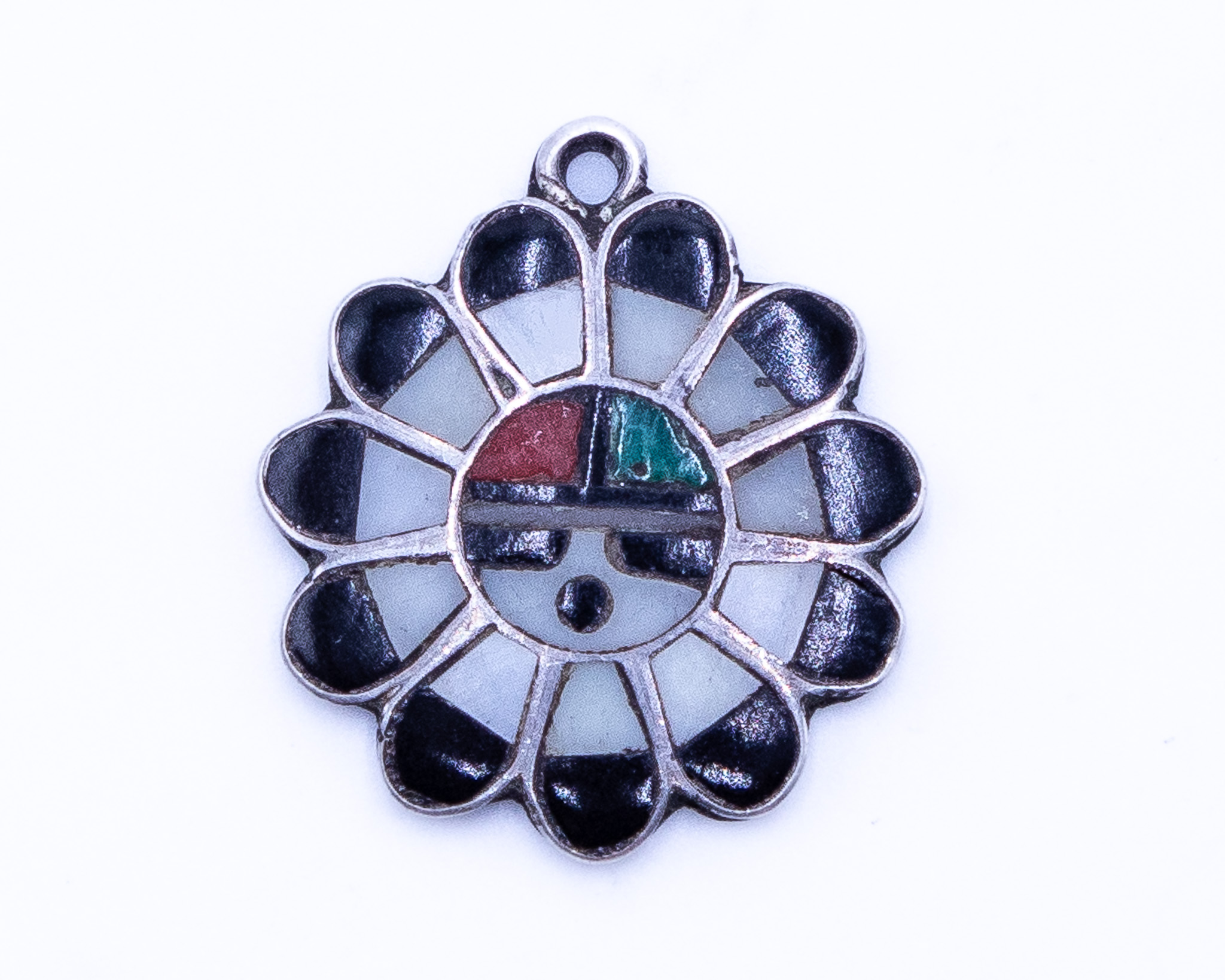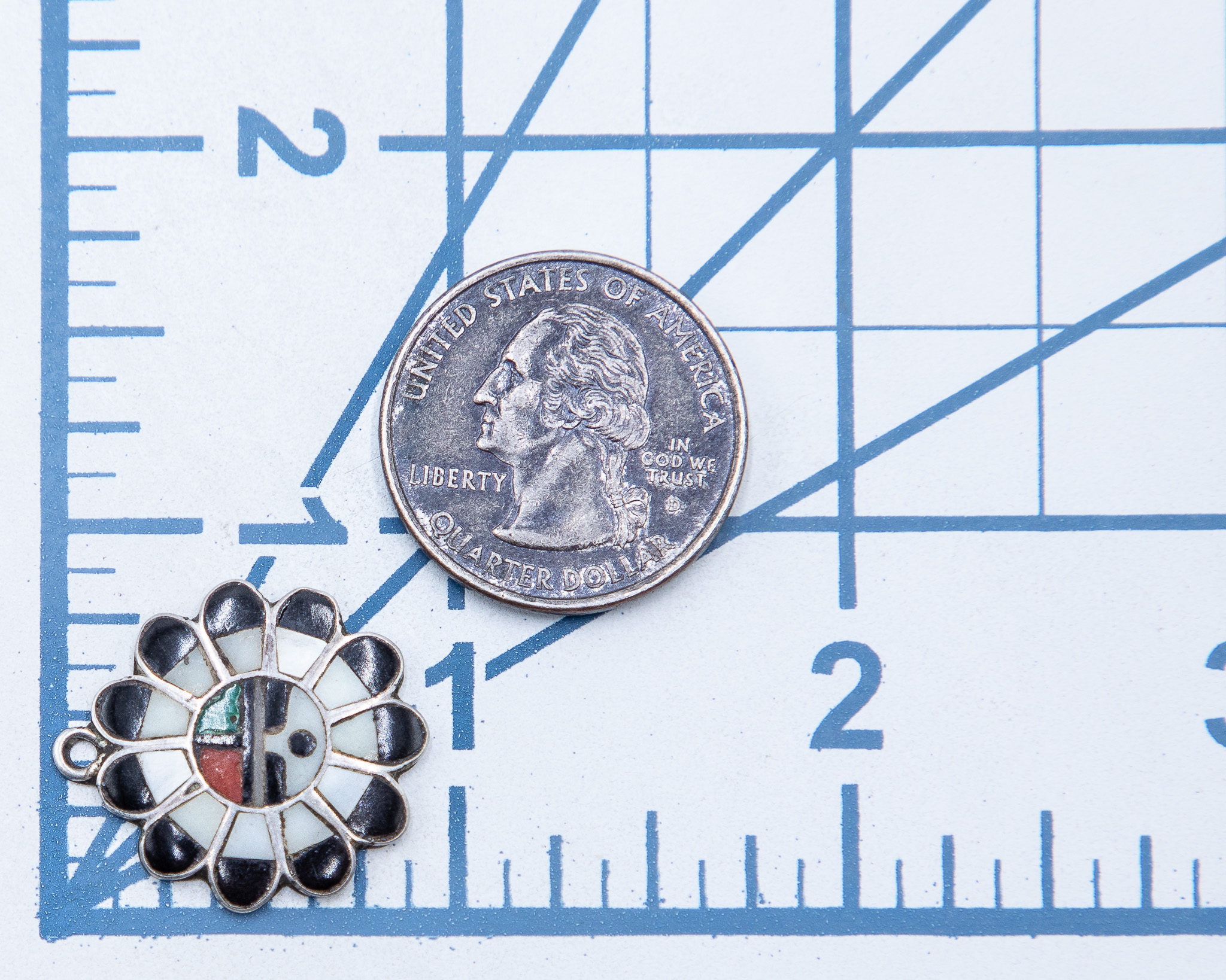 Signed Rae Zuni Multi Stone Sterling Inlay Sunface Pendant 3g-Coral, Green Turquoise, Mother of Pearl, Onyx