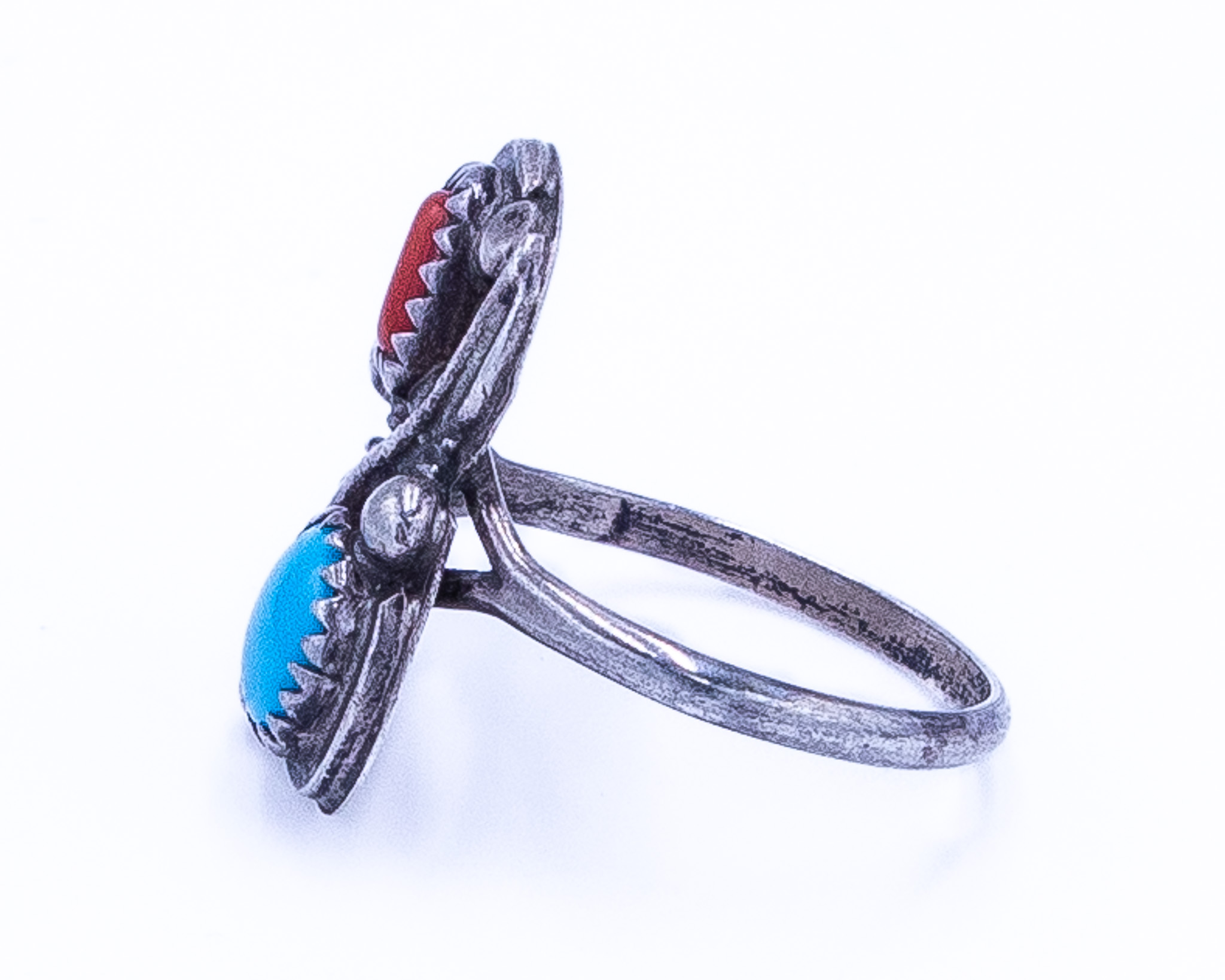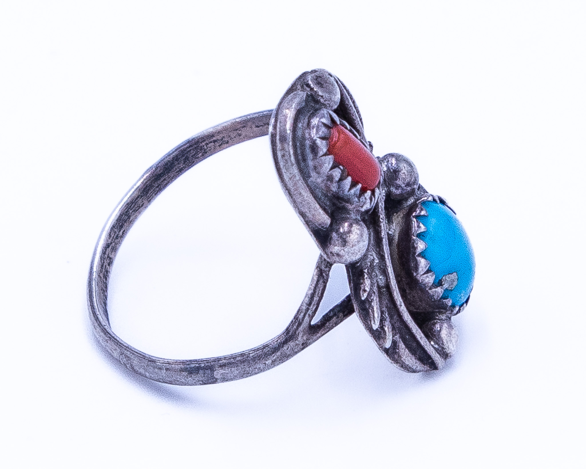 Signed RB Navajo Turquoise Coral Sterling Ring Sz 8.5, 4g