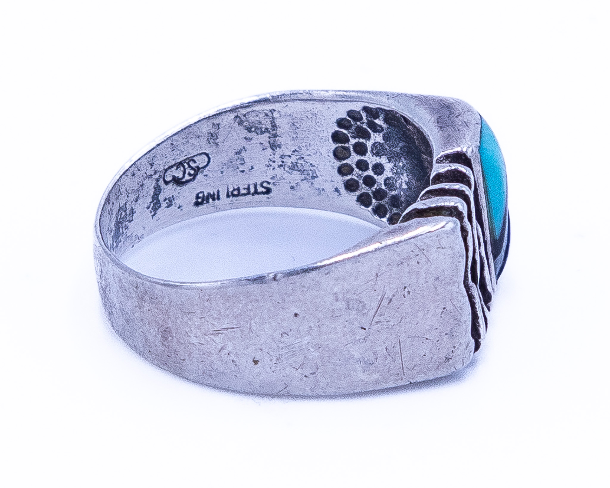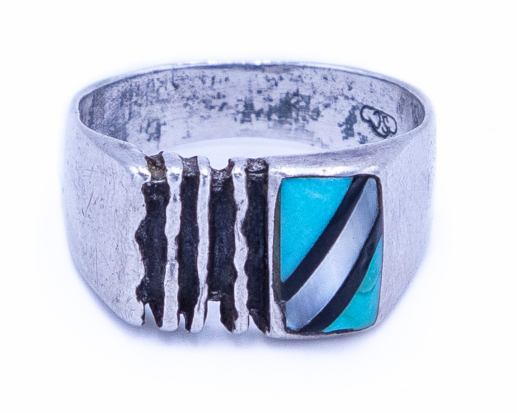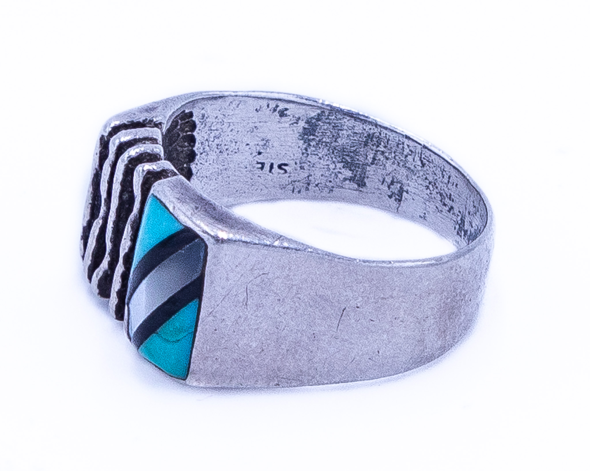 Silver Cloud Inc Mother Of Pearl Onyx Turquoise Sterling Inlay Ring Sz 9.5, 5g