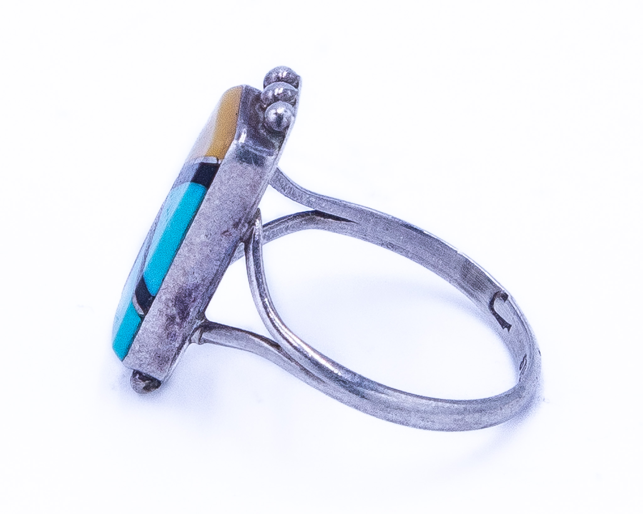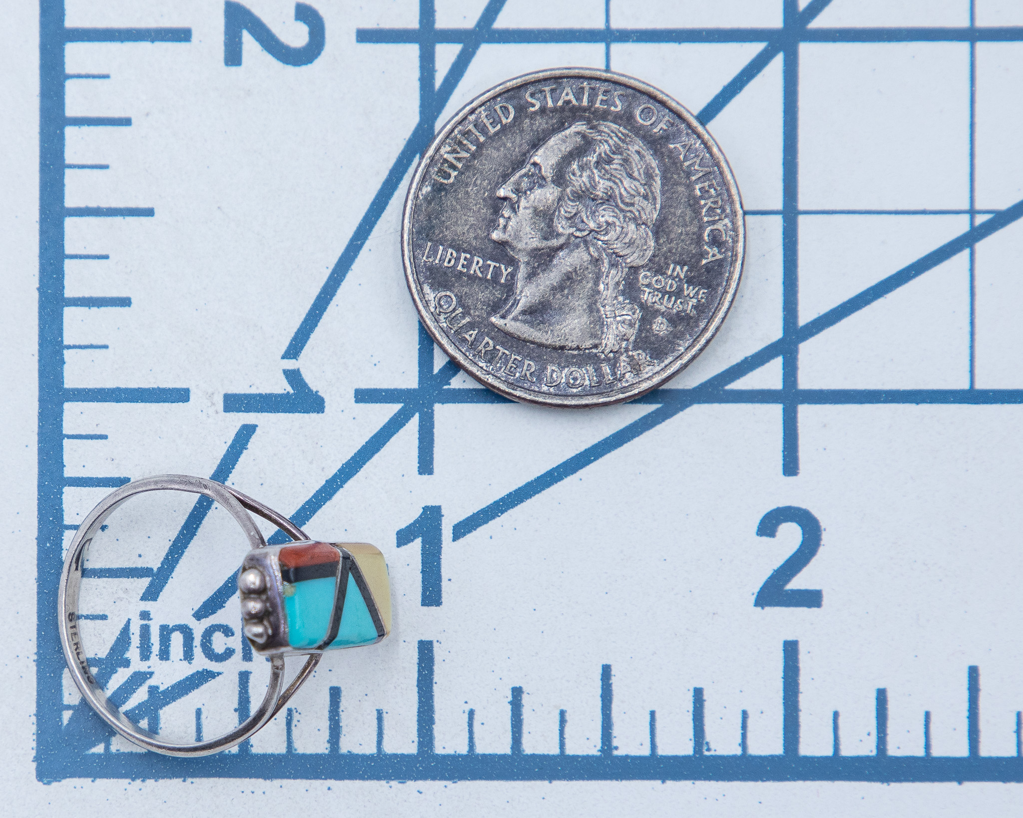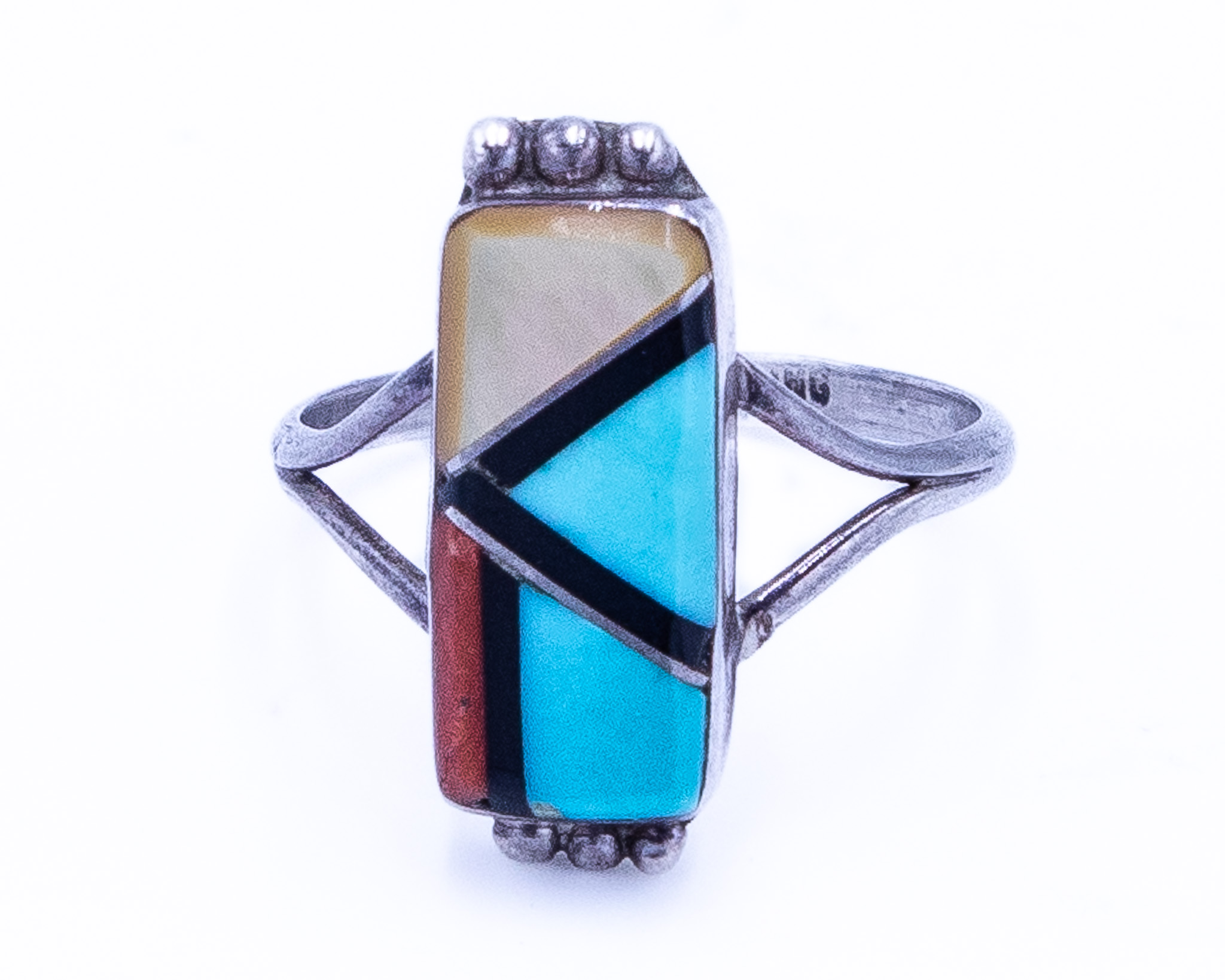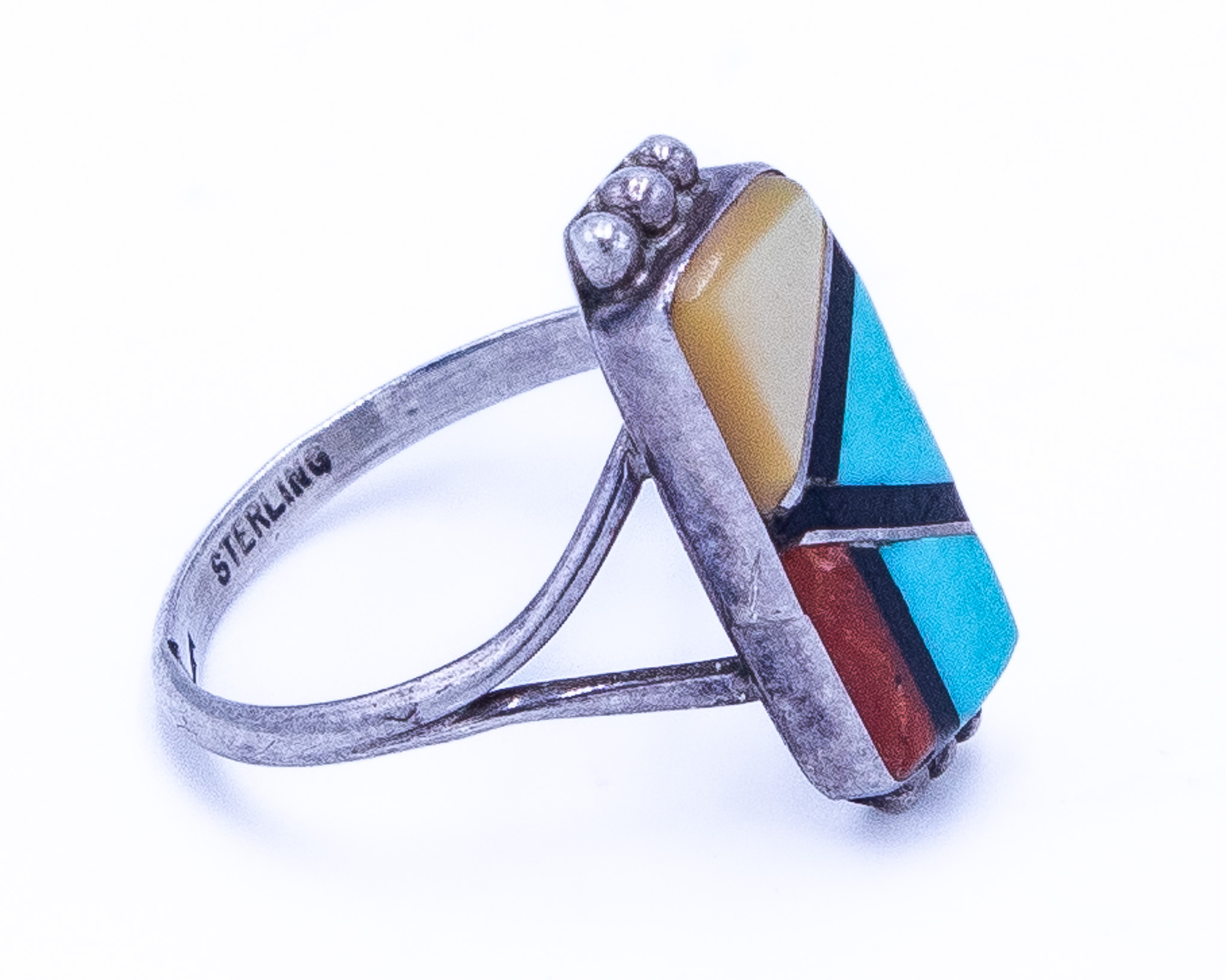 Signed J Zuni Multi Stone Sterling Raised Inlay Ring Sz 7, 2.5g-Mother of Pearl, Turquoise, Coral, Onyx
