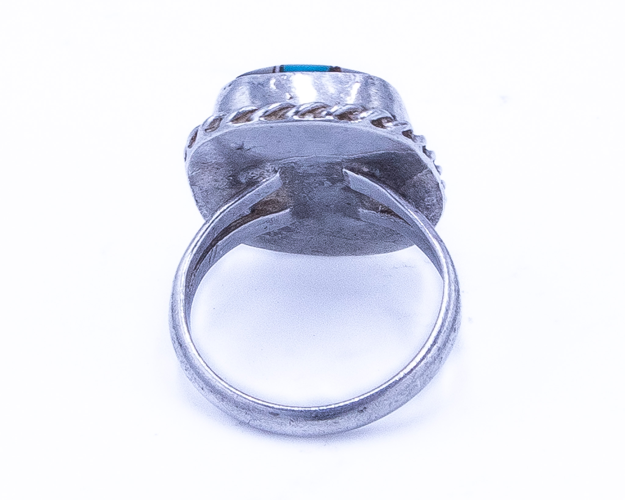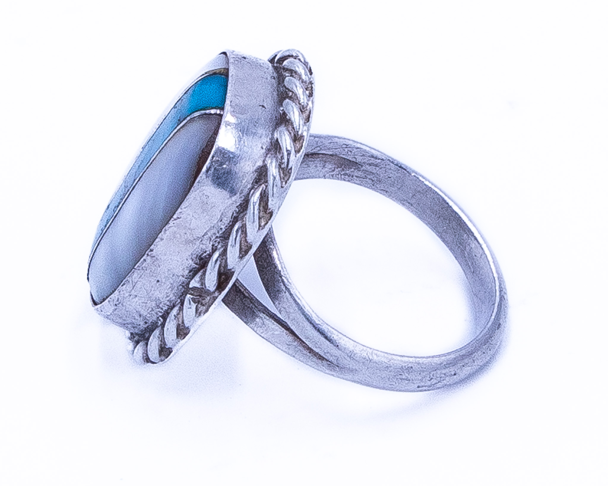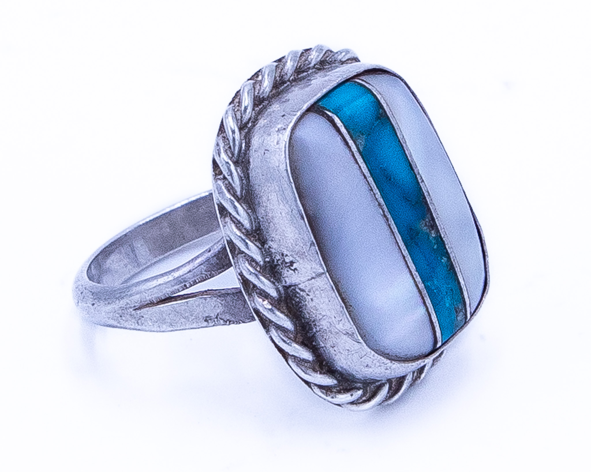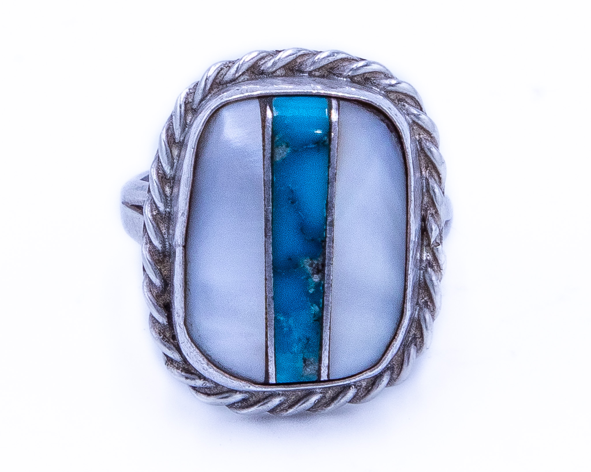 Zuni Mother Of Pearl Turquoise Sterling Inlay Ring Sz 6.75, 6.5g