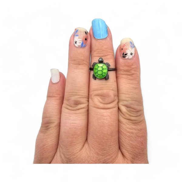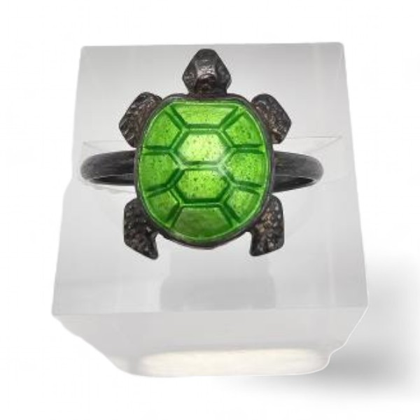Denmark MEKA Guilloche Enamel Sterling Silver Green Turtle Adjustable Ring 2.5 G