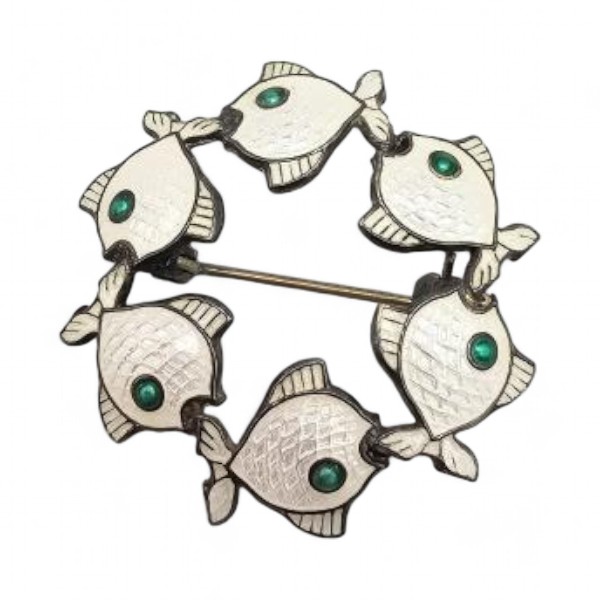 Denmark VB Volmer Bahners Guilloche Enamel Sterling Silver White Fish Circle Brooch 7.1 G