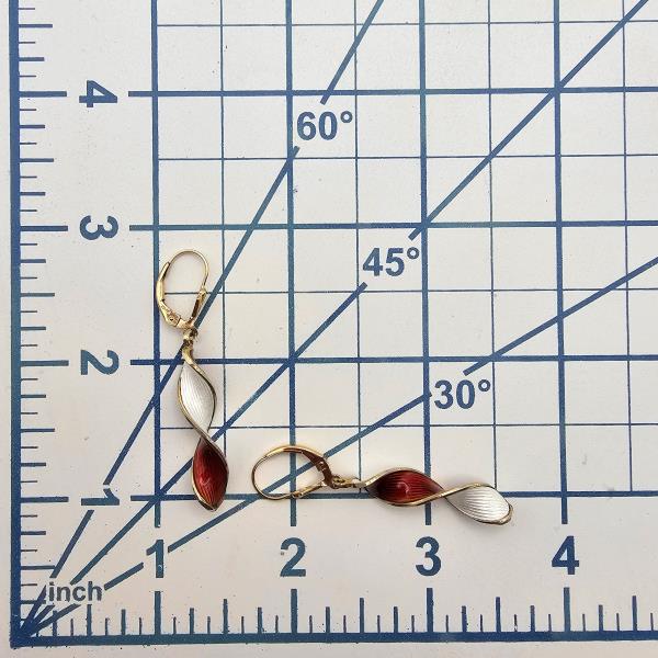14K Gold Filled Guilloche Enamel Red and White Spiral Drop Dangle Earrings 4.3 G
