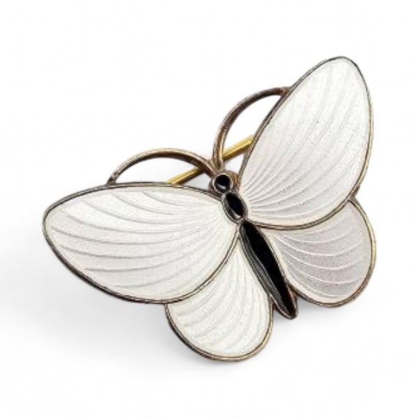 Norway Aksel Holmsen Guilloche Enamel Sterling Silver White Butterfly Brooch 4.2 G