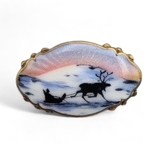 Norway Albert Scharning Guilloche Enamel Sterling Silver Reindeer Scene Scalloped Brooch 5.5 G