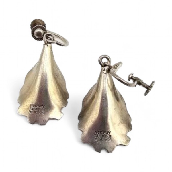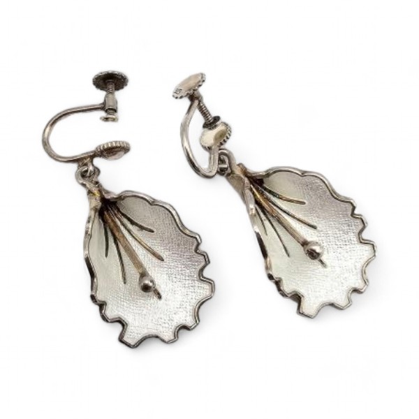 Norway Aksel Holmsen Guilloche Enamel Sterling Silver White Flower Earrings 6.9 G