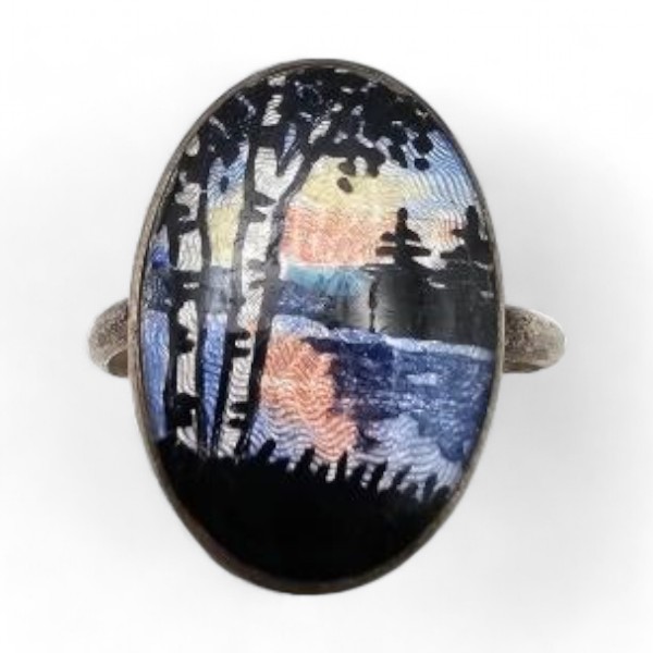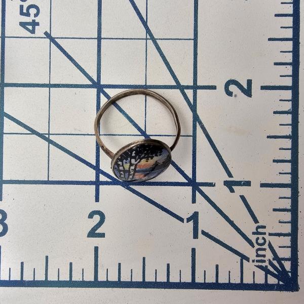 Signed Guilloche Enamel Sterling Silver Coast Scene Ring Sz. 8.75 2.6 G