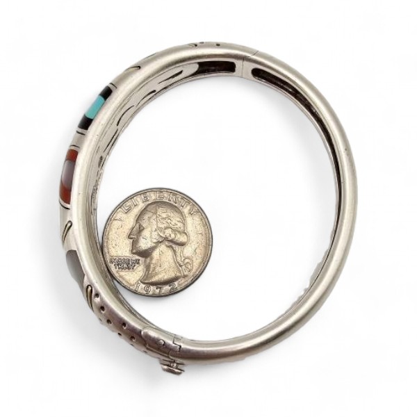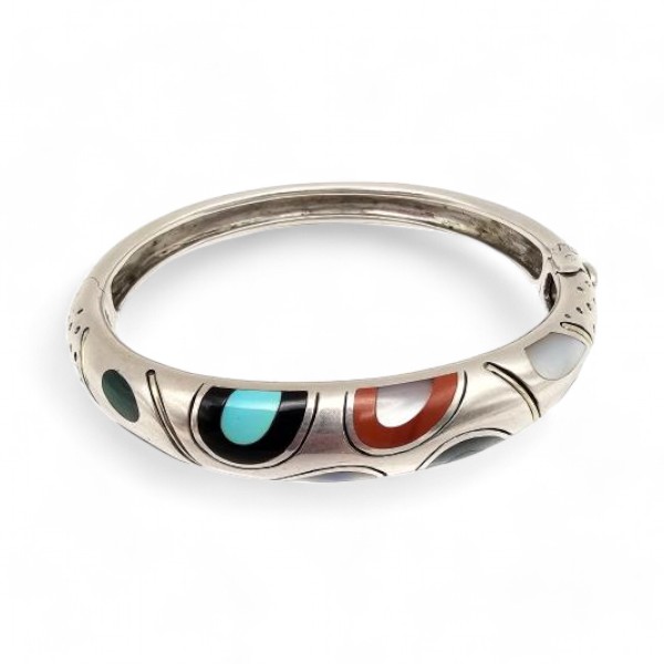 Asch Grossbardt 18k Gold and Sterling Silver Inlay Mother Of Pearl, Onyx, Malachite, Turquoise, Coral Hinge Bangle Bracelet, 34.4g. Signed “AG”- Asch Grossbardt.