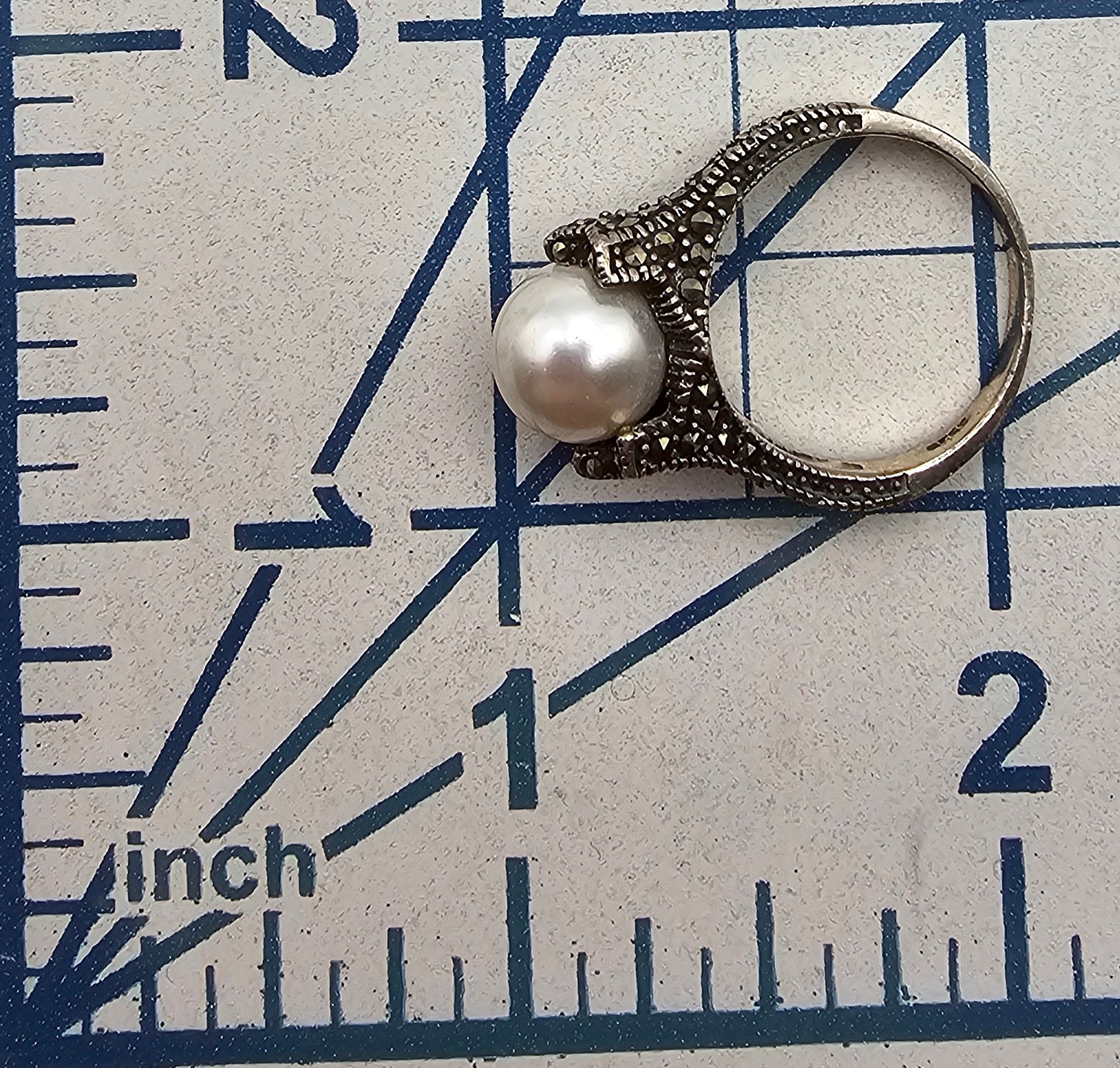 Pearl Marcasite Sterling Silver Cocktail Ring Size 5.75 4.5 G