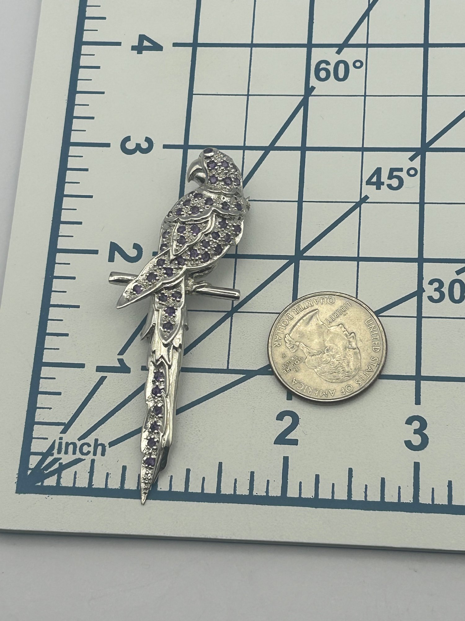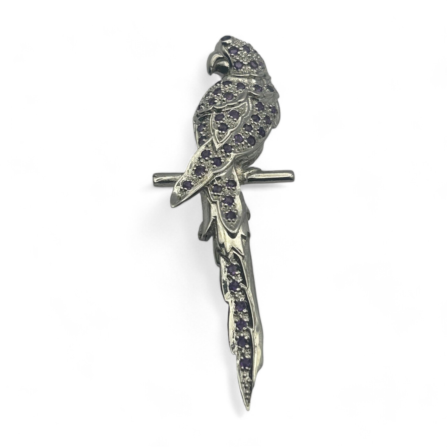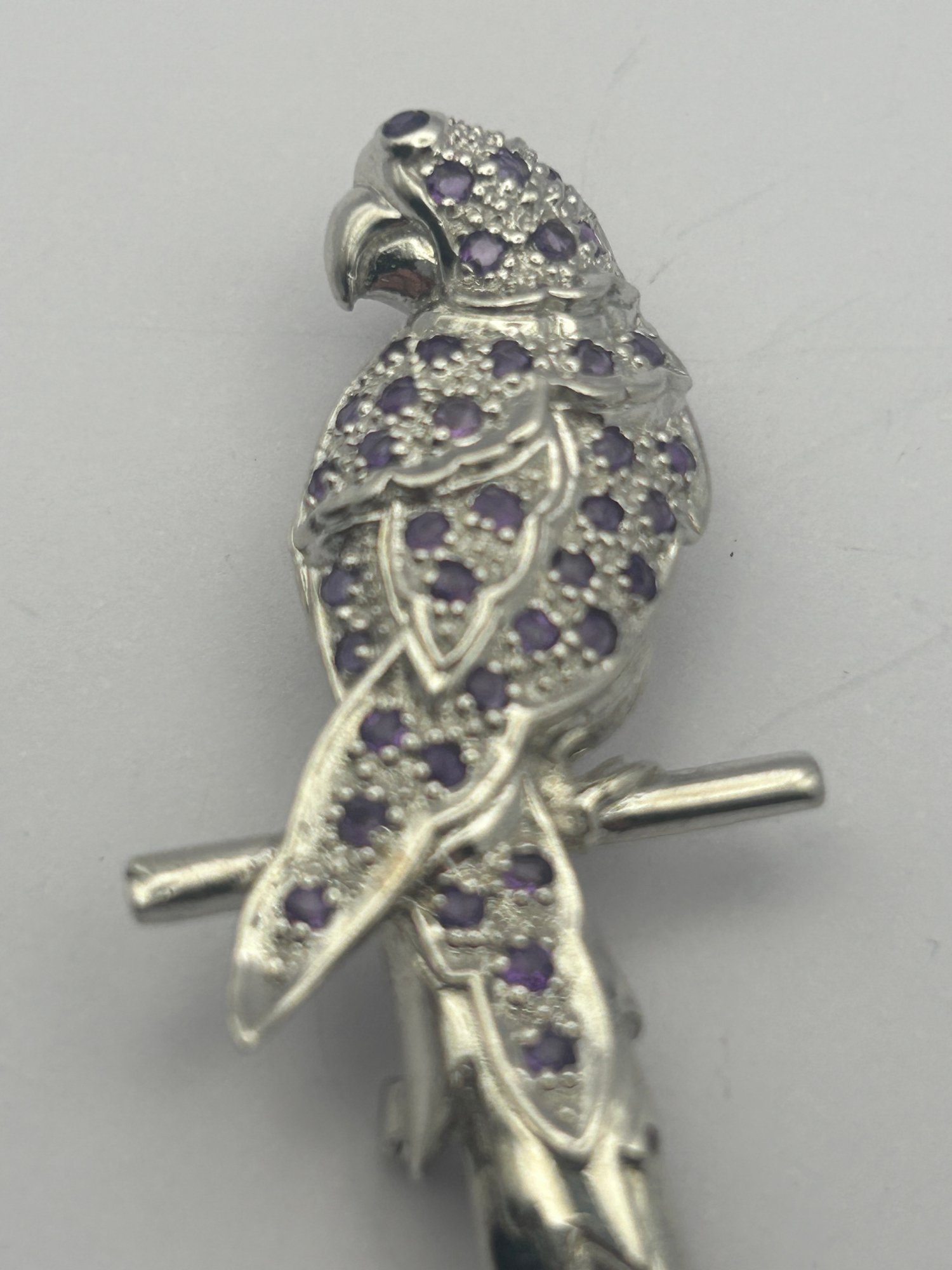 Sterling Silver Parrot Pin With Purple Stones. 11.53 G.