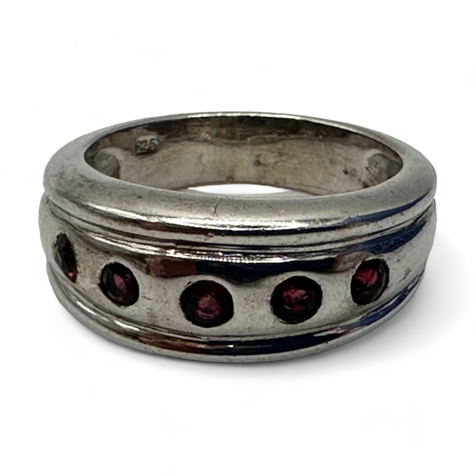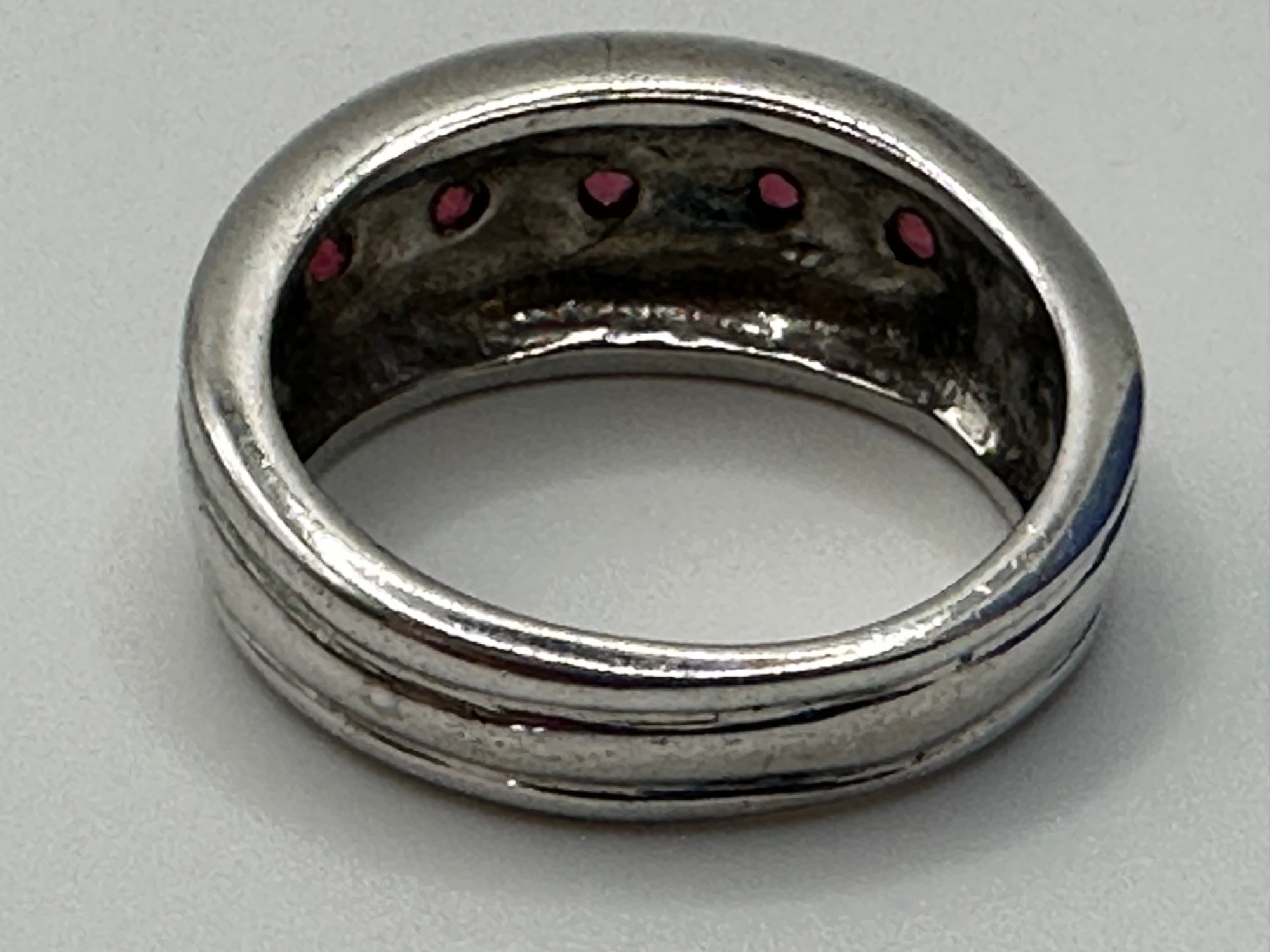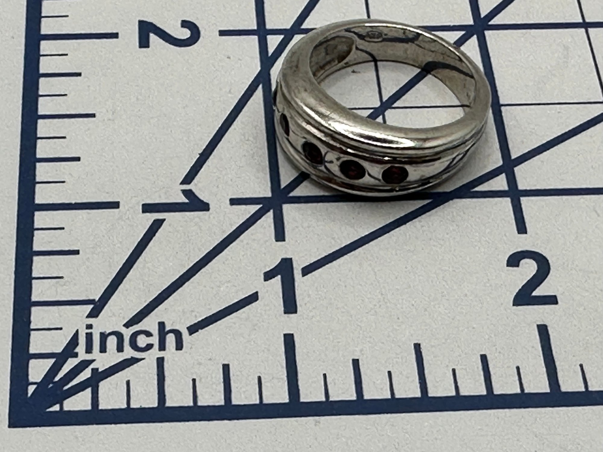Sterling Silver Band With Red Gems, Size 8. 7.84 G.