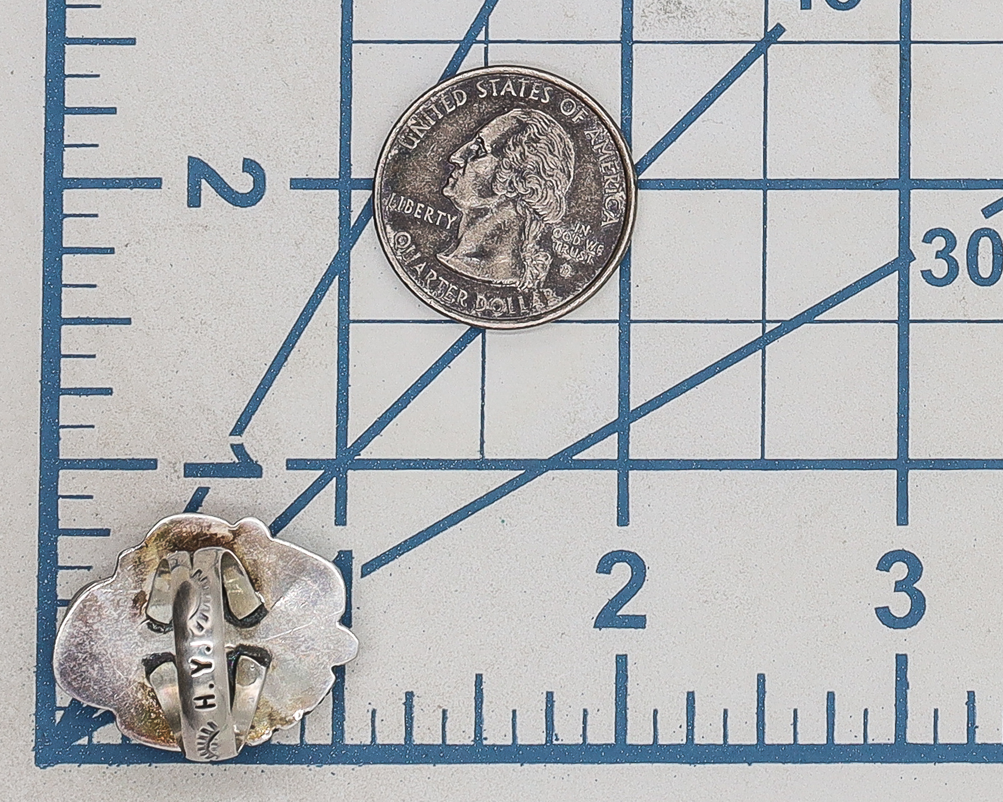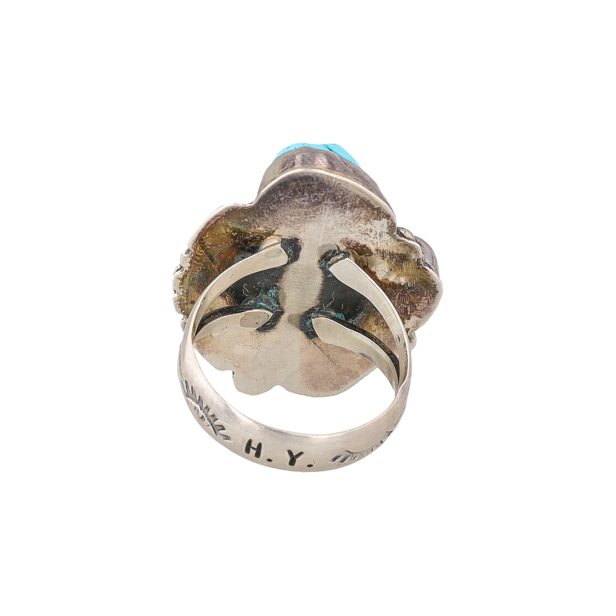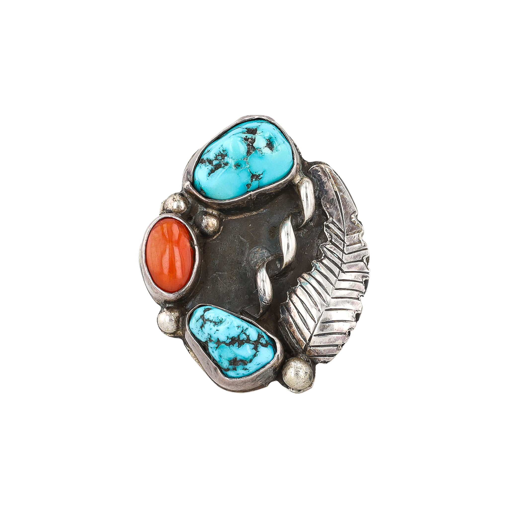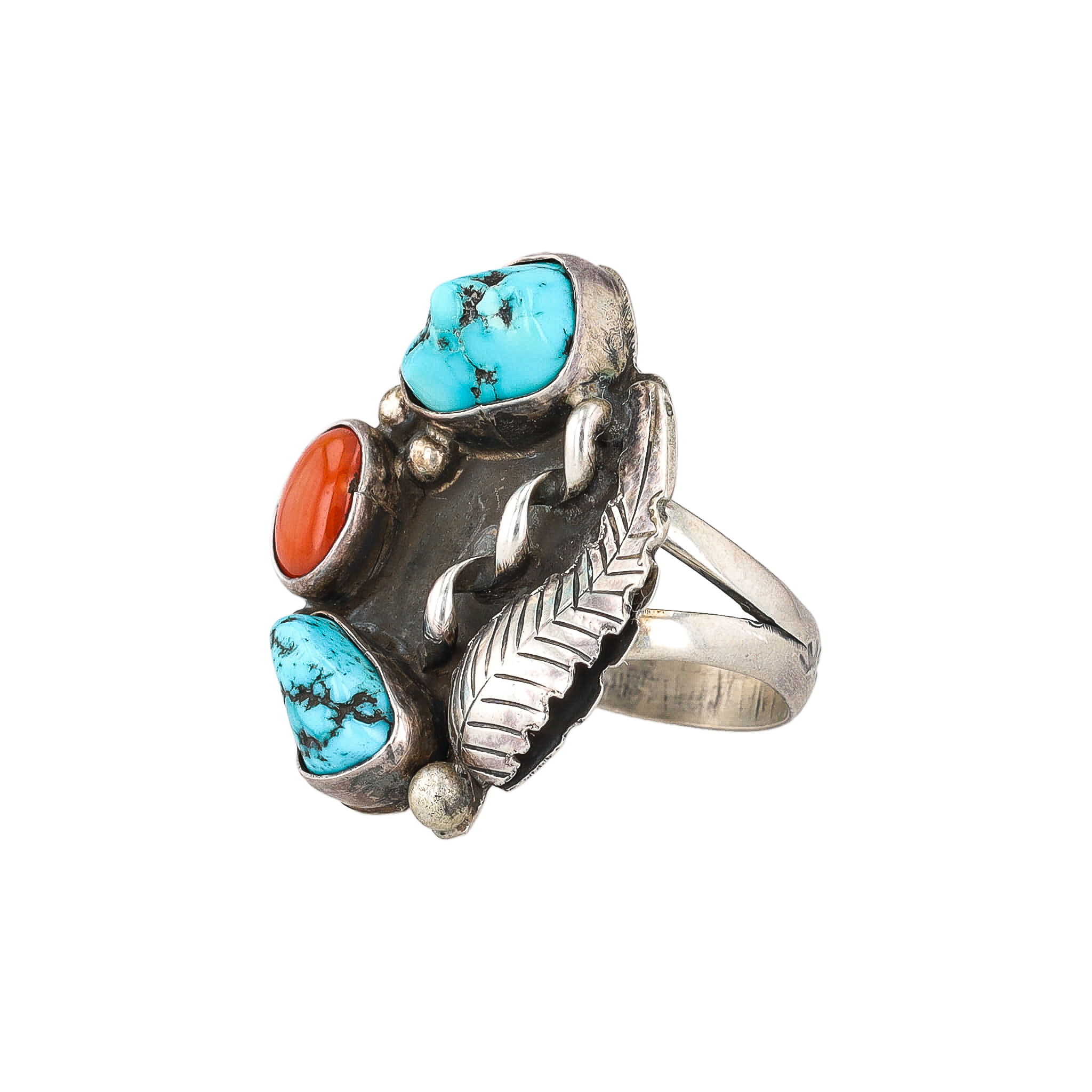 Signed H.Y. Navajo Coral Turquoise Sterling Leaf Ring Sz. 6, 6g