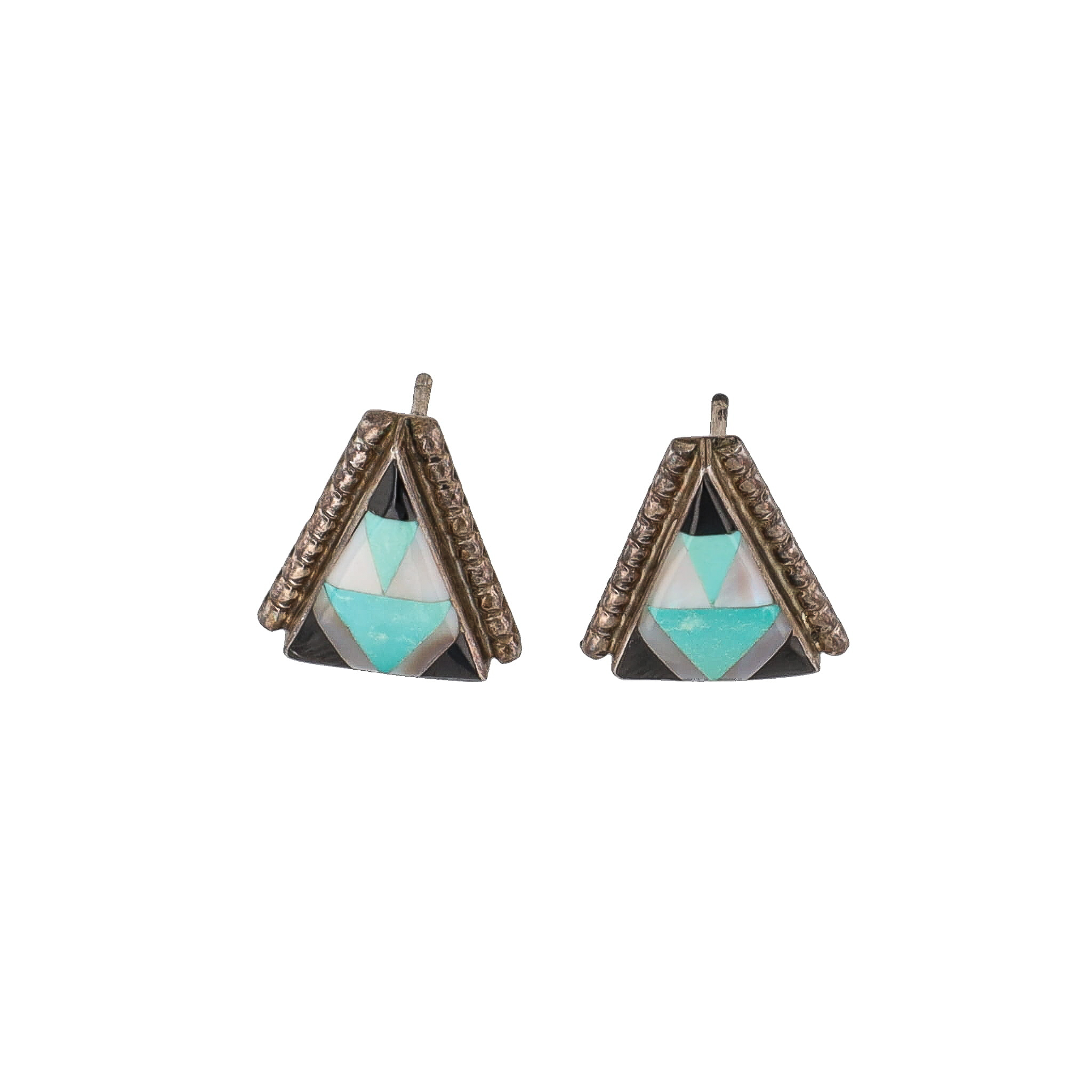 Vintage Zuni Mother Of Pearl Turquoise Onyx Sterling Earrings 3.5g
