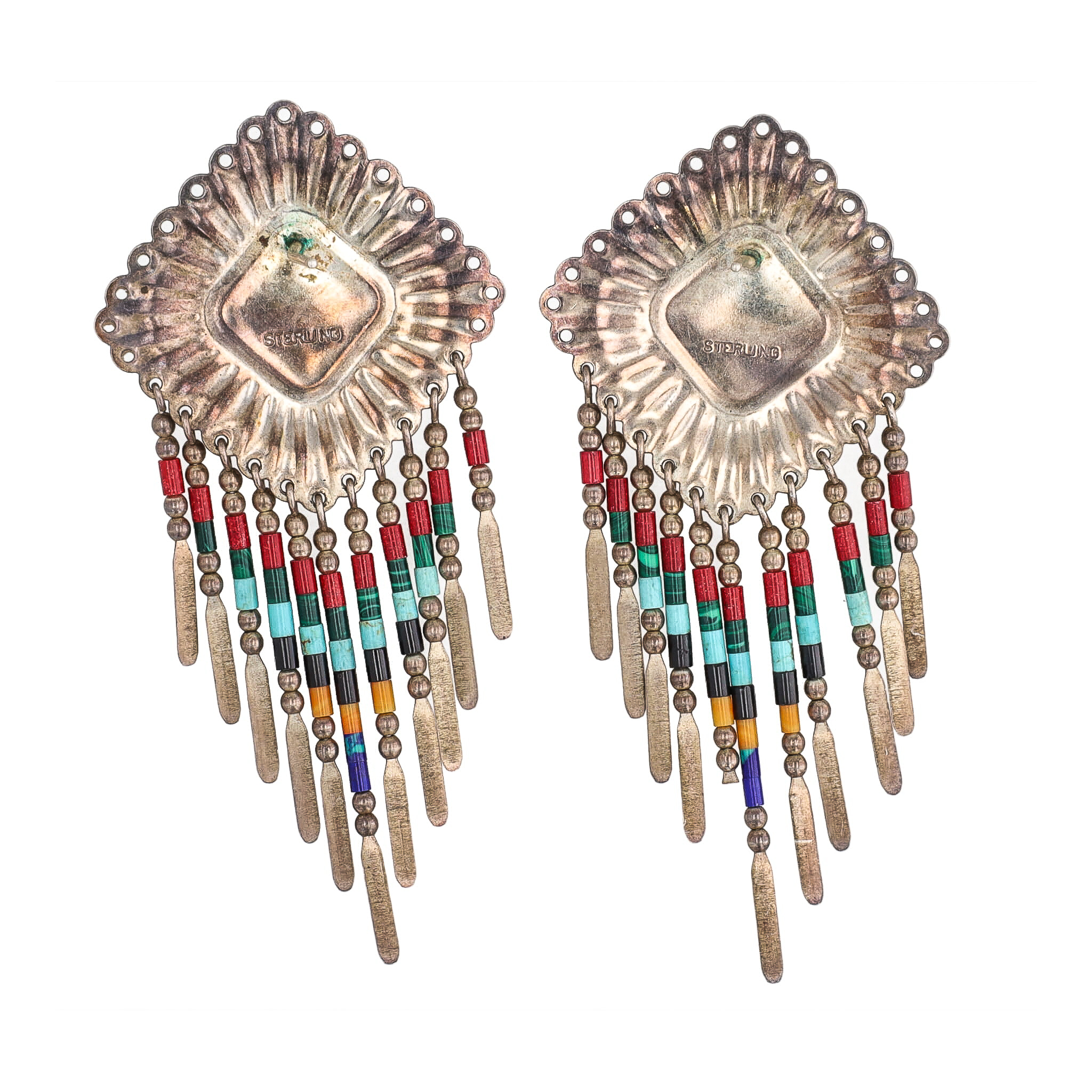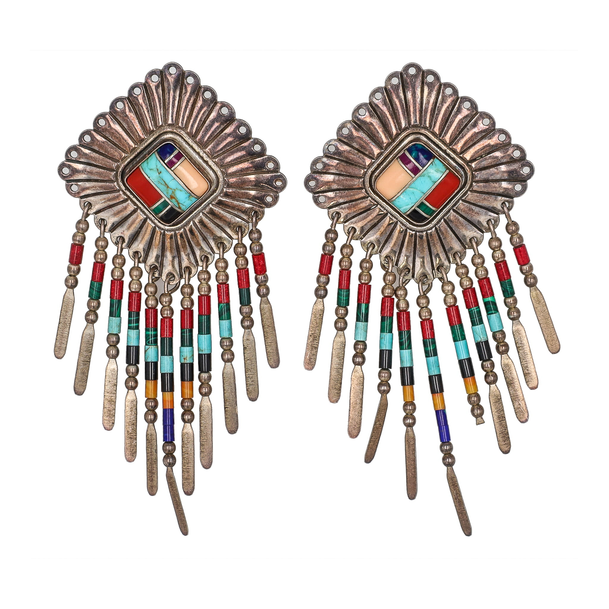 Vintage Navajo Multi Stone Sterling Inlay Earrings 14g-Coral, Turquoise, Spiny Oyster, Purple Spiny Oyster, Malachite, Lapis, Onyx