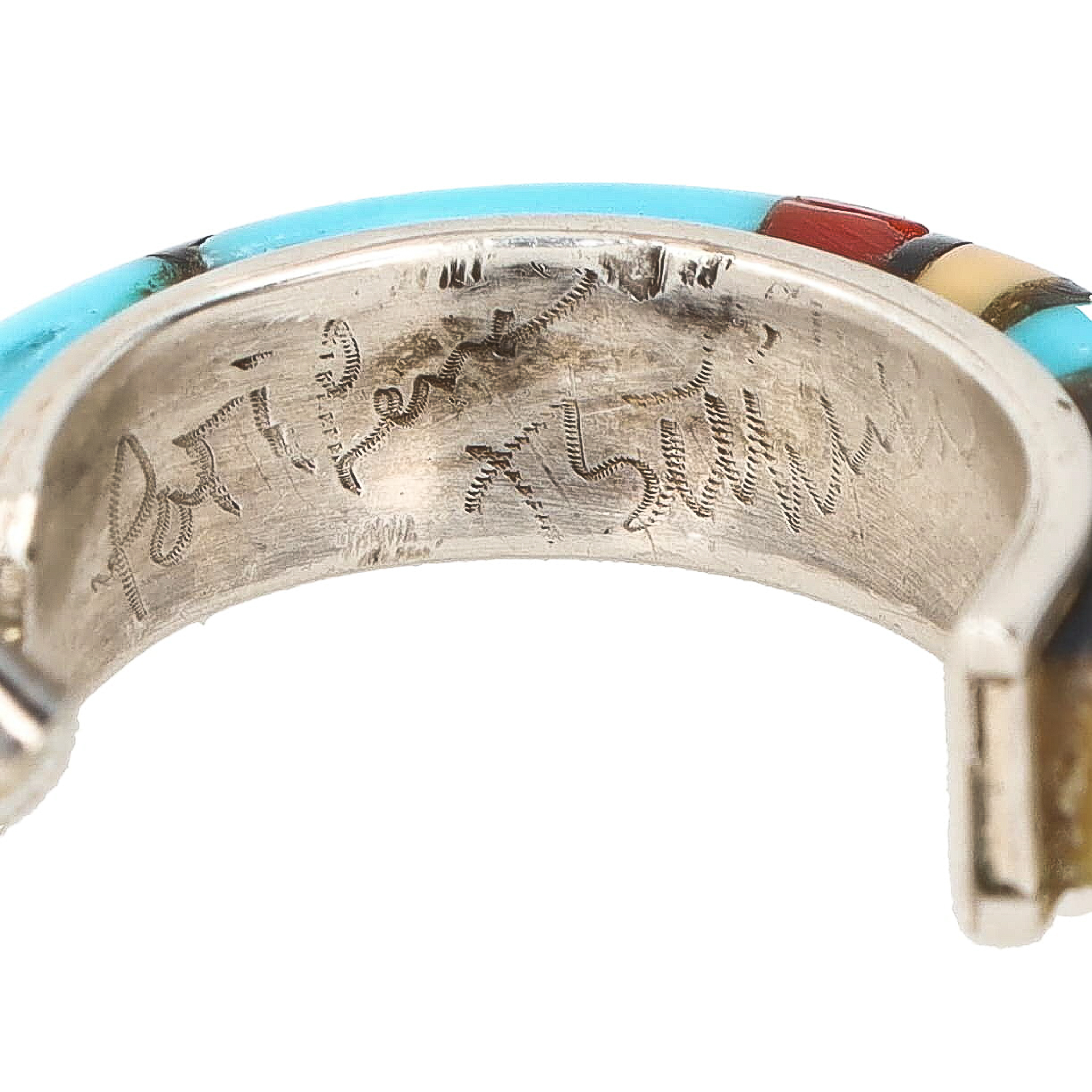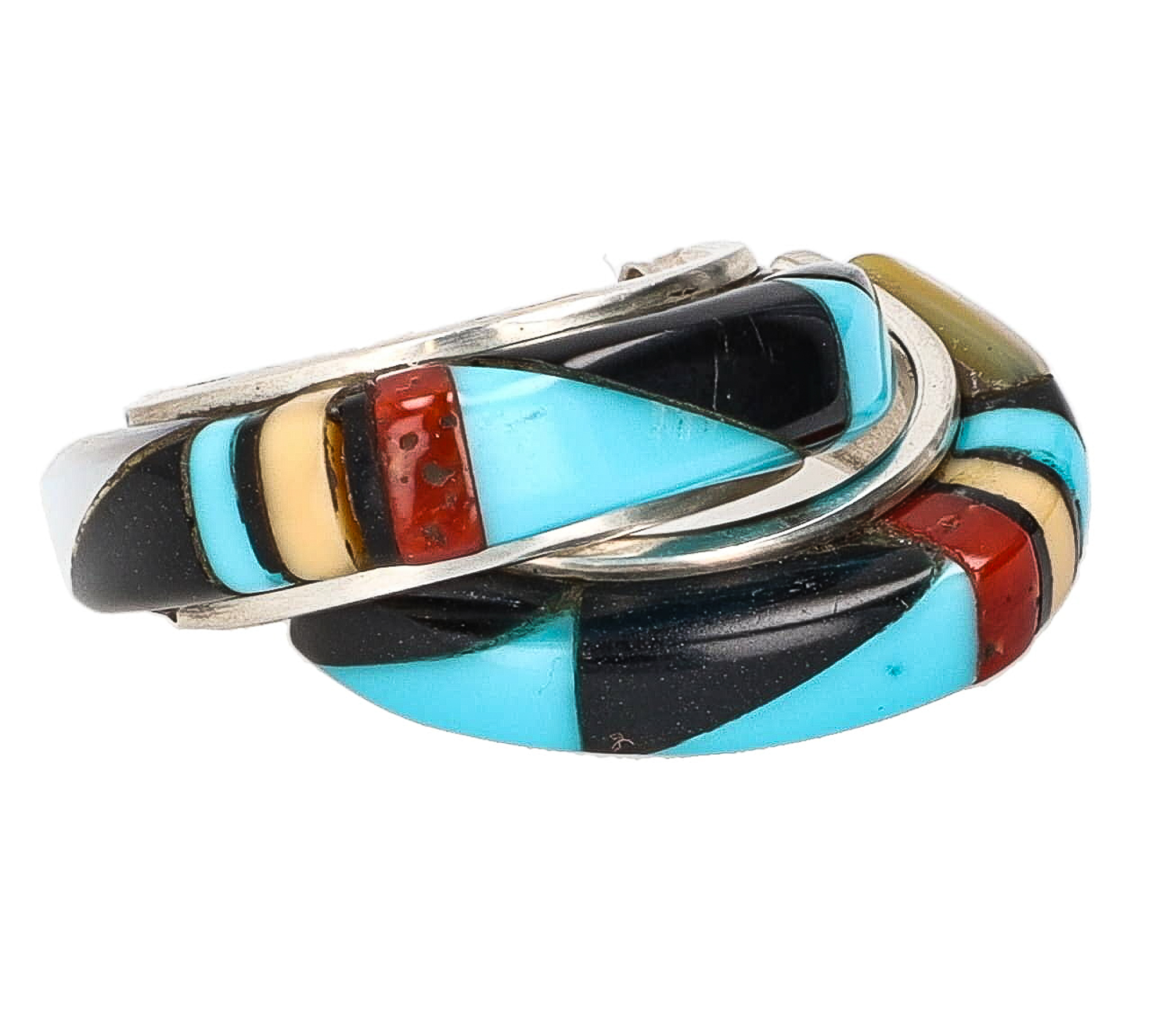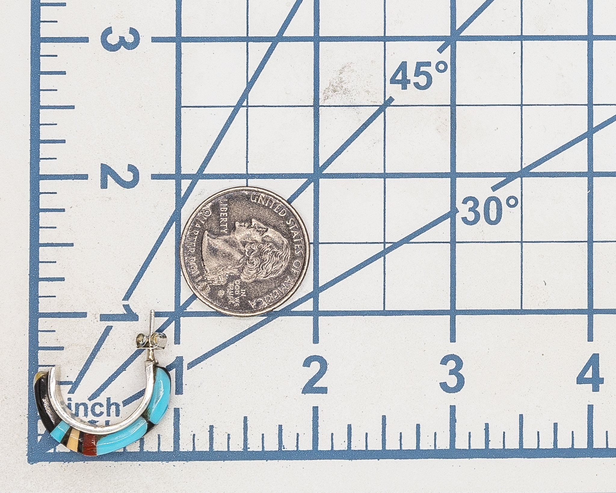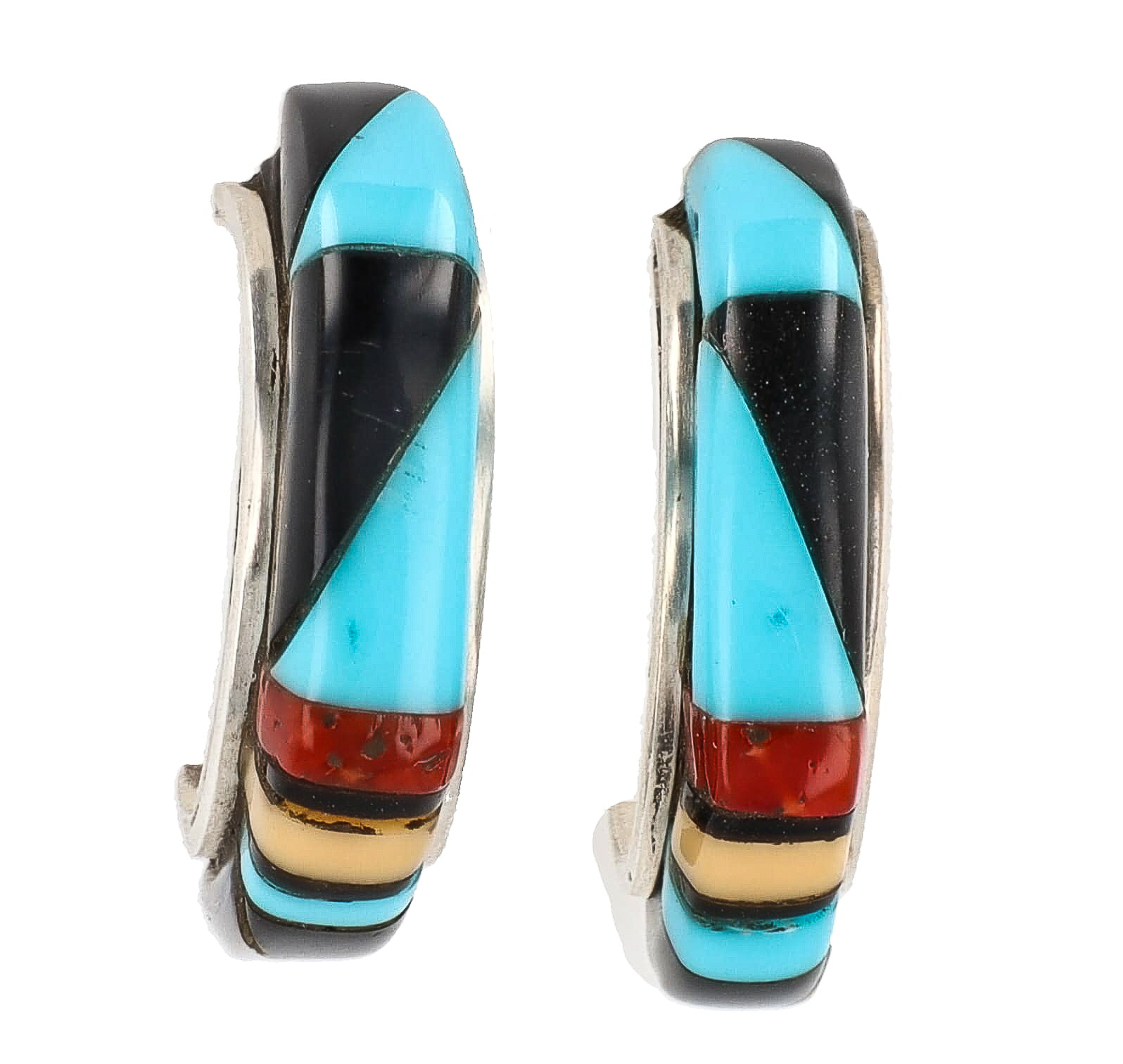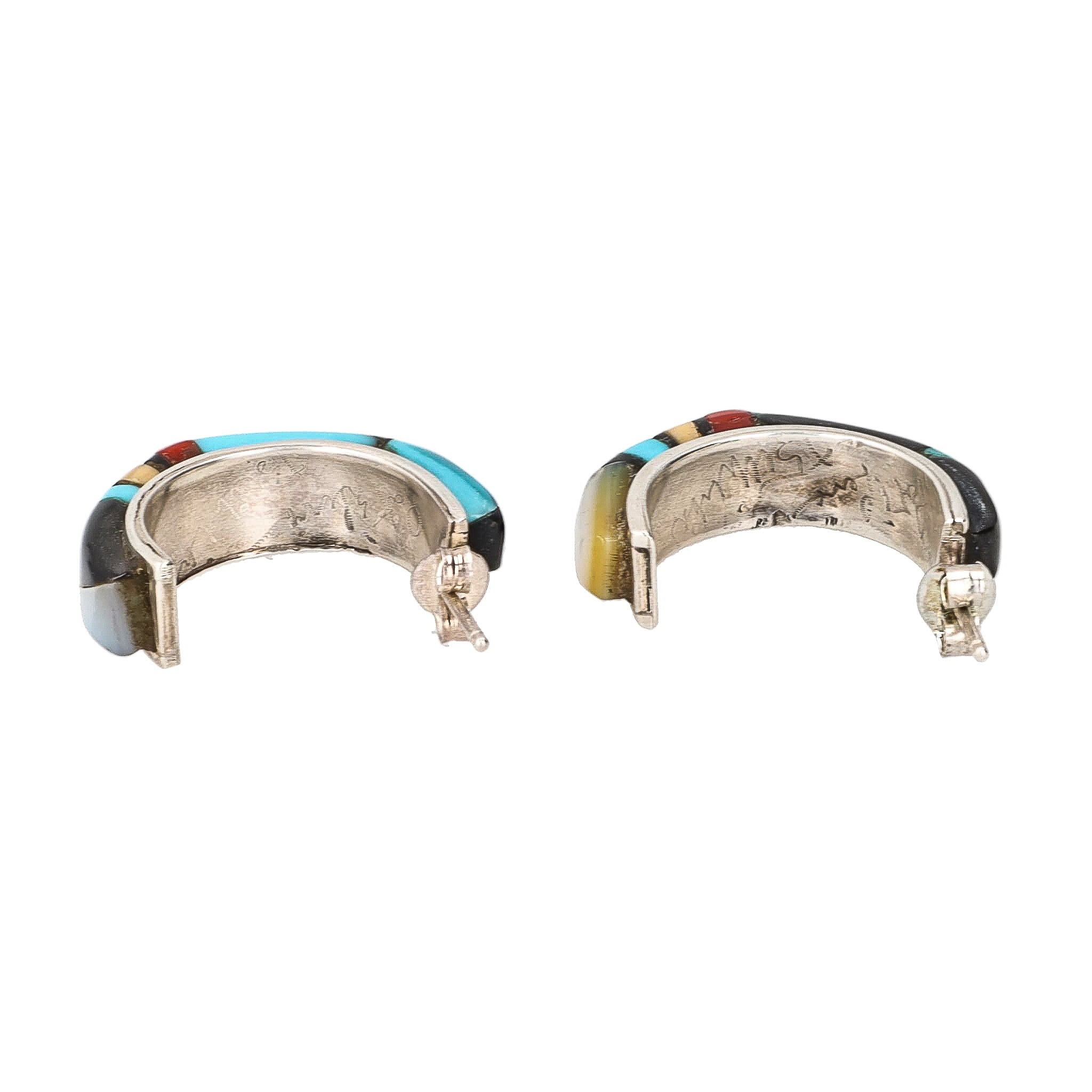 Lena & Pat Tsetulikai Zuni Turquoise Coral Onyx Mother Of Pearl Sterling Inlay Hoop Earrings 6g