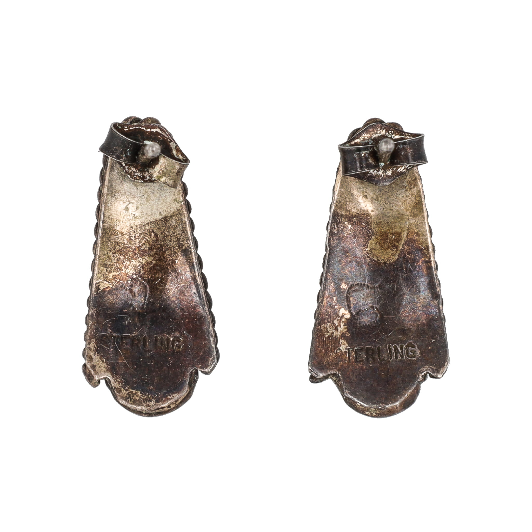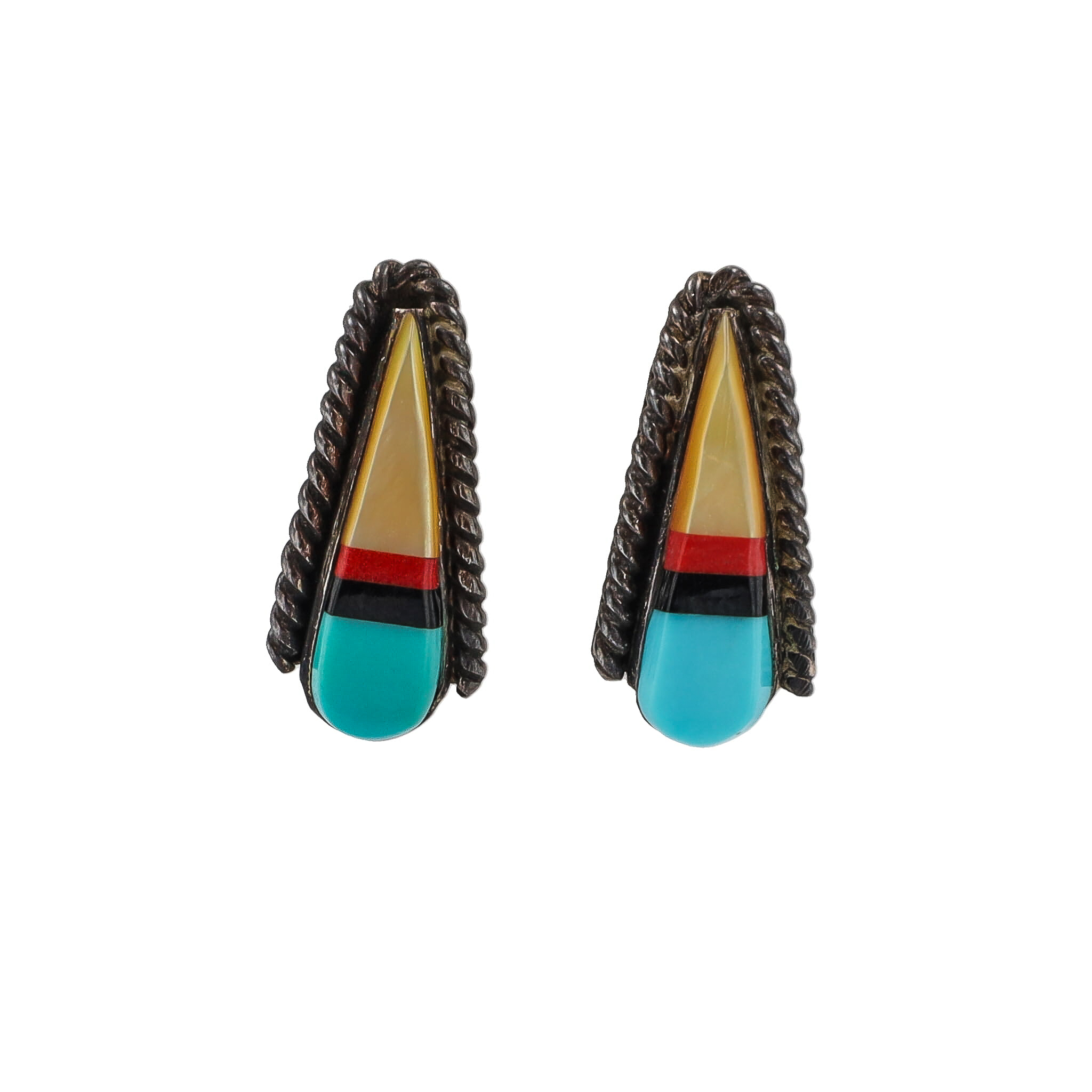 Vintage Zuni Multi Stone Sterling Raised Inlay Earrings 3g-Mother of Pearl, Coral, Onyx, Turquoise